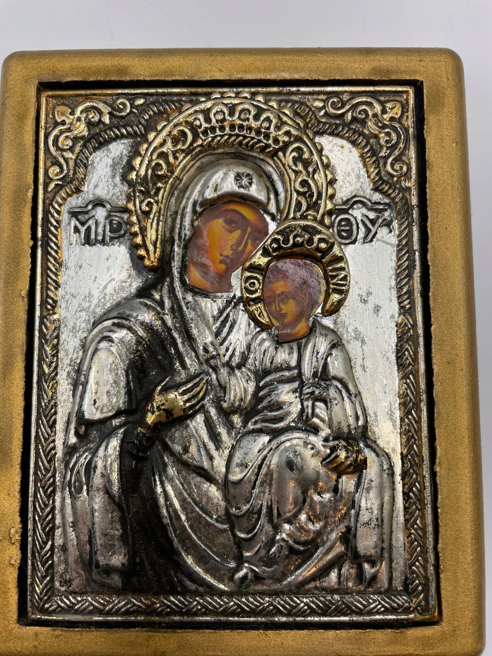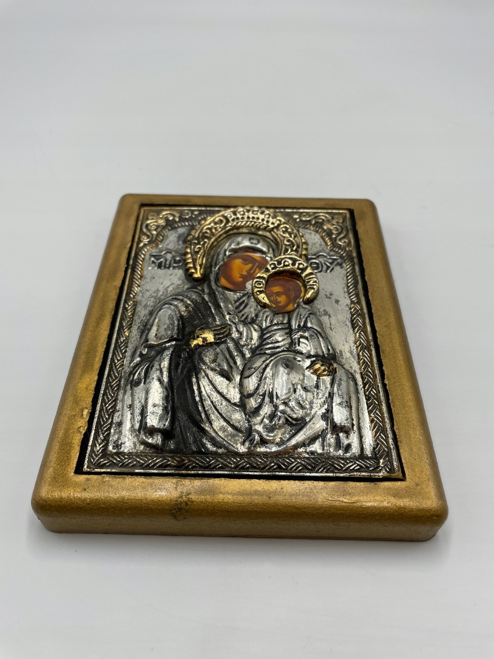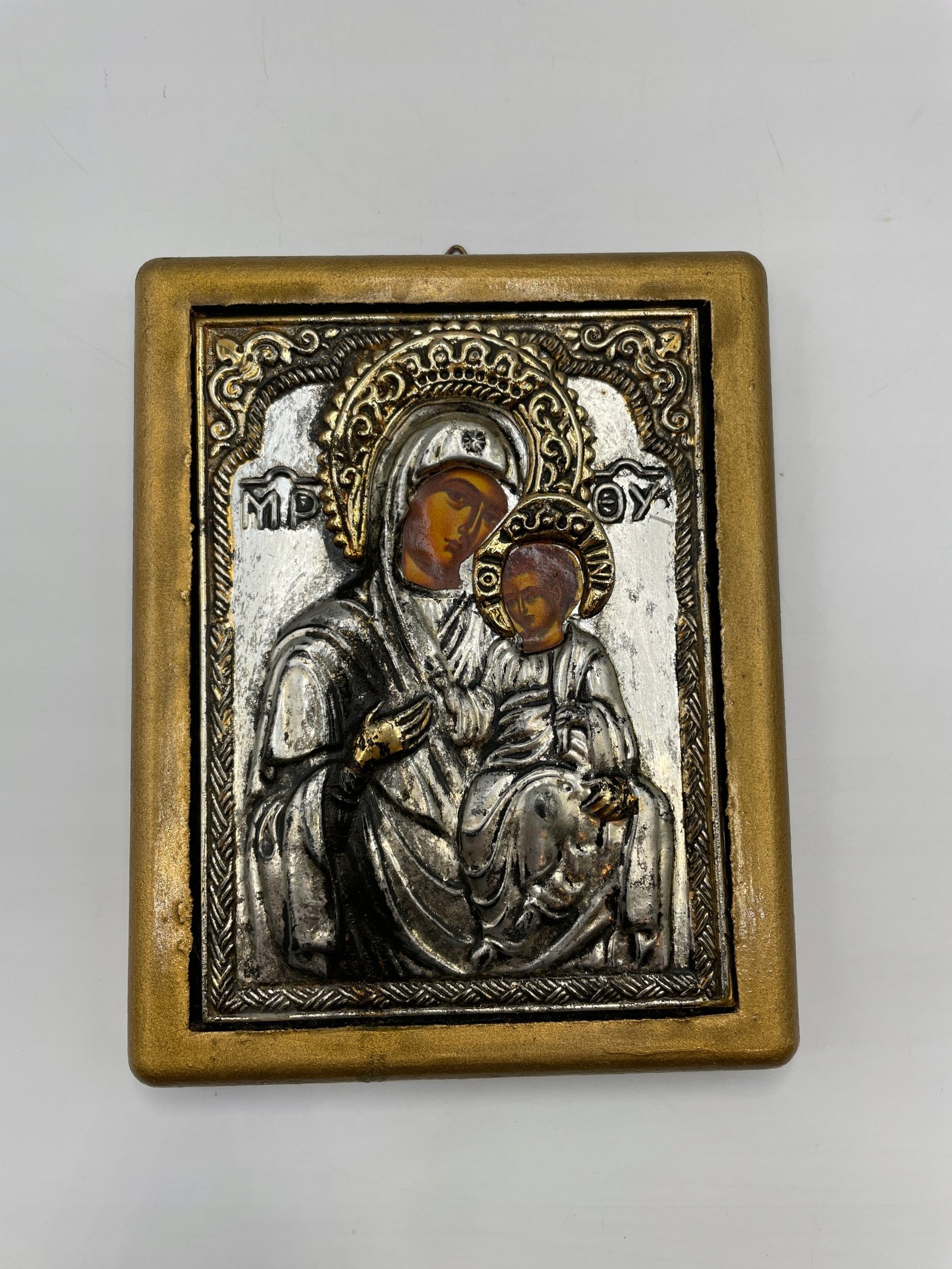 Piękna ikona przedstawiająca Matkę Bożą z Dzieciątkiem, wykonana w technice metaloplastyki na drewnianym podłożu. Twarze Maryi i Jezusa zostały ręcznie malowane, natomiast całość otoczona jest srebrno-złotą ryciną z bogatymi zdobieniami.