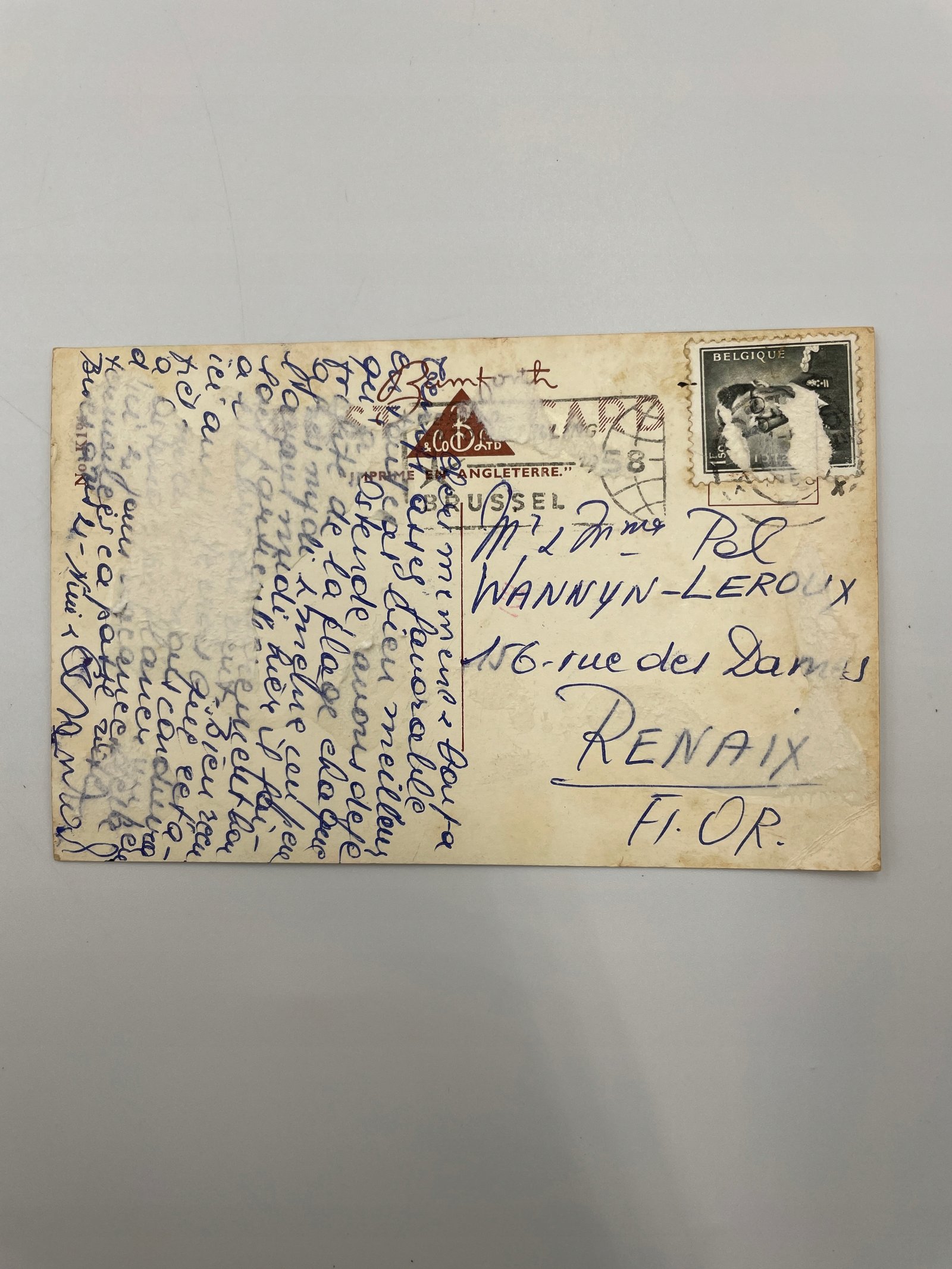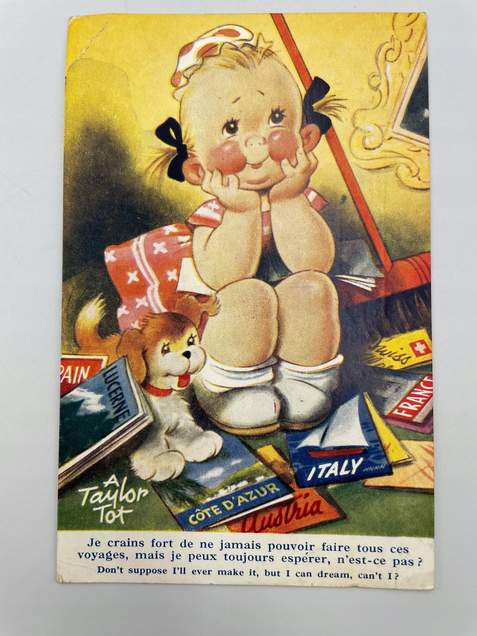 Kartka Anglia 1958 dziewczynka i szczeniak marzą o podróżach Taylor Tot