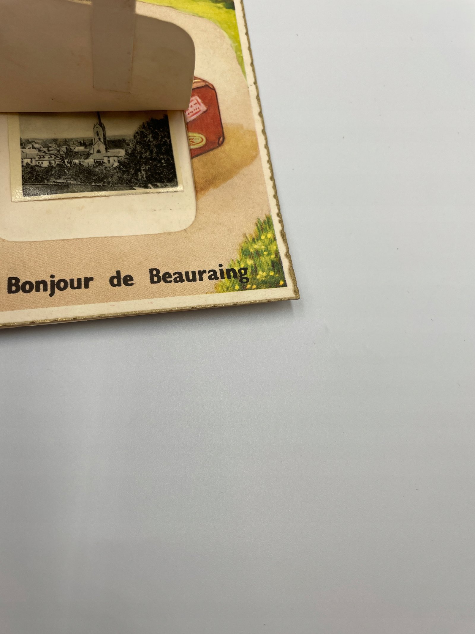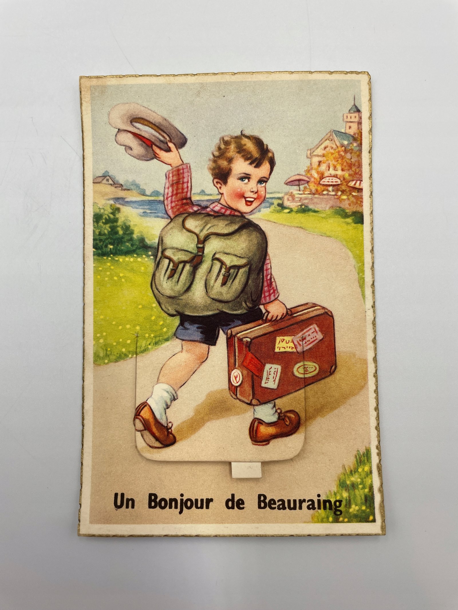 Kartka Belgia 1930 chłopiec z walizką Beaurain z ruchomym elementem
