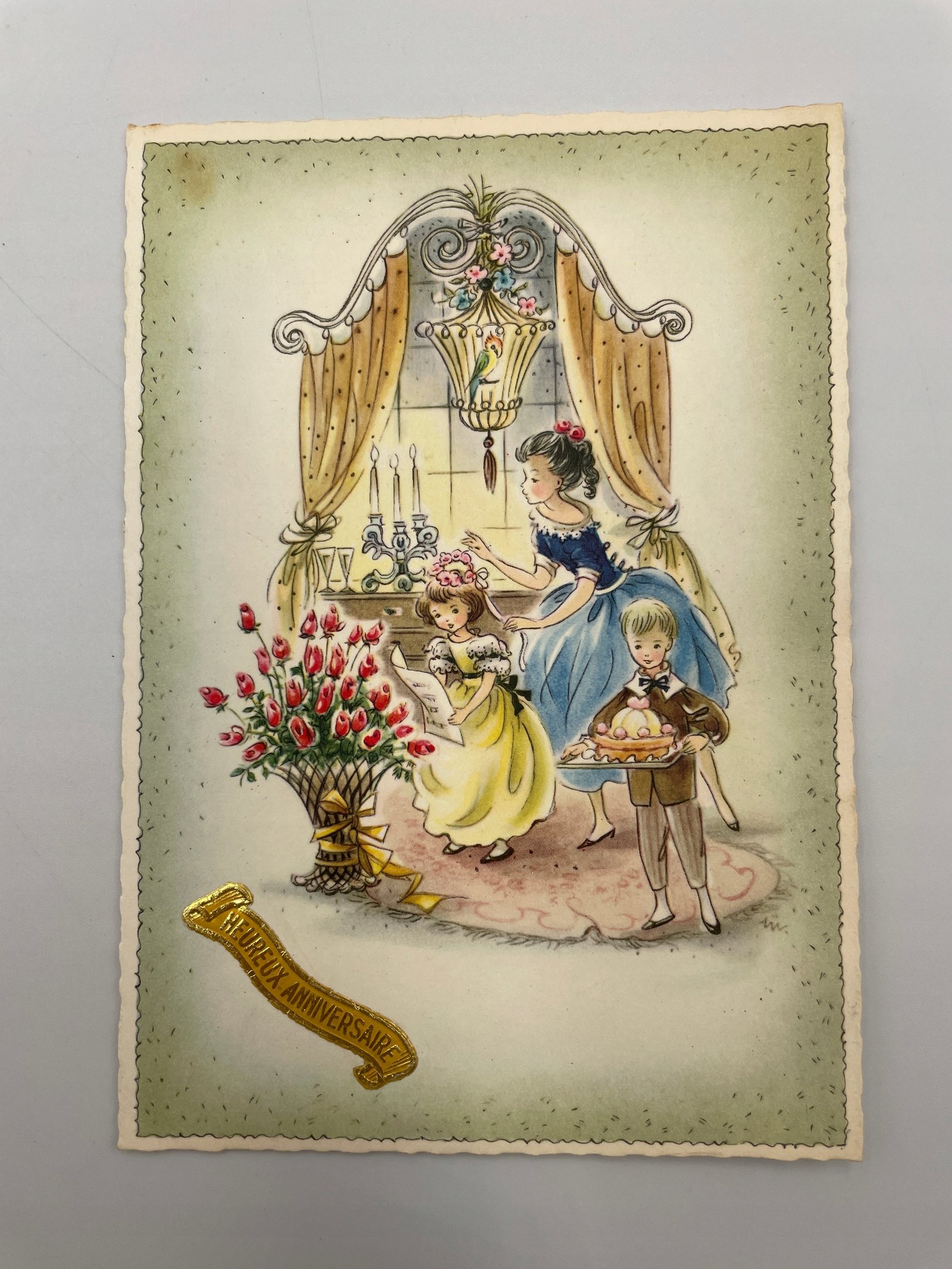 Kartka Belgia 1950s dzieci przy oknie tort i kwiaty J.B. Special