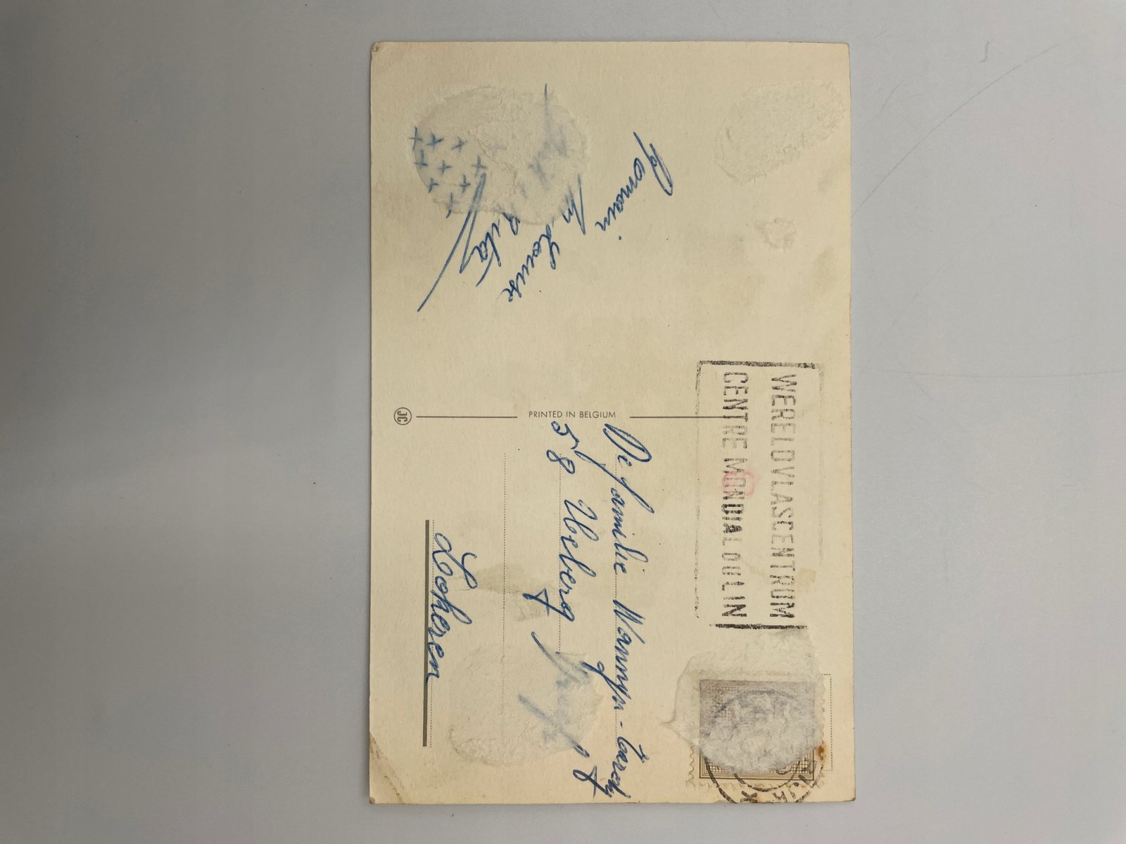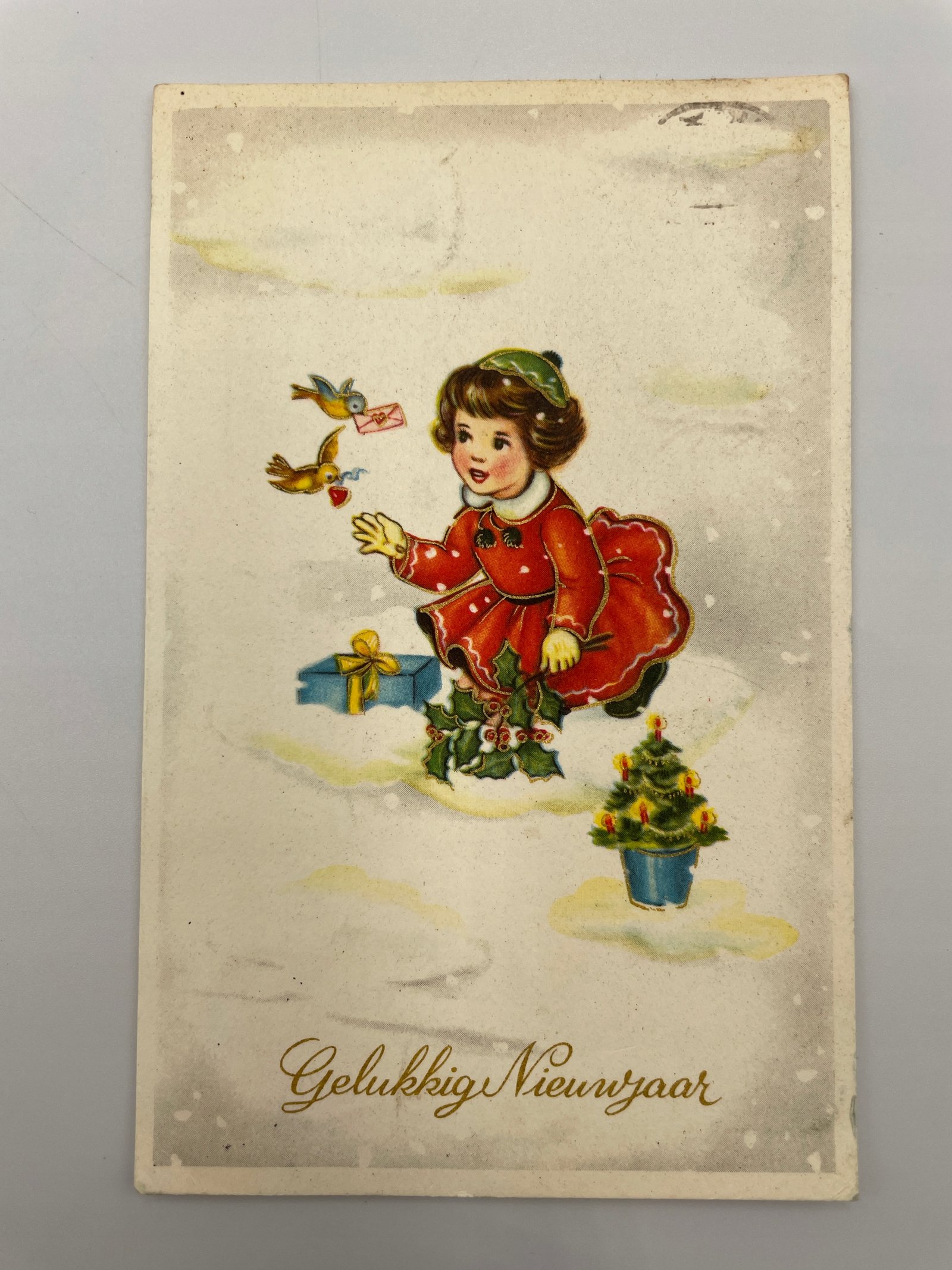Kartka Belgia 1960 Gelukkige Nieuwjaar dziewczynka z prezentami i ptaszkami