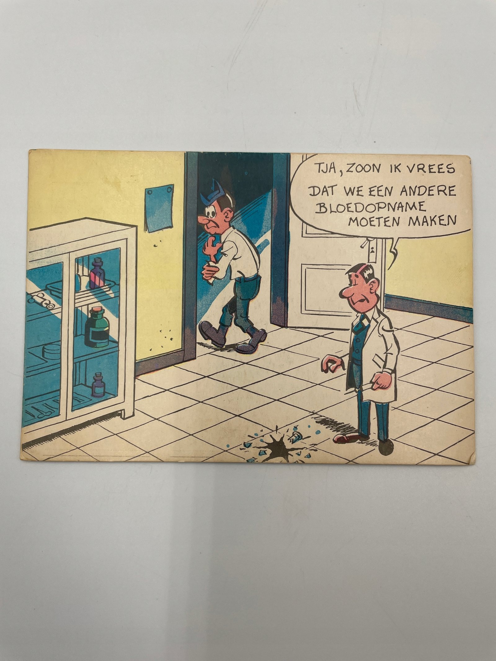 Kartka pocztowa Belgia 1960s humor lekarz laboratorium krew komiks