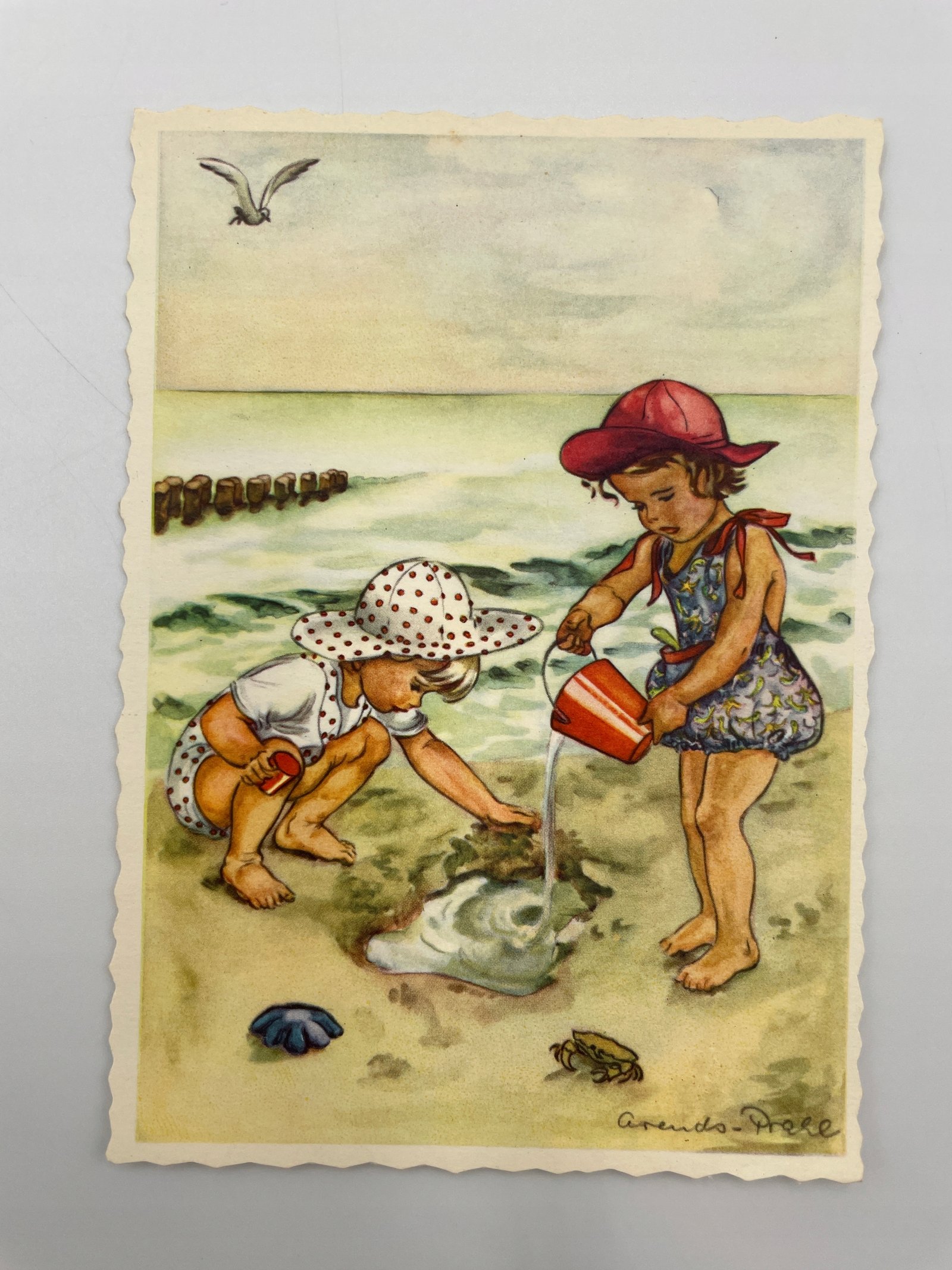 Kartka pocztowa Niemcy 1950s dzieci na plaży ilustracja Arends Prell