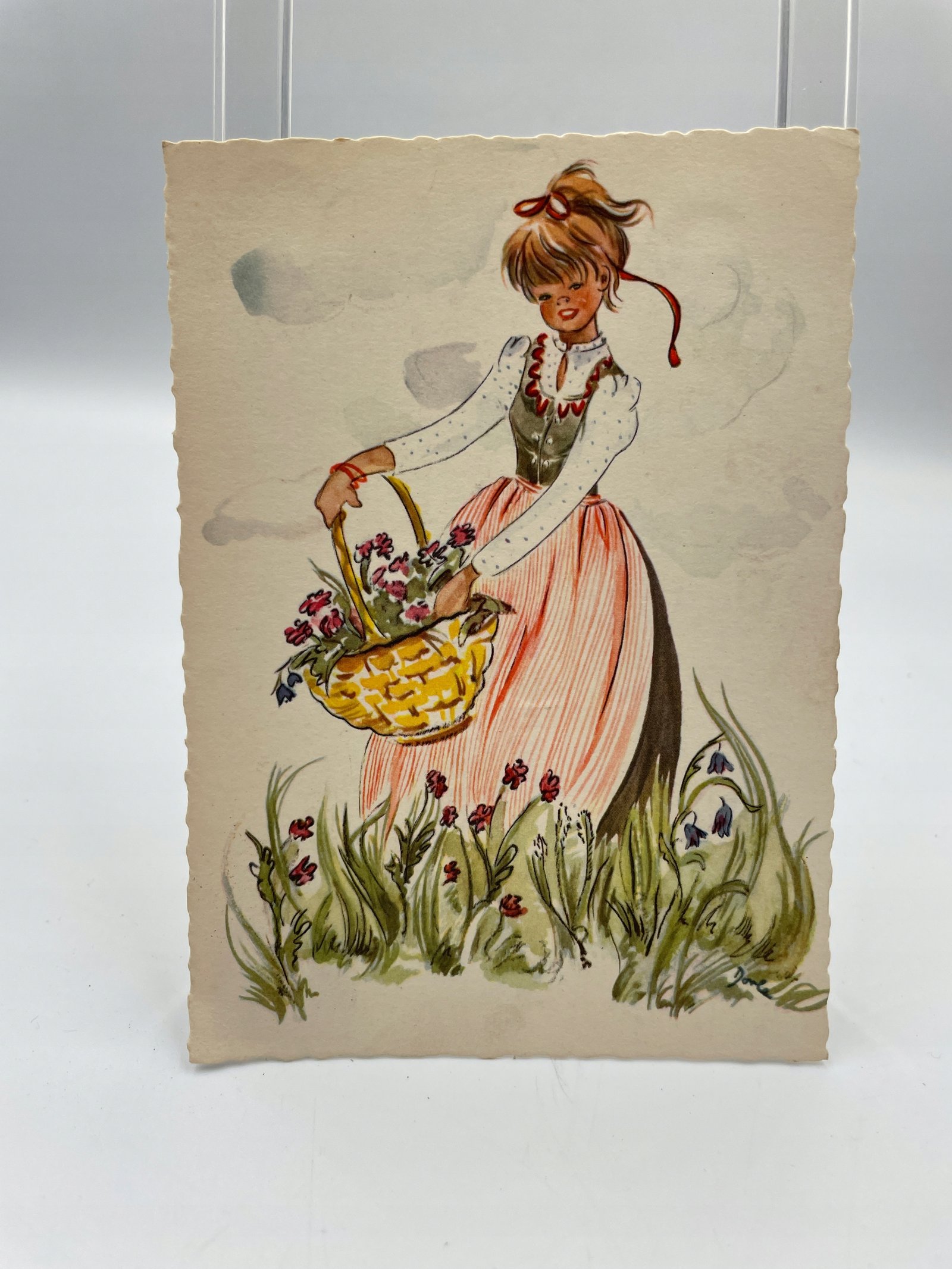 Kartka pocztowa Niemcy 1960s dziewczyna z koszykiem kwiatów ilustracja ręczna