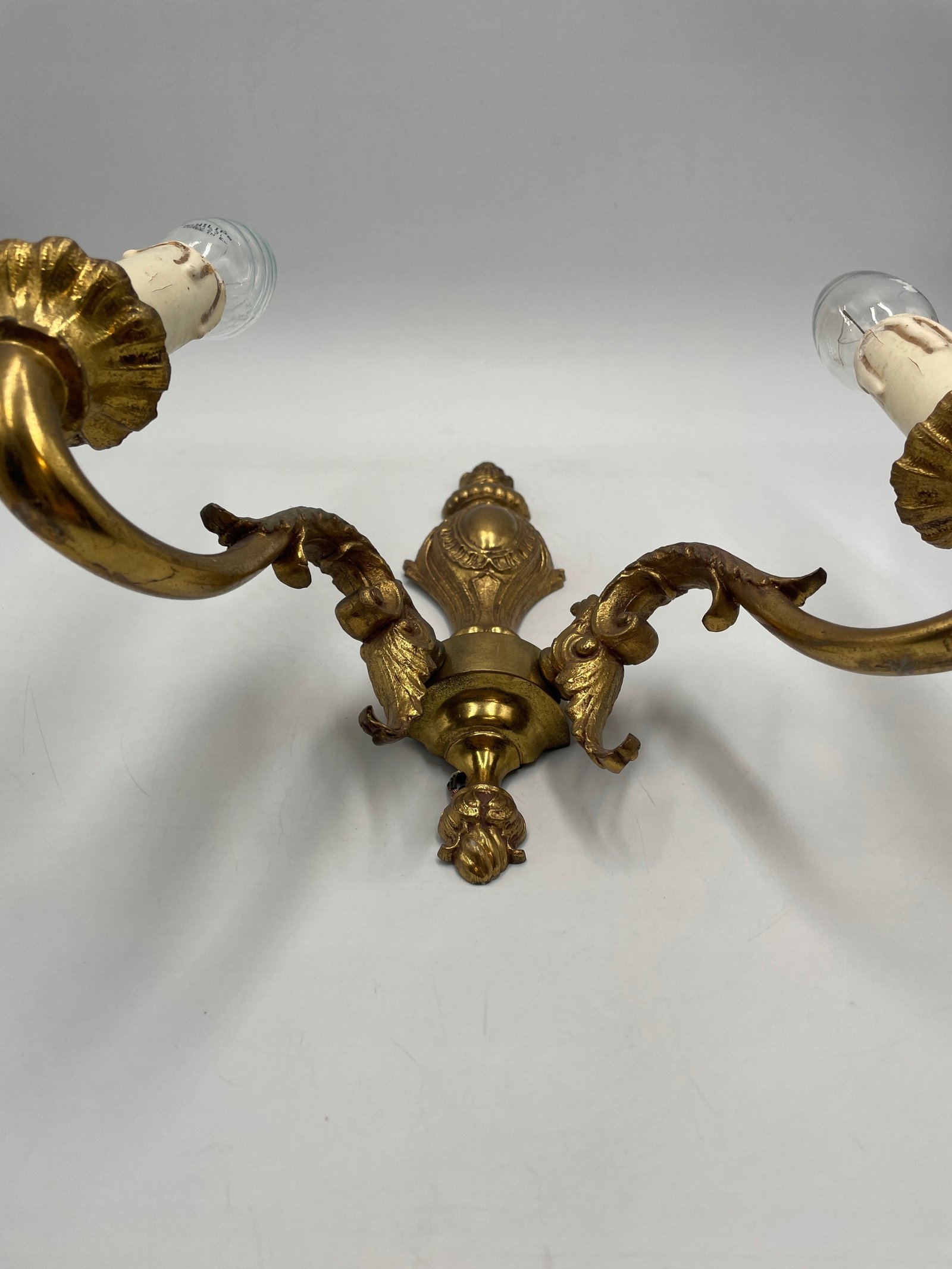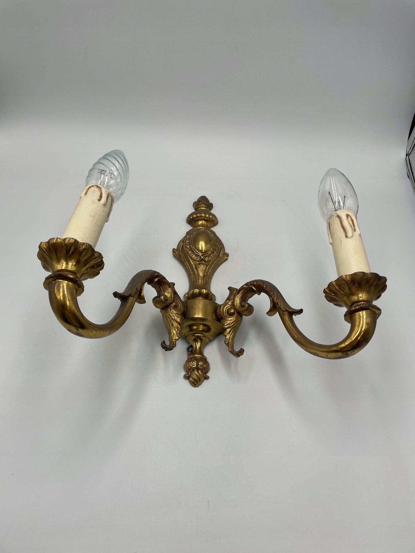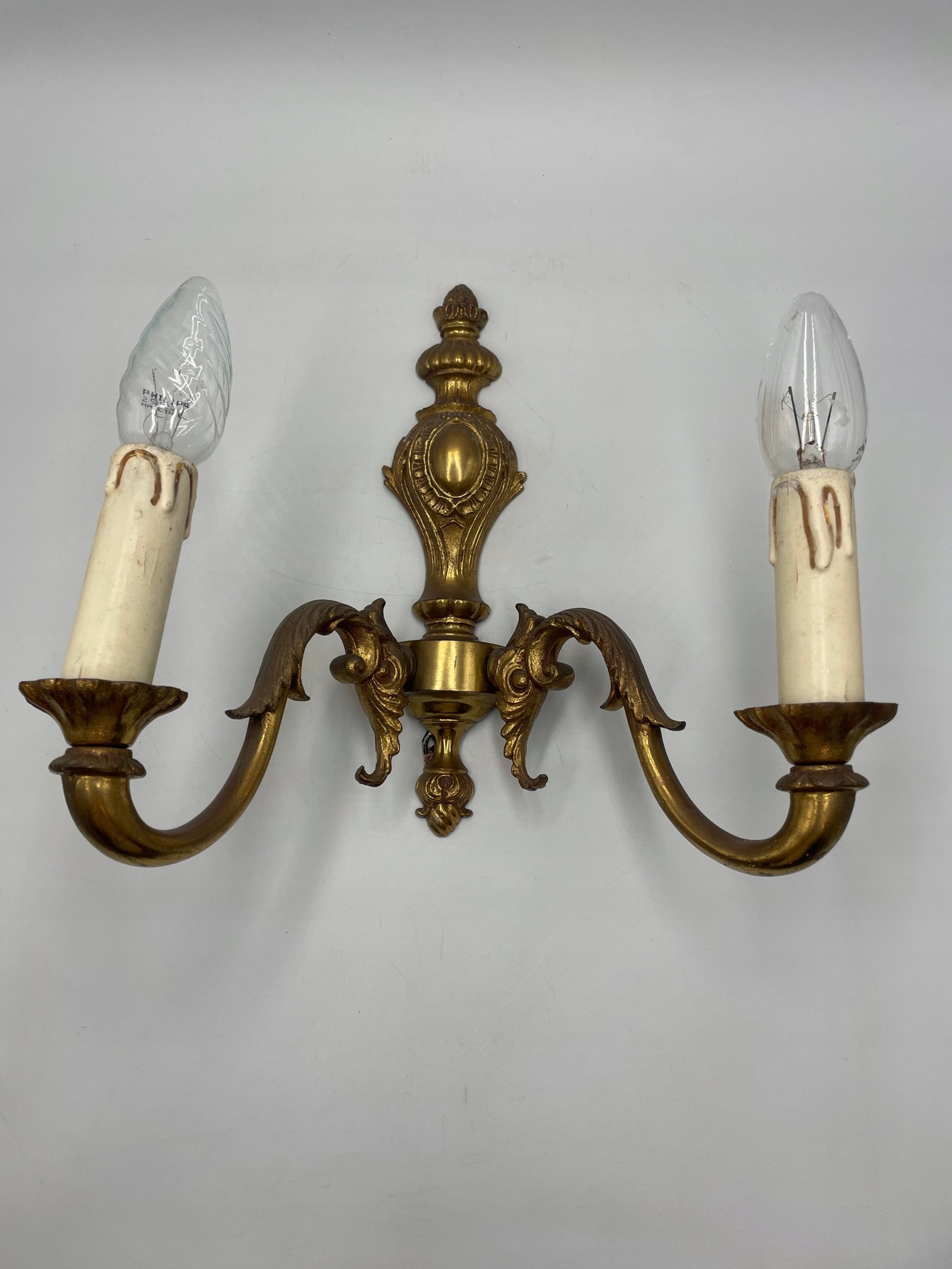 Klasyczny kinkiet ścienny, dwuramienny, wykonany z metalu w kolorze starego złota, stylizowany na świecznik. Dekoracyjne elementy roślinne i ornamenty nawiązujące do stylu barokowego. Posiada dwa punkty świetlne imitujące świeczki. Wykonany z metalu w kolorze złocistego brązu. Wymiary: wysokość 27 cm, szerokość 26 cm. Przeznaczony do montażu na ścianie.