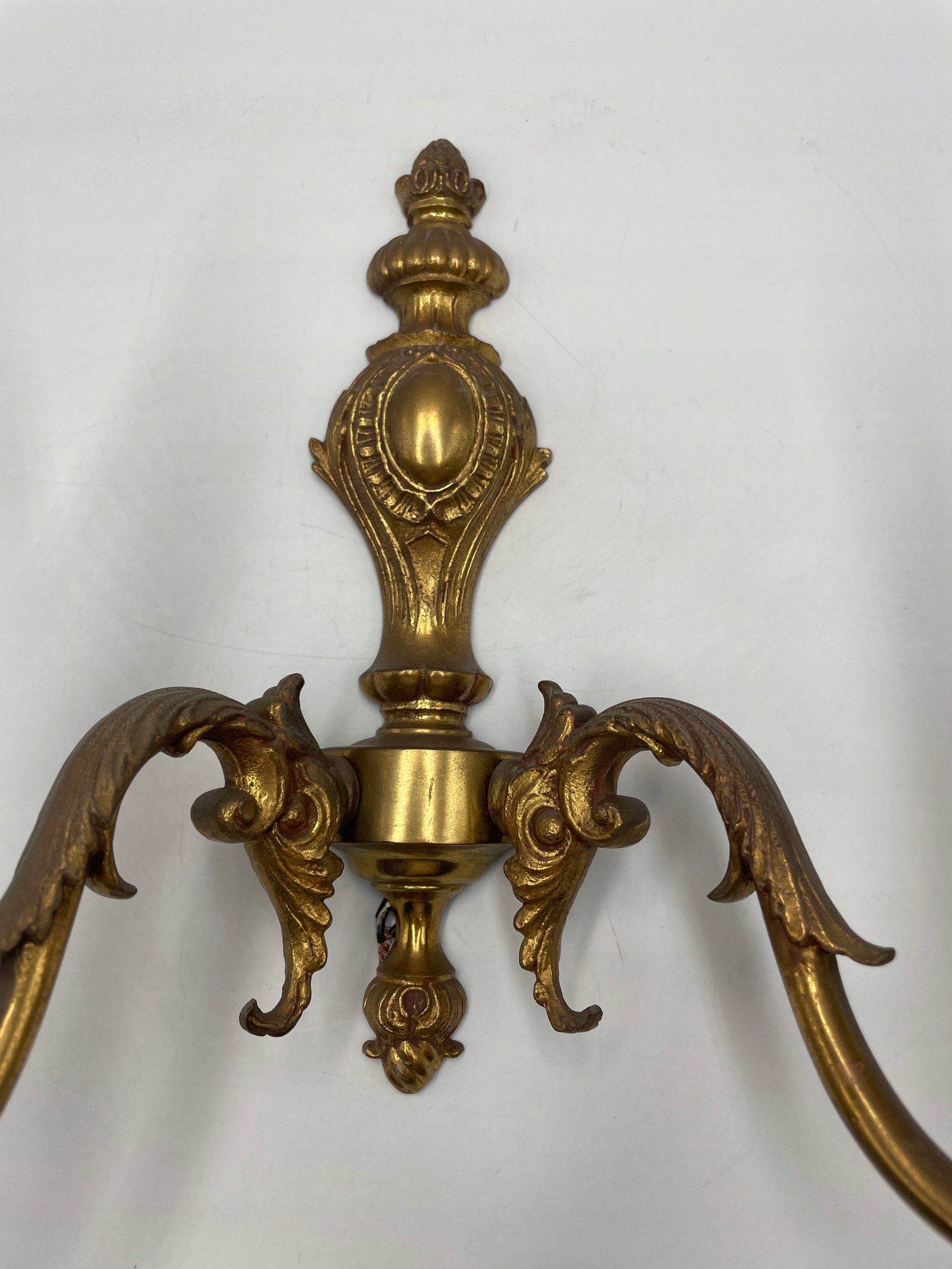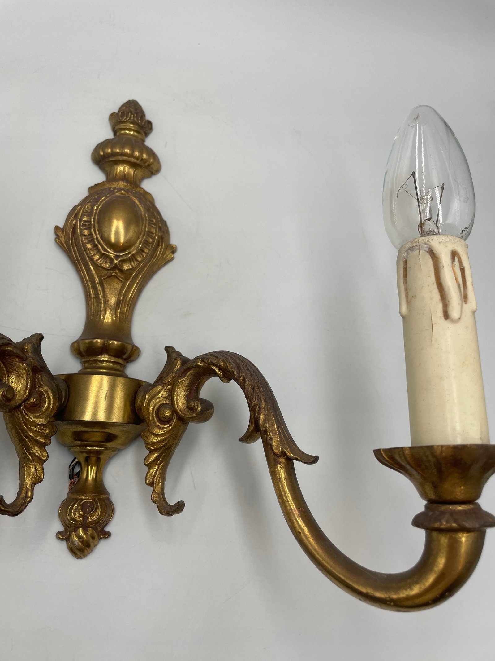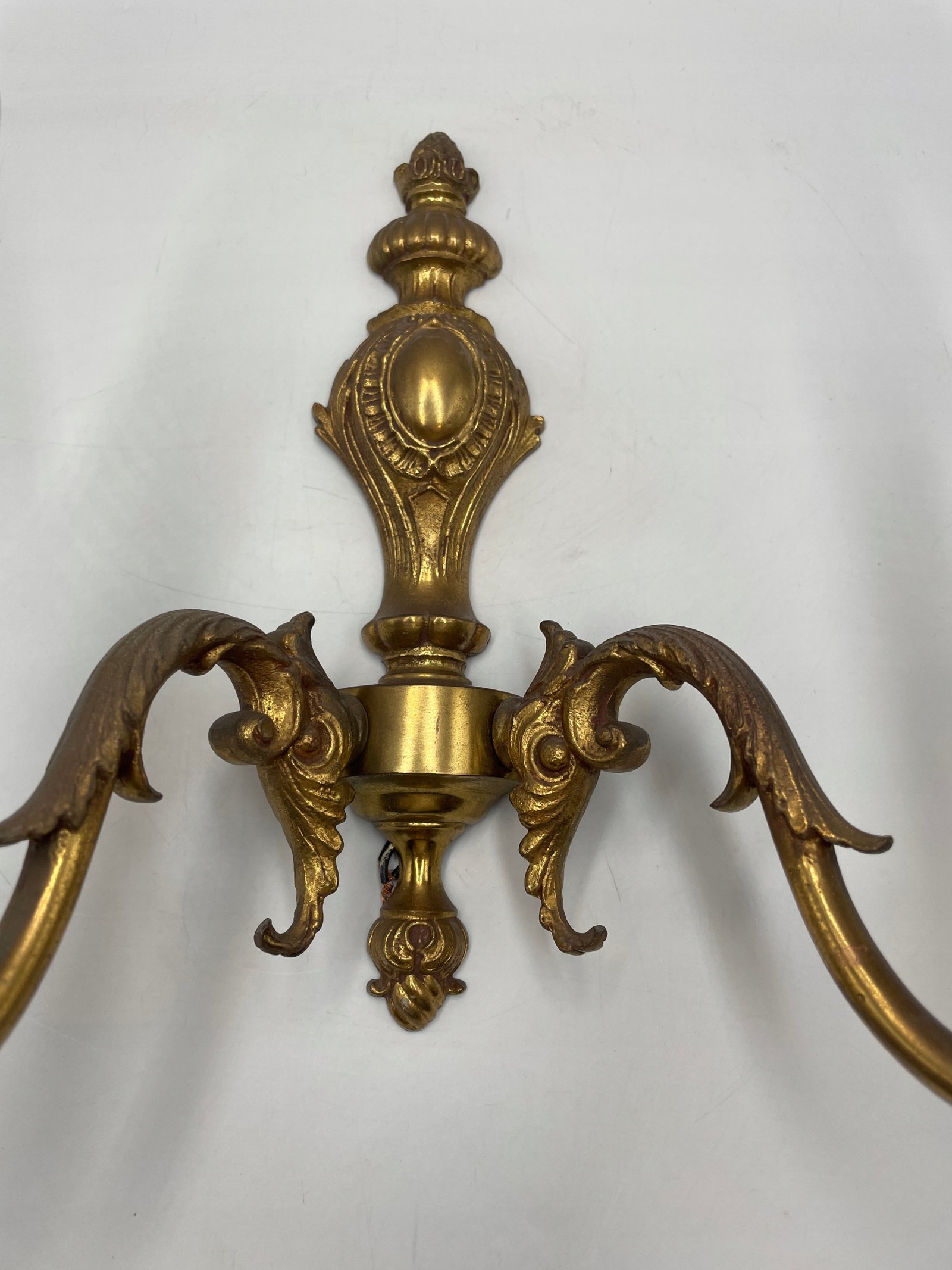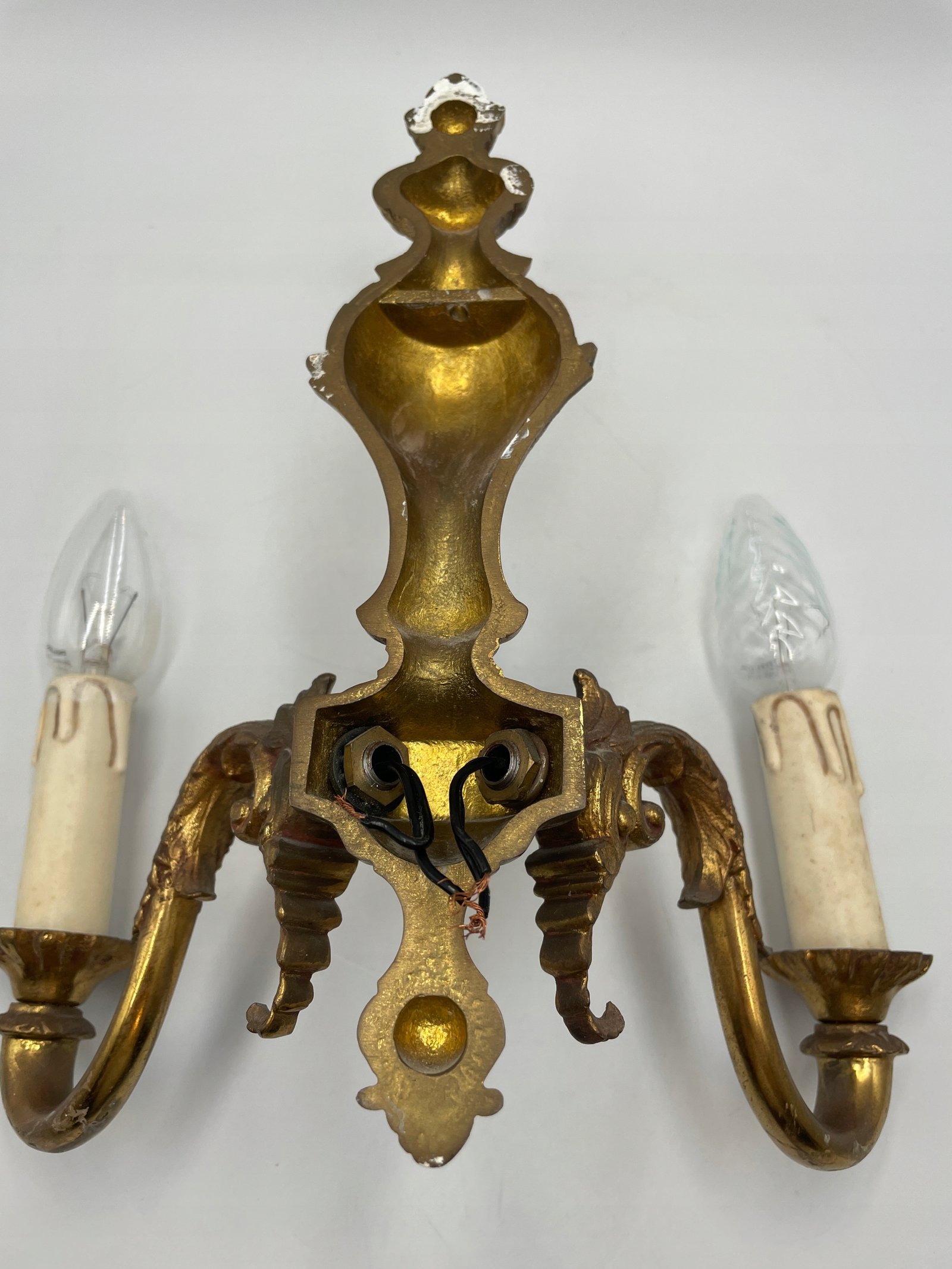 Klasyczny kinkiet ścienny, dwuramienny, wykonany z metalu w kolorze starego złota, stylizowany na świecznik. Dekoracyjne elementy roślinne i ornamenty nawiązujące do stylu barokowego. Posiada dwa punkty świetlne imitujące świeczki. Wykonany z metalu w kolorze złocistego brązu. Wymiary: wysokość 27 cm, szerokość 26 cm. Przeznaczony do montażu na ścianie.