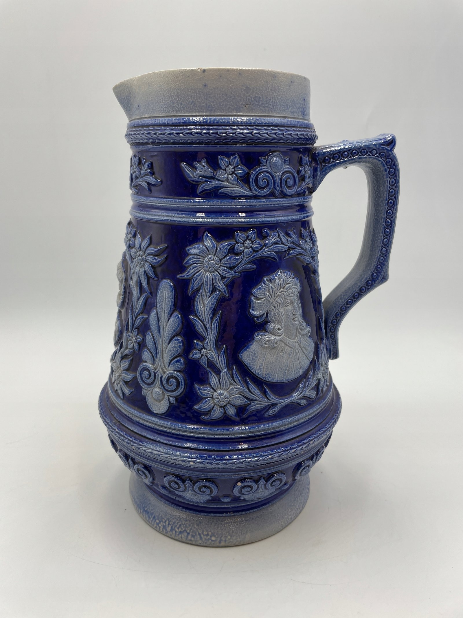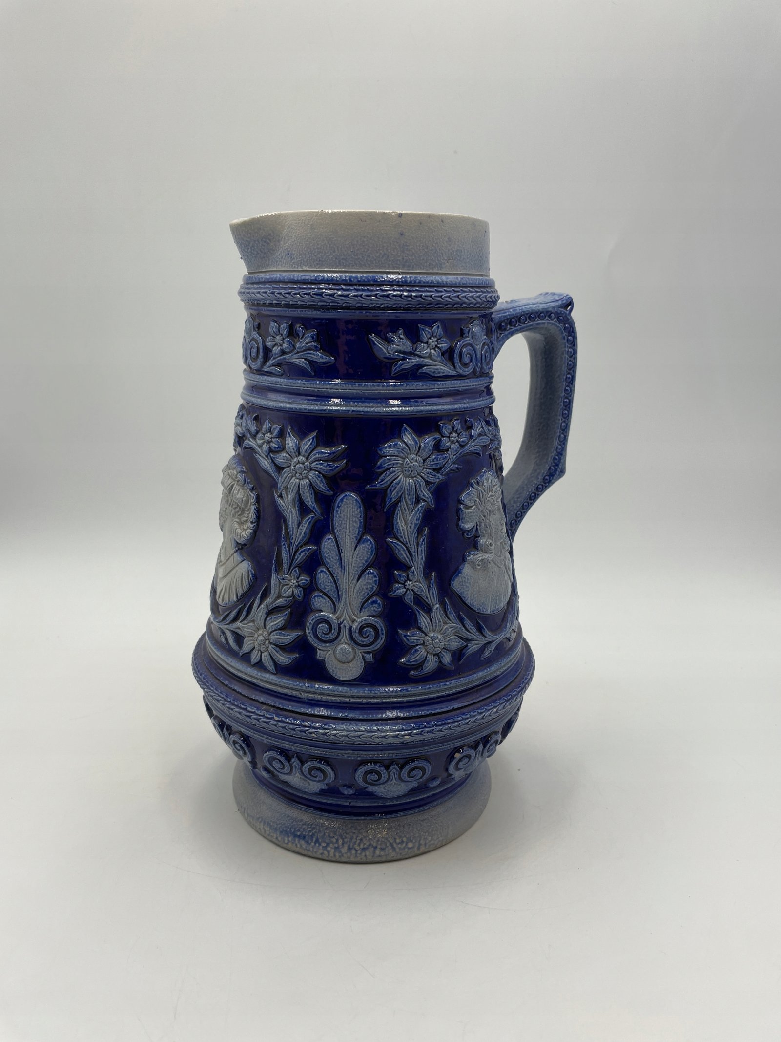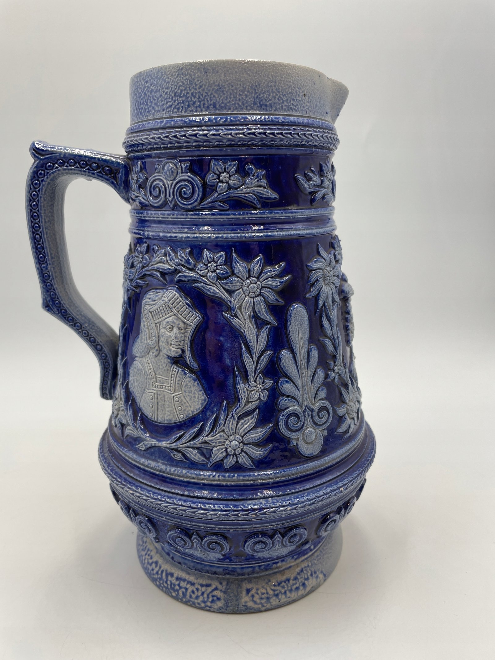 Dekoracja dzbanka obejmuje reliefowe portrety, otoczone bogatymi kwiatowymi wzorami. Wzory są precyzyjnie wykonane, co nadaje naczyniu historyczny i elegancki wygląd. Styl dekoracji nawiązuje do tradycji europejskiej sztuki użytkowej, szczególnie tej z Niemiec.
