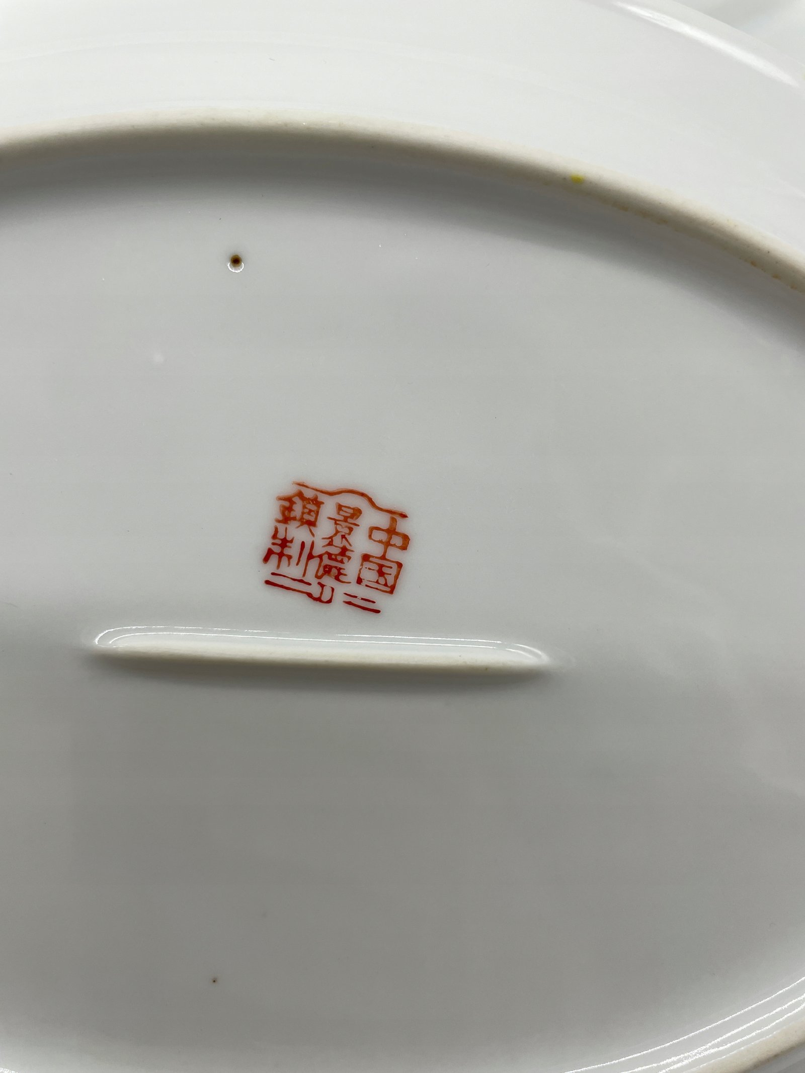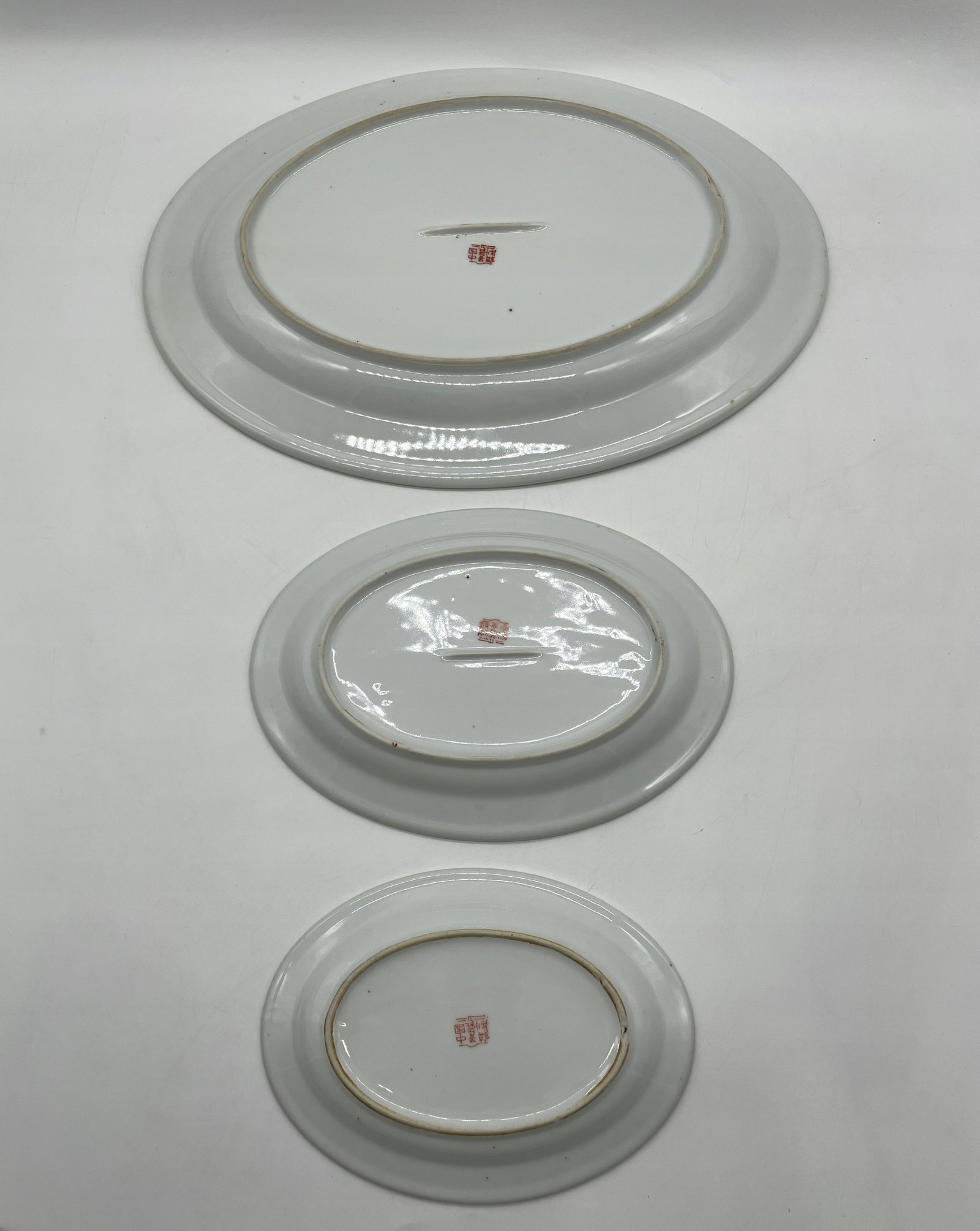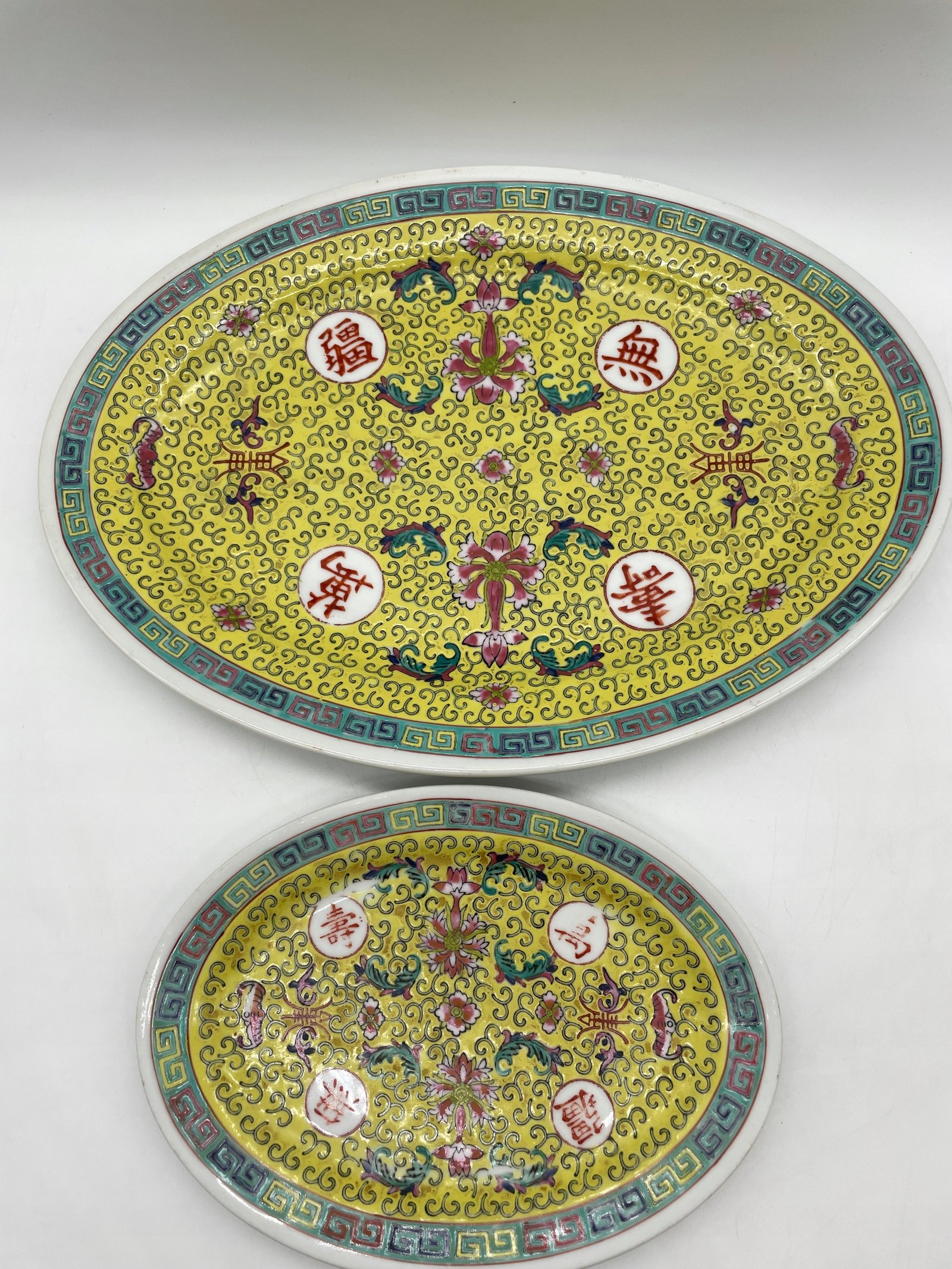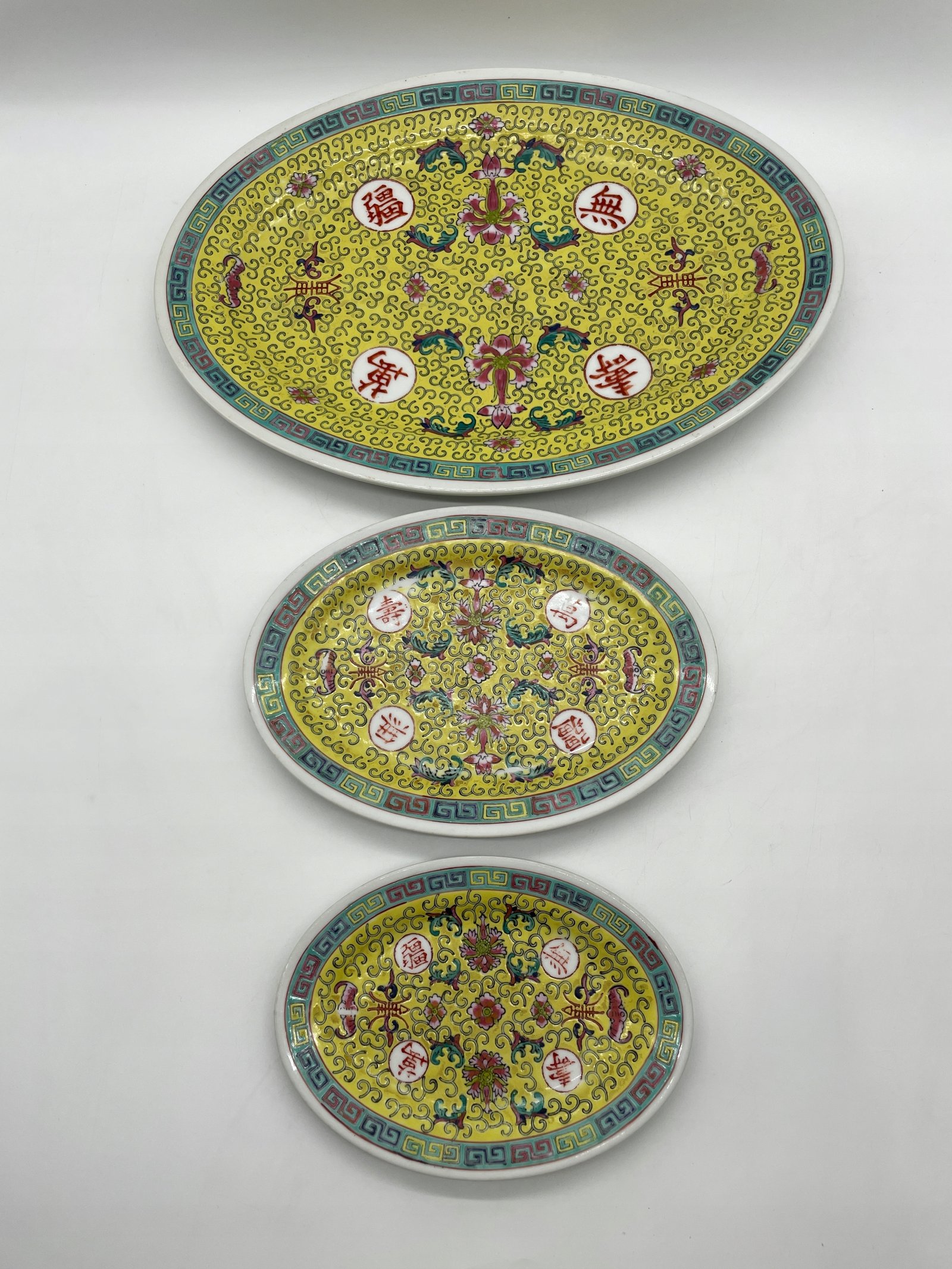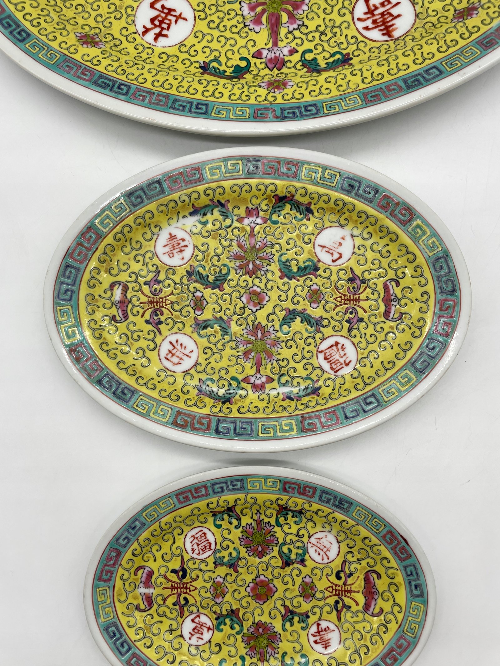 Komplet trzech chińskich porcelanowych talerzy z intensywnie żółtym tłem i wielobarwnym zdobieniem. Dekor przedstawia tradycyjne chińskie symbole i znaki w okrągłych medalionach. Ornamentyka utrzymana w stylu orientalnym z elementami różu, turkusu, błękitu i czerwieni. Na odwrocie widoczna czerwona pieczęć producenta. Wymiary: 20×15×2 cm, 26×19×2,5 cm, 41×30×4,5 cm.