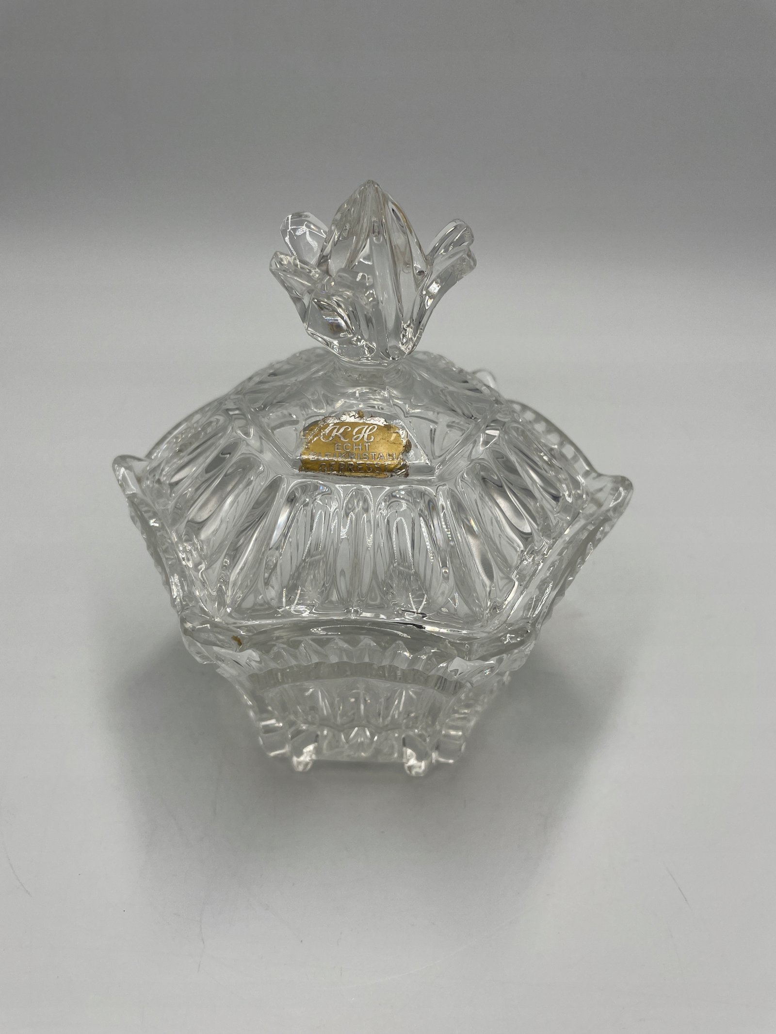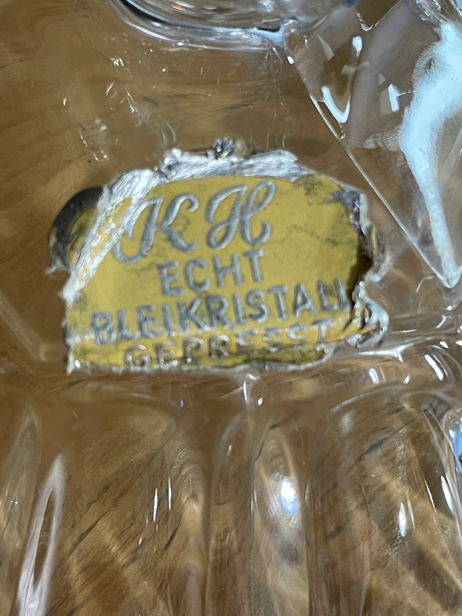 Zachowana oryginalna etykieta producenta – „K&H Echt Bleikristall Gepresst”, co oznacza autentyczne szkło kryształowe z dodatkiem ołowiu.