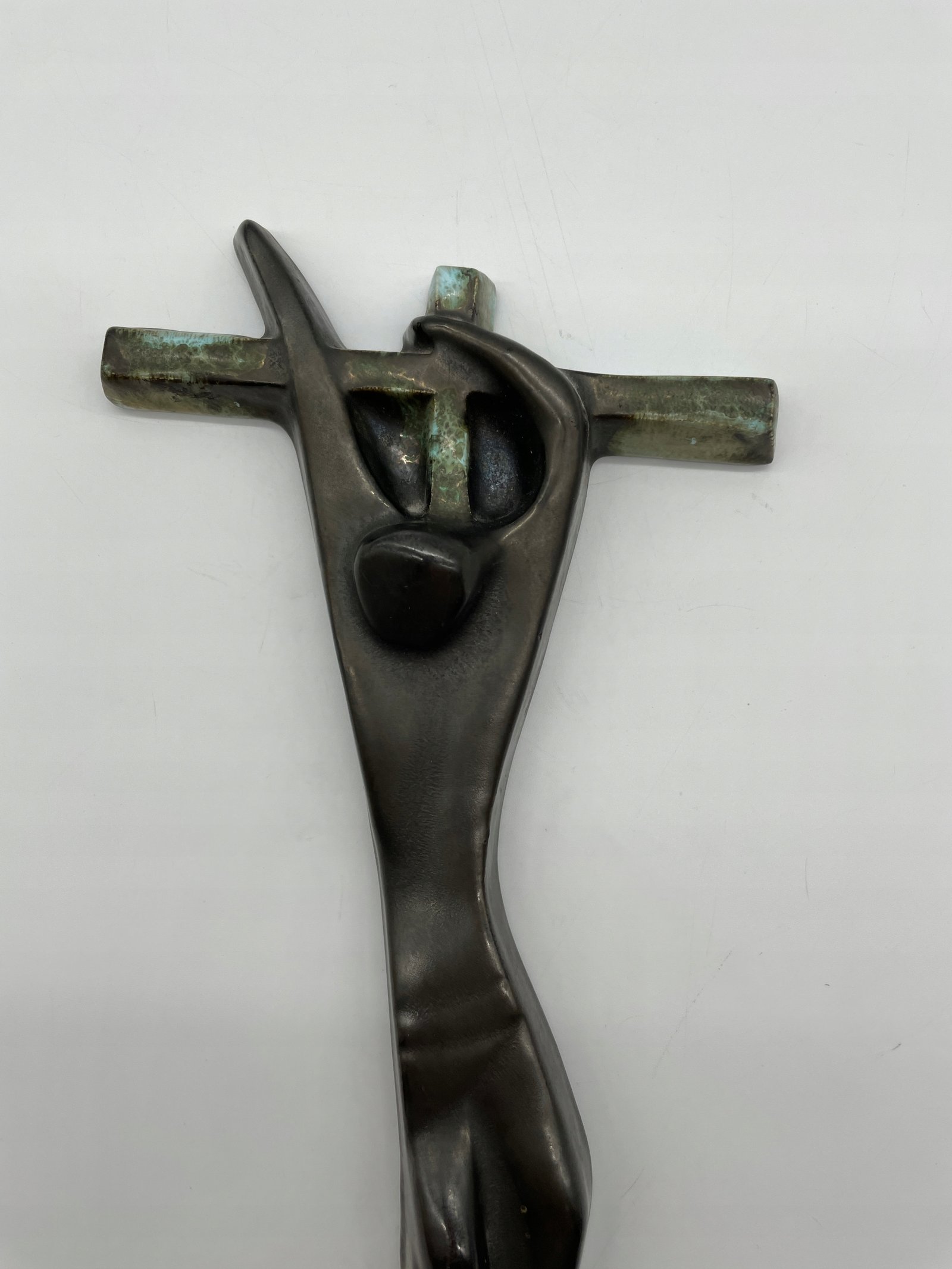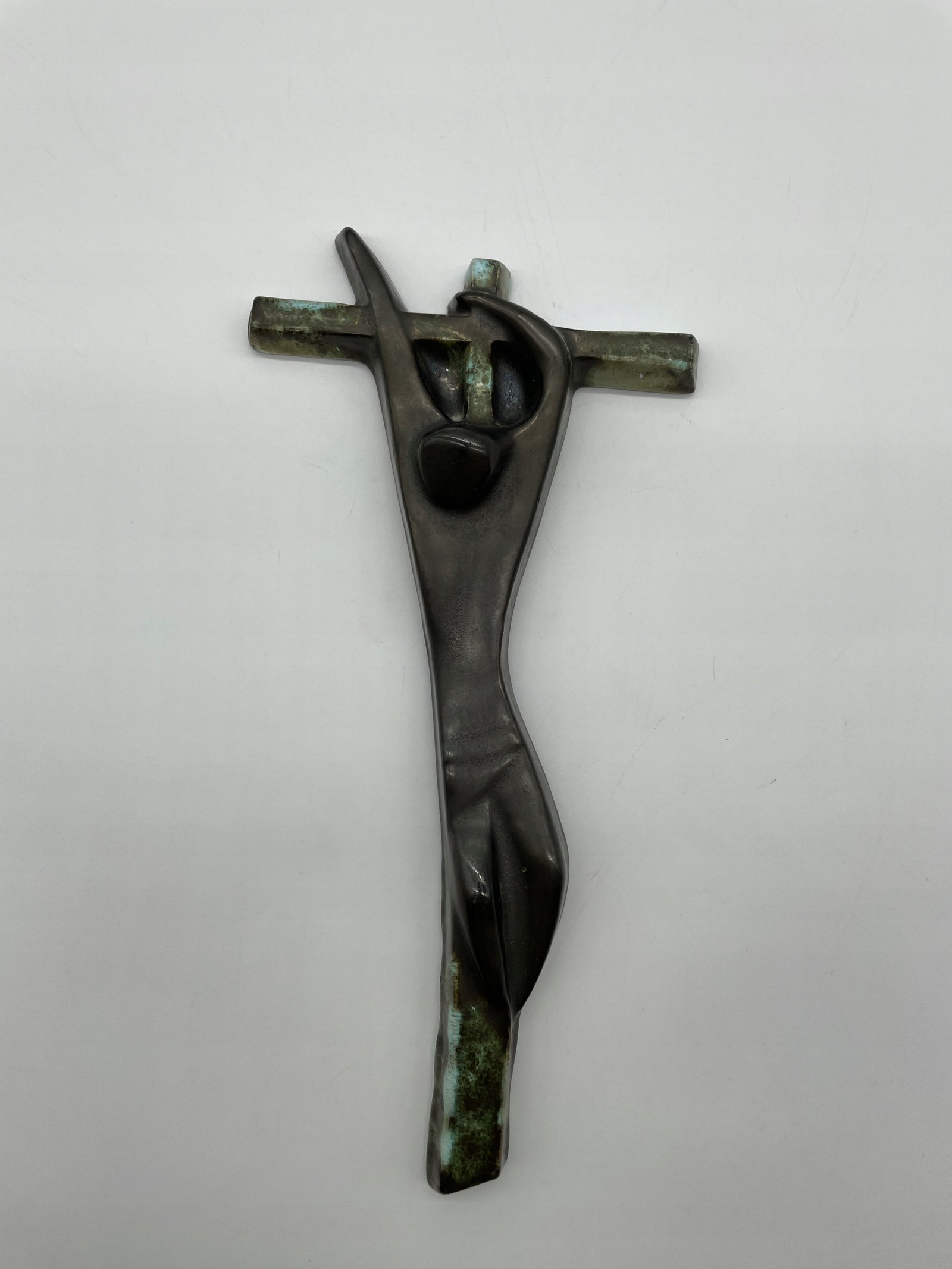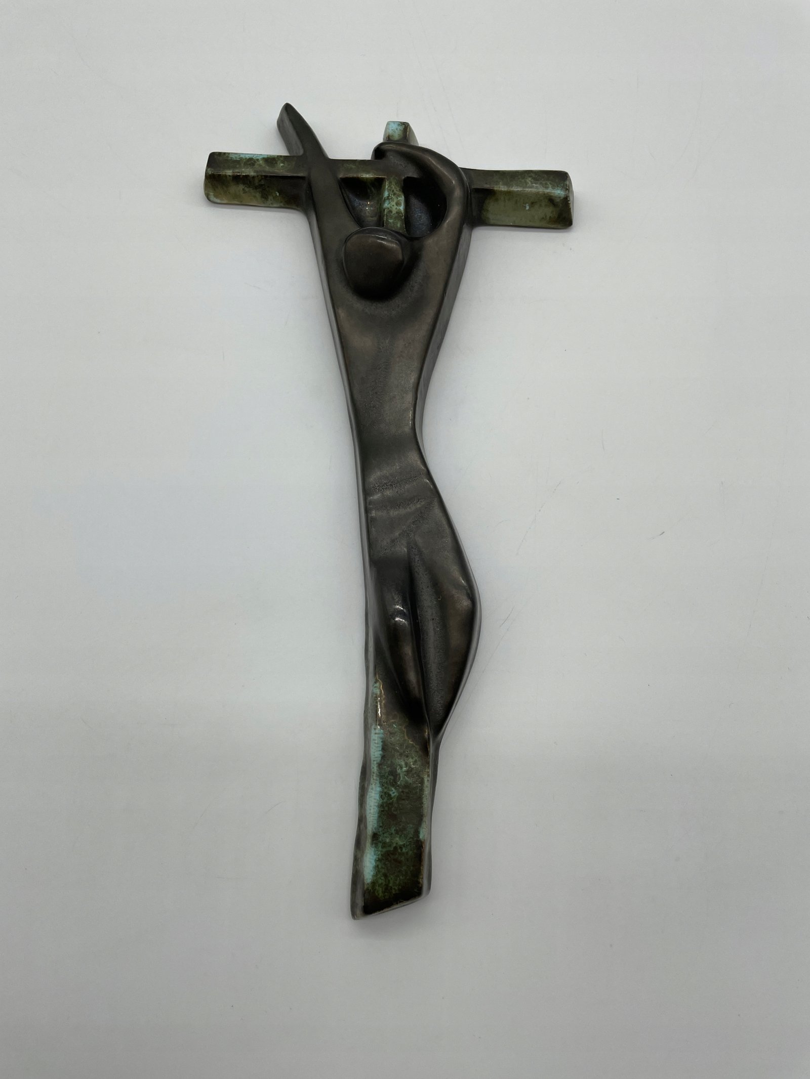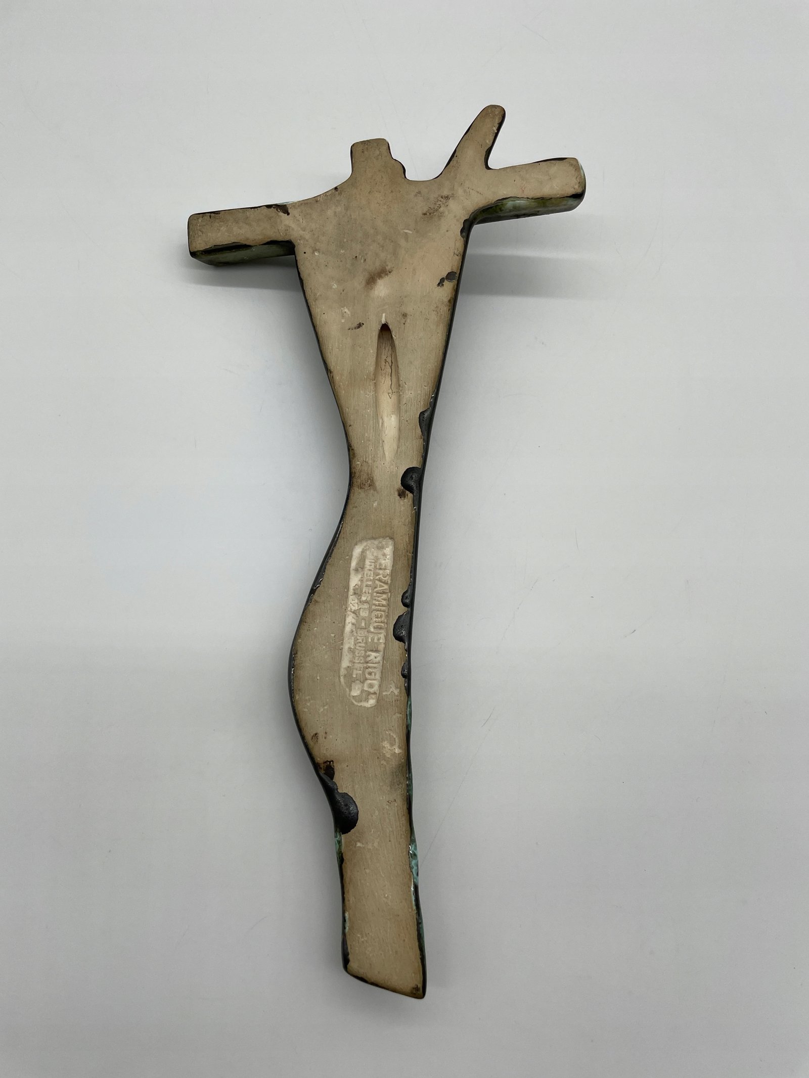 Rzadki ceramiczny krzyż w ekspresyjnym stylu modernistycznym, wykonany przez pracownię Céramique Rigo z siedzibą w Brukseli (adres: Welles 18, Brussels). Abstrakcyjna postać Chrystusa o wydłużonych proporcjach i uproszczonych formach nawiązuje do estetyki powojennego modernizmu. Powierzchnia pokryta szkliwem imitującym patynowany brąz z zielonymi przebarwieniami.