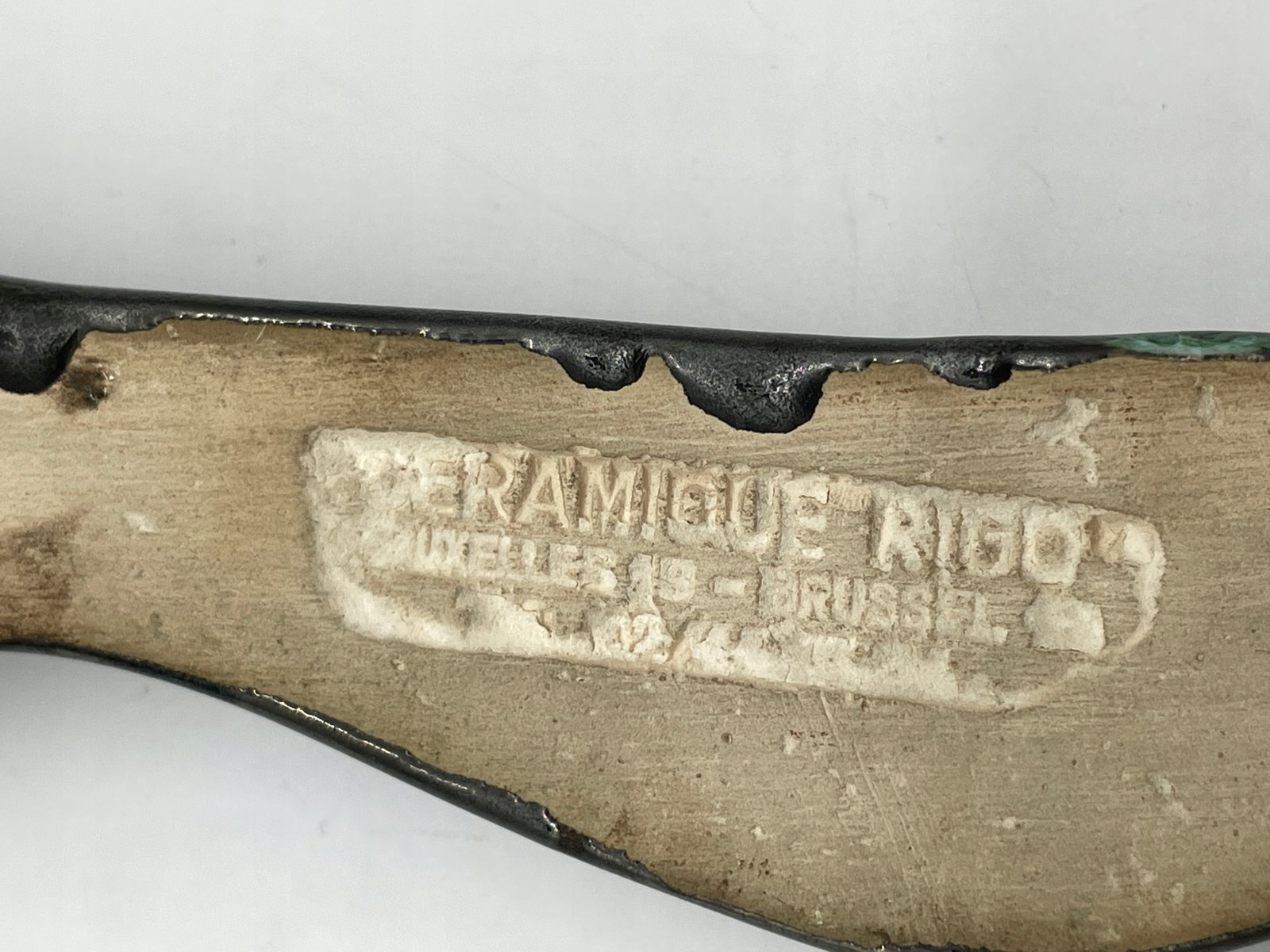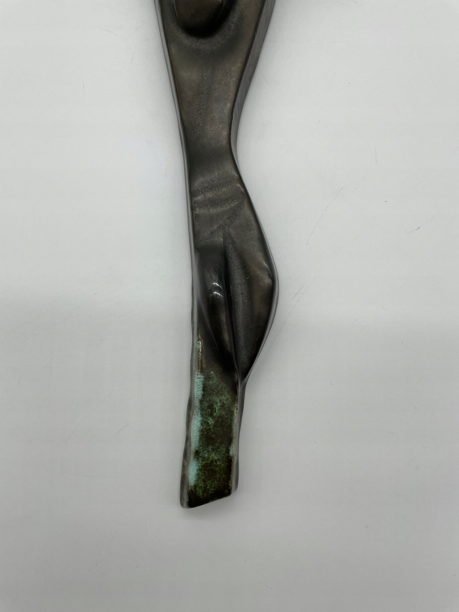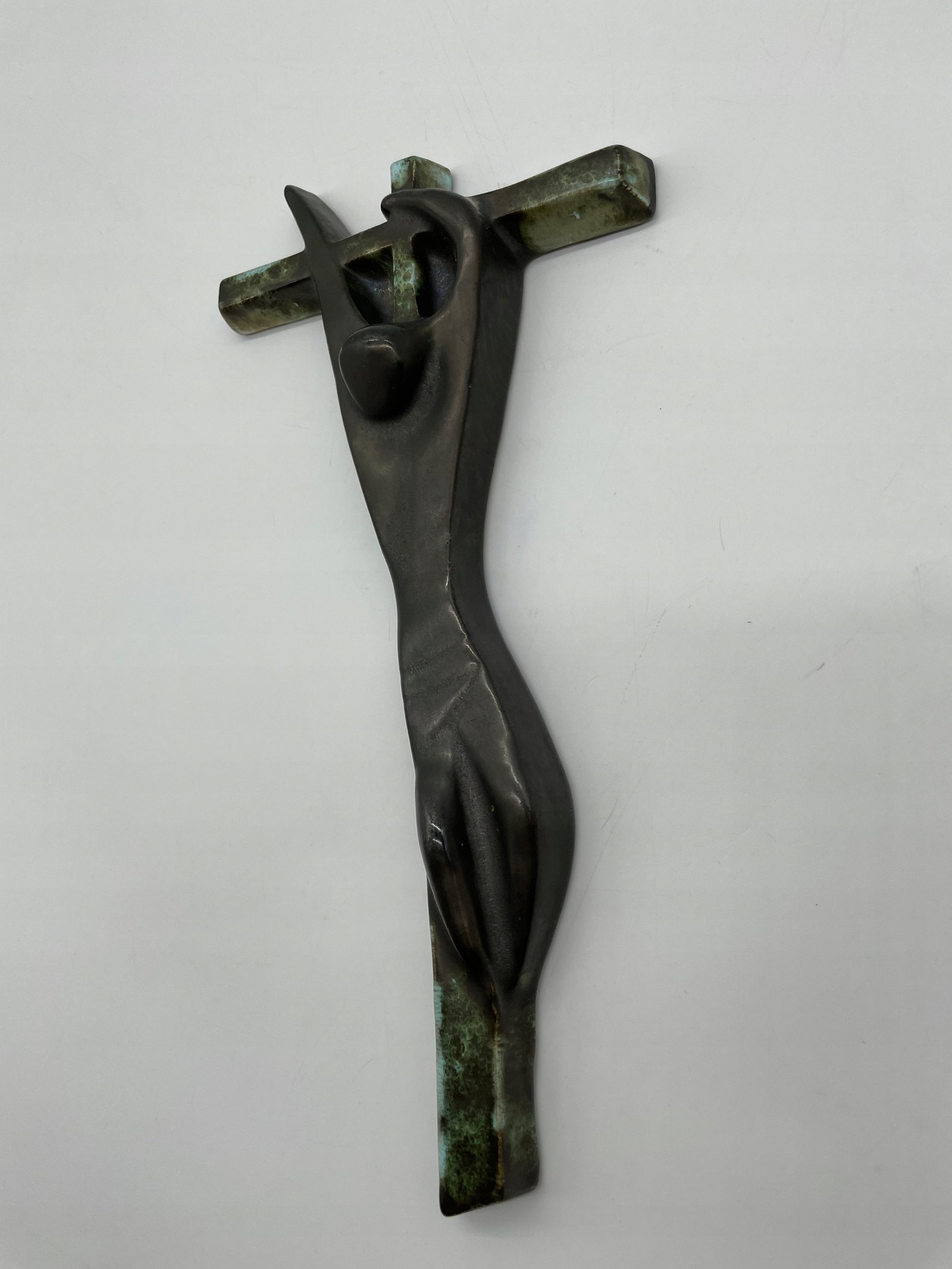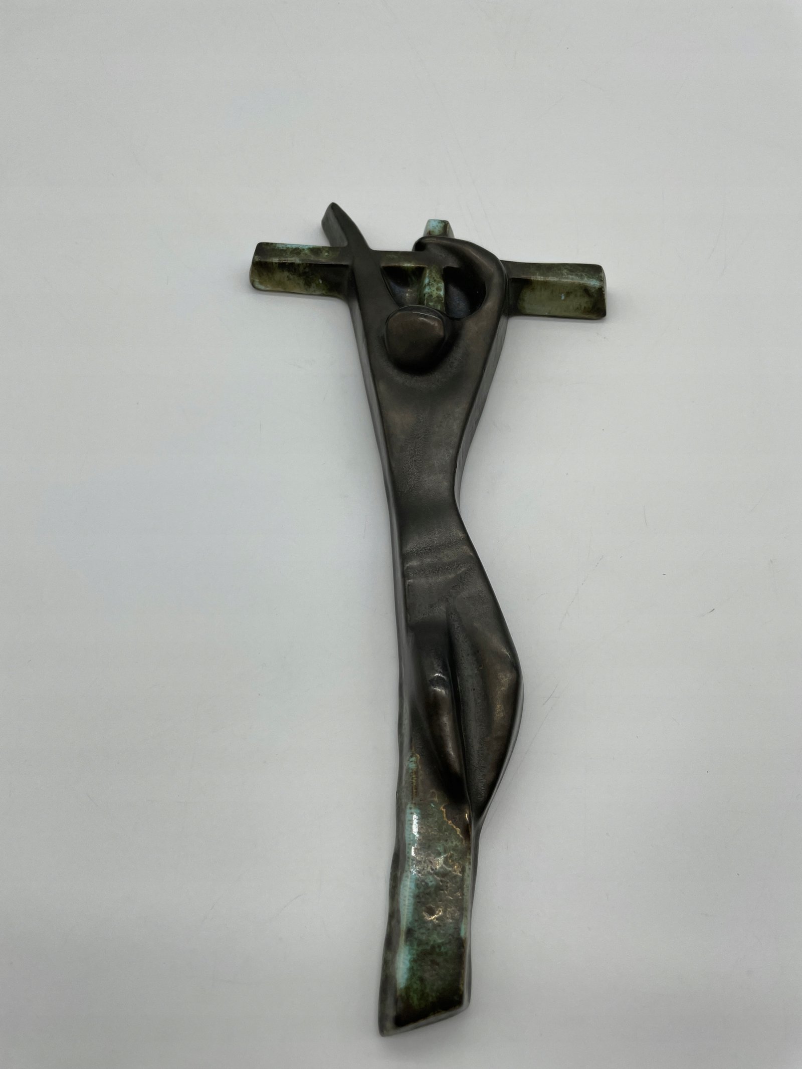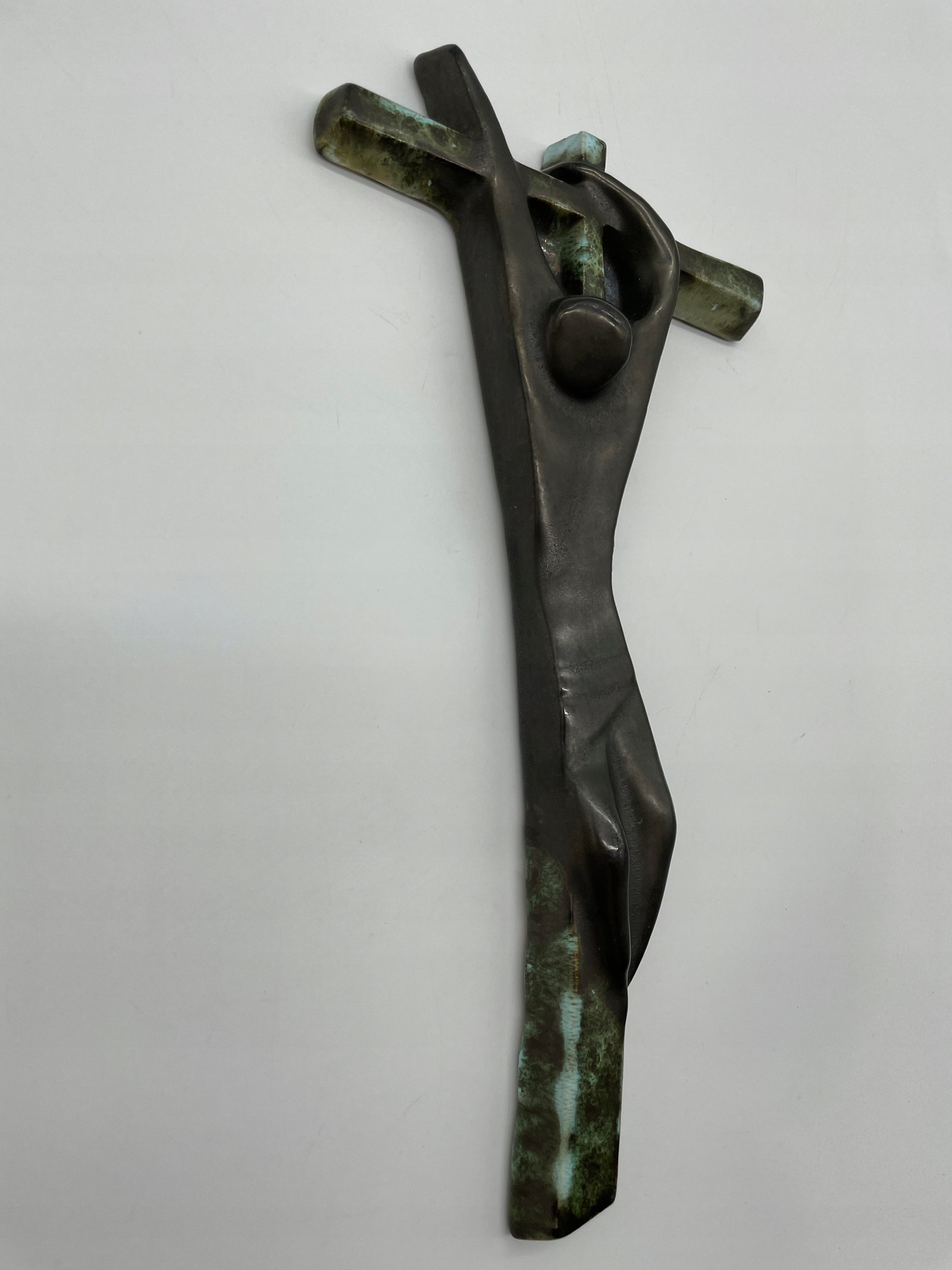Rzadki ceramiczny krzyż w ekspresyjnym stylu modernistycznym, wykonany przez pracownię Céramique Rigo z siedzibą w Brukseli (adres: Welles 18, Brussels). Abstrakcyjna postać Chrystusa o wydłużonych proporcjach i uproszczonych formach nawiązuje do estetyki powojennego modernizmu. Powierzchnia pokryta szkliwem imitującym patynowany brąz z zielonymi przebarwieniami.