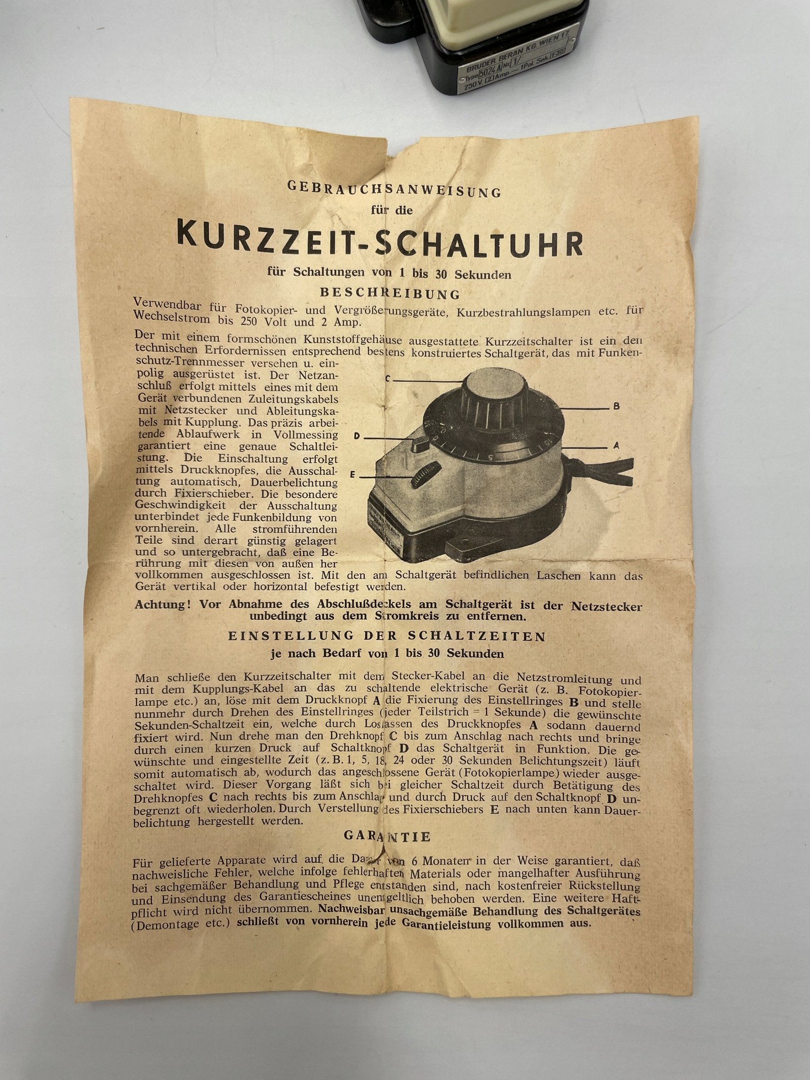 Urządzenie przeznaczone do sterowania czasowymi interwałami włączania urządzeń elektrycznych, takich jak kopiarki, powiększalniki fotograficzne, lampy krótkiego promieniowania i inne. Zakres czasu przełączania wynosi od 1 do 30 sekund.