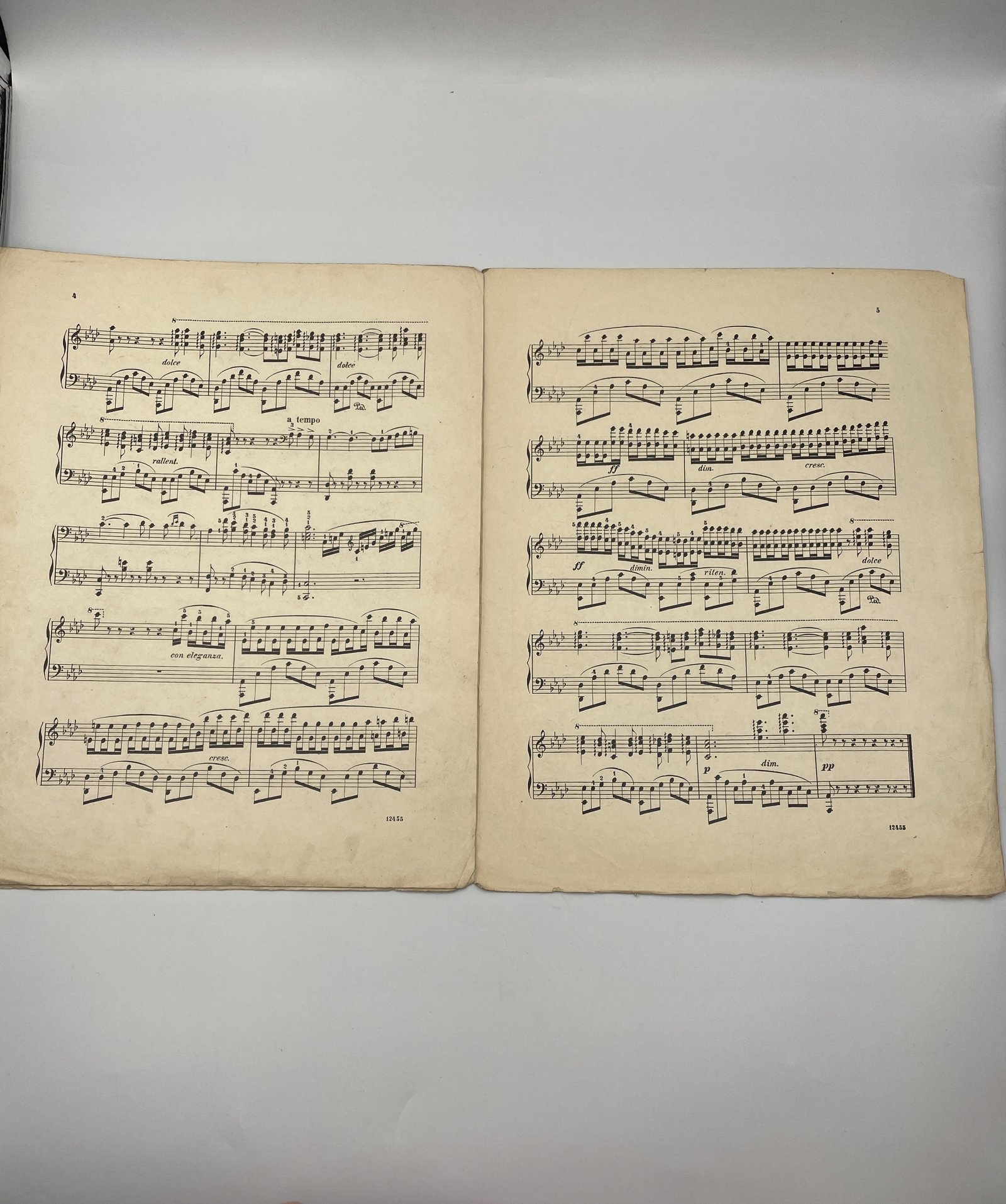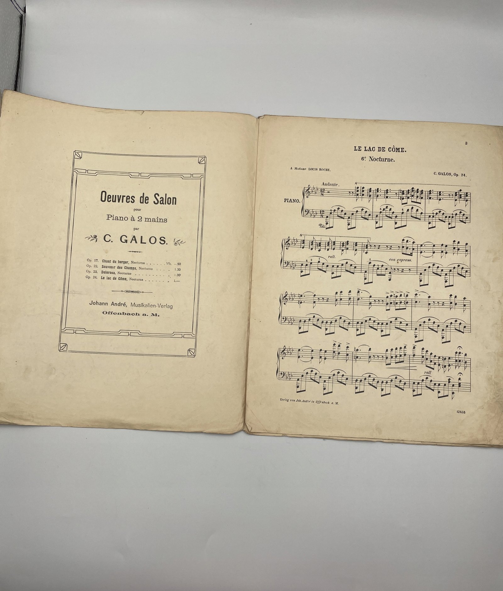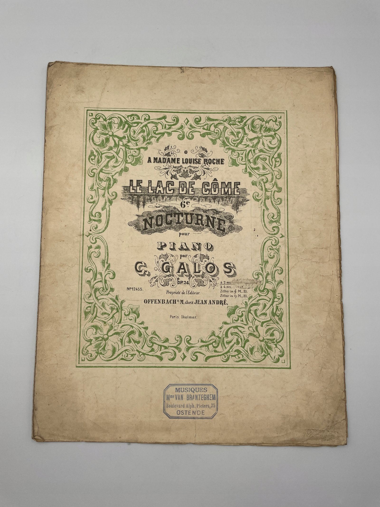 Oferowane nuty to oryginalne wydanie utworu „Le Lac de Côme – 6e Nocturne” autorstwa G. Galosa (opus 24), dedykowane Madame Louise Roche. Utwór przeznaczony jest na fortepian i stanowi przykład eleganckiej muzyki salonowej z końca XIX wieku.
