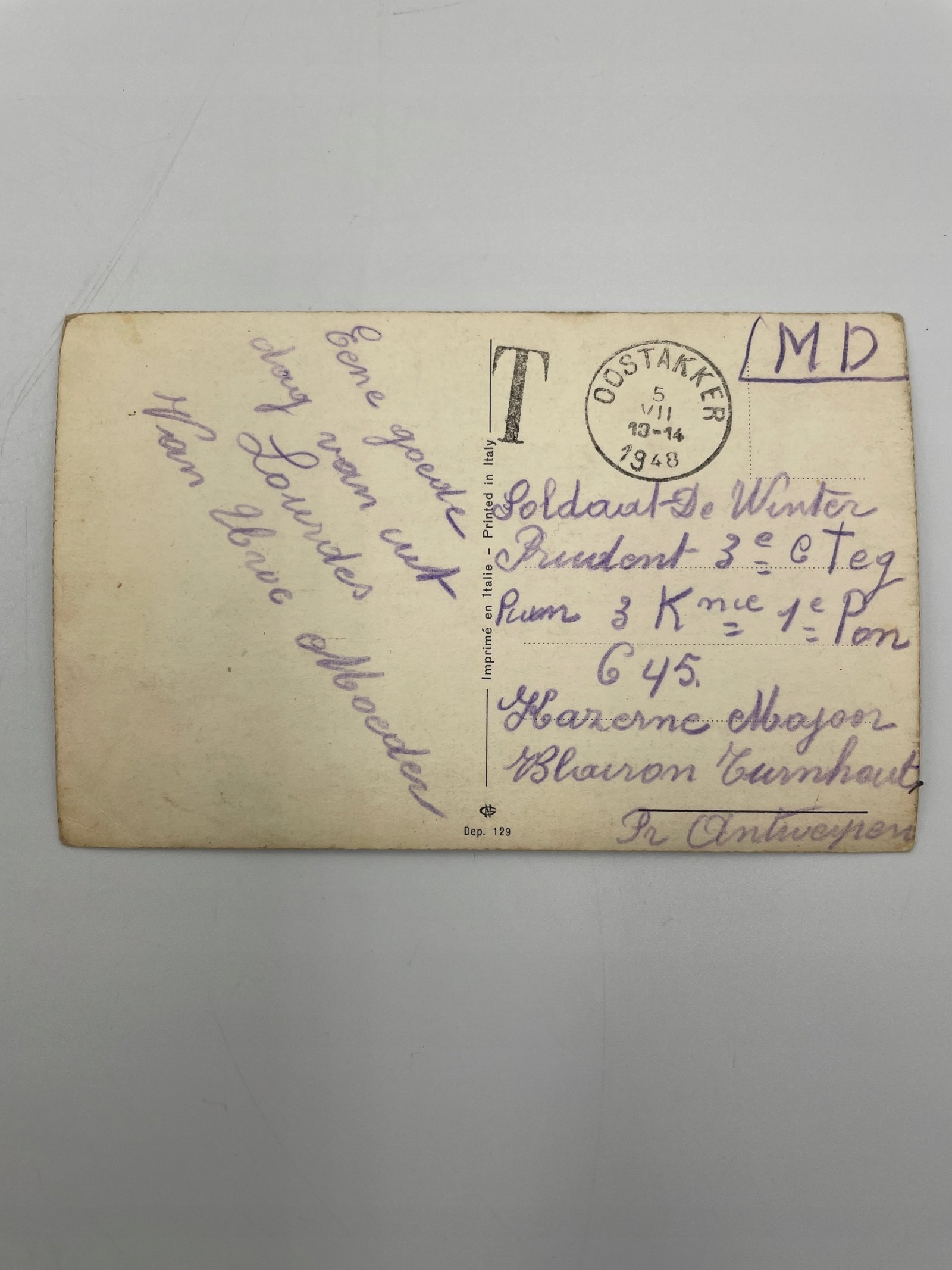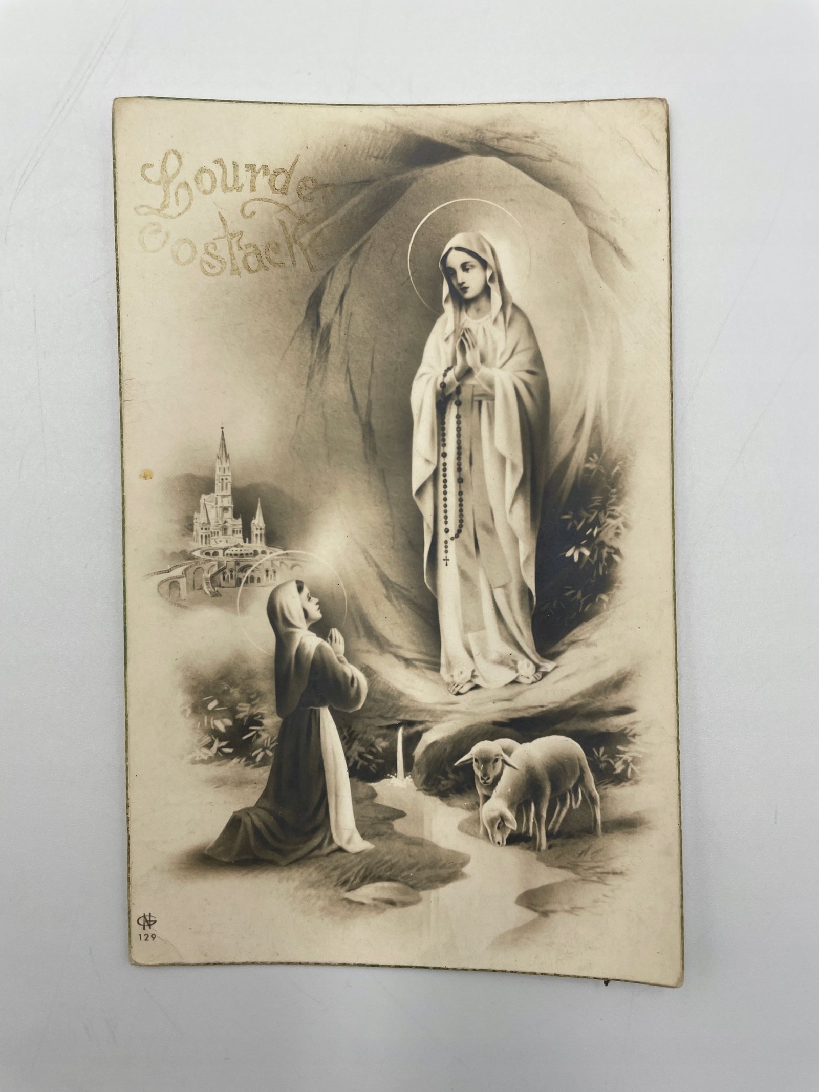 Oryginalna pocztówka z 1948 roku przedstawiająca objawienie Matki Bożej w Lourdes, z dopiskiem „Oostakker”. Piękna sepia grafika z owieczkami i modlącą się dziewczynką.