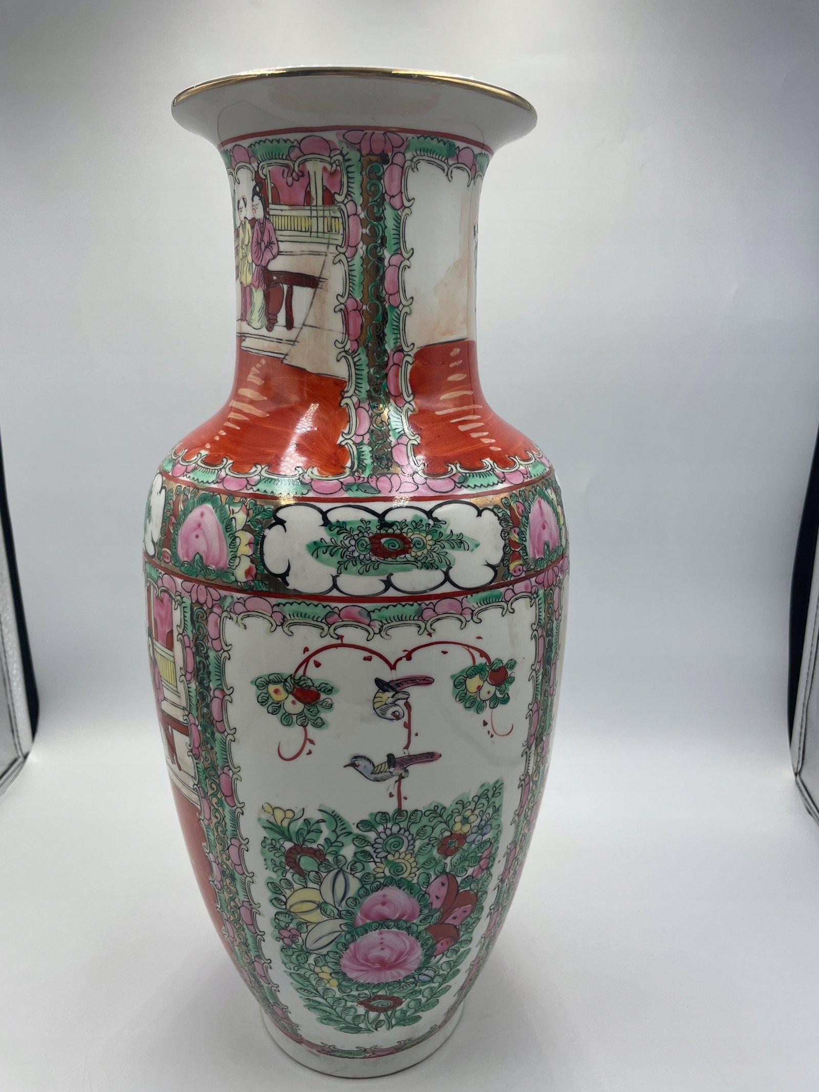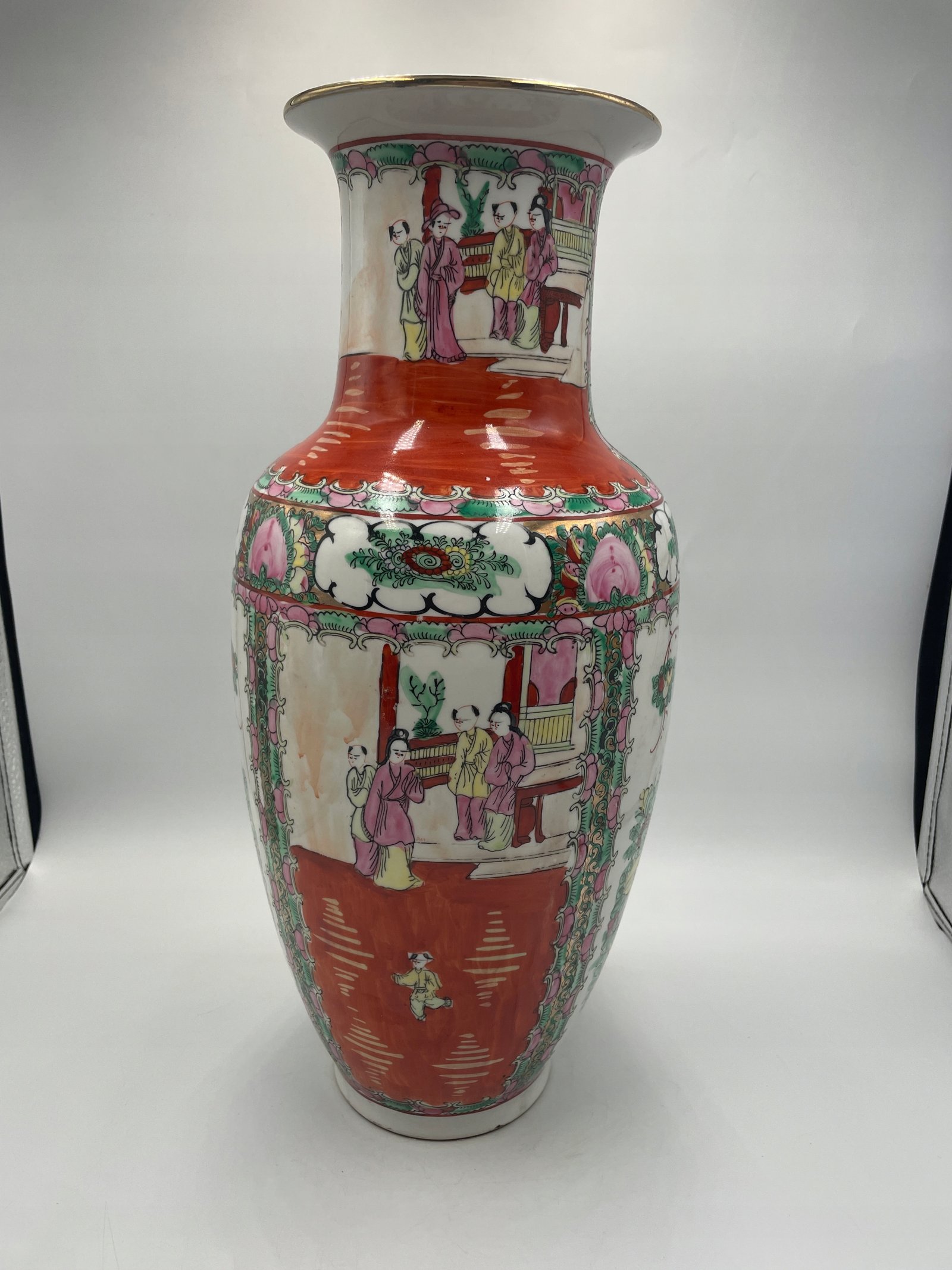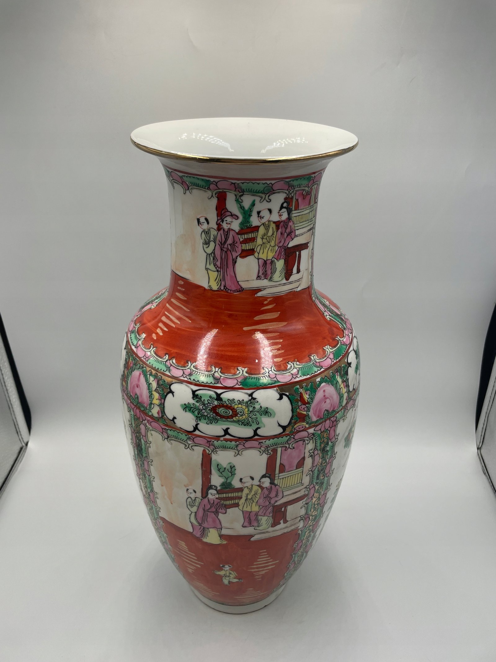 Efektowny porcelanowy wazon o wysokości 42 cm i średnicy 18 cm, wykonany w tradycyjnym chińskim stylu z ręcznie malowanymi dekoracjami. Wazon zdobią kolorowe sceny z postaciami w klasycznych chińskich strojach oraz kwiatowe i ornamentalne wzory. Dominują kolory: intensywna czerwień, róż, zieleń i biel, uzupełnione złotym wykończeniem na brzegach. Na spodzie wazonu znajduje się czerwona pieczęć z hieroglifami, potwierdzająca jego autentyczność lub styl pochodzenia.