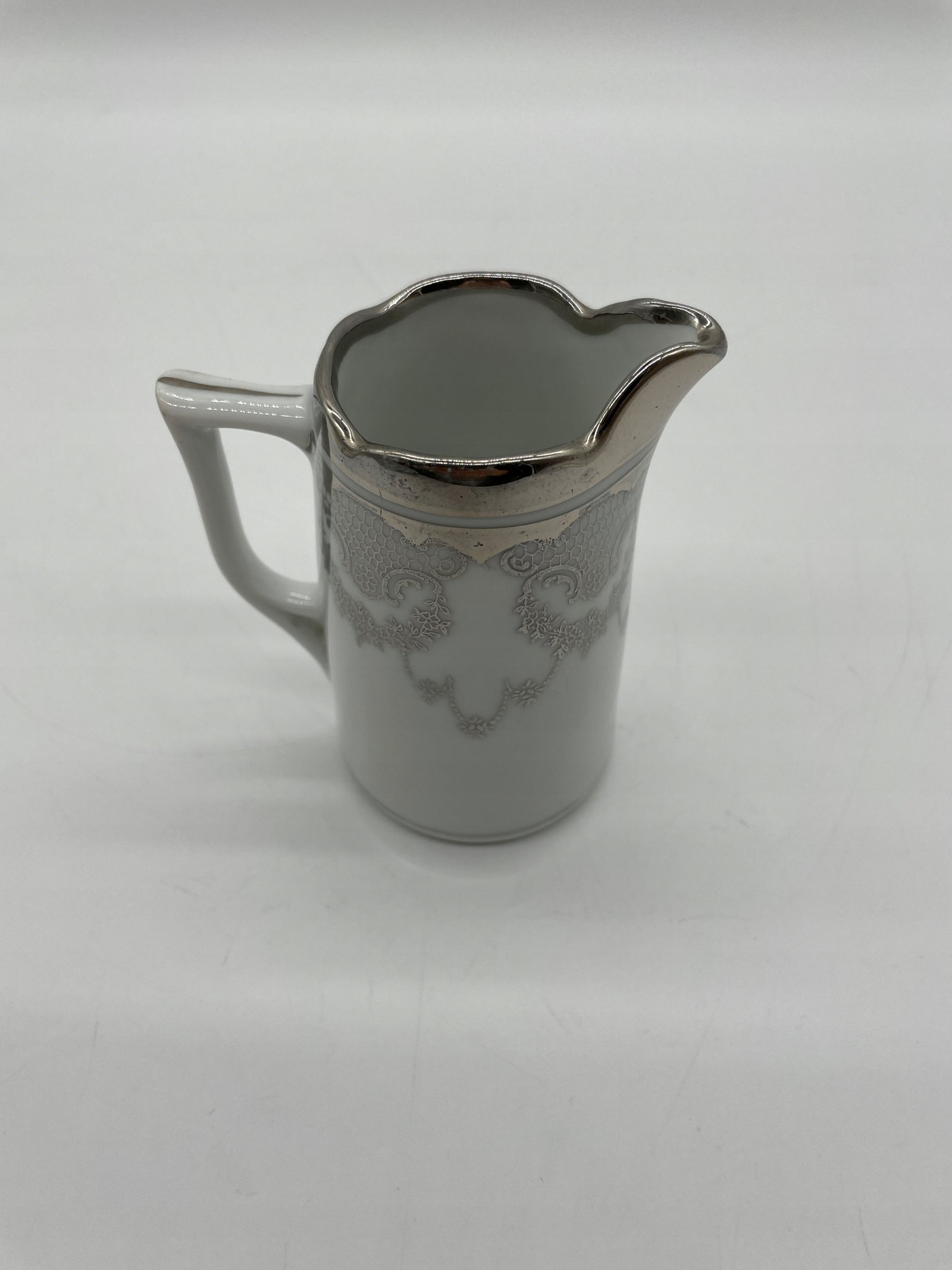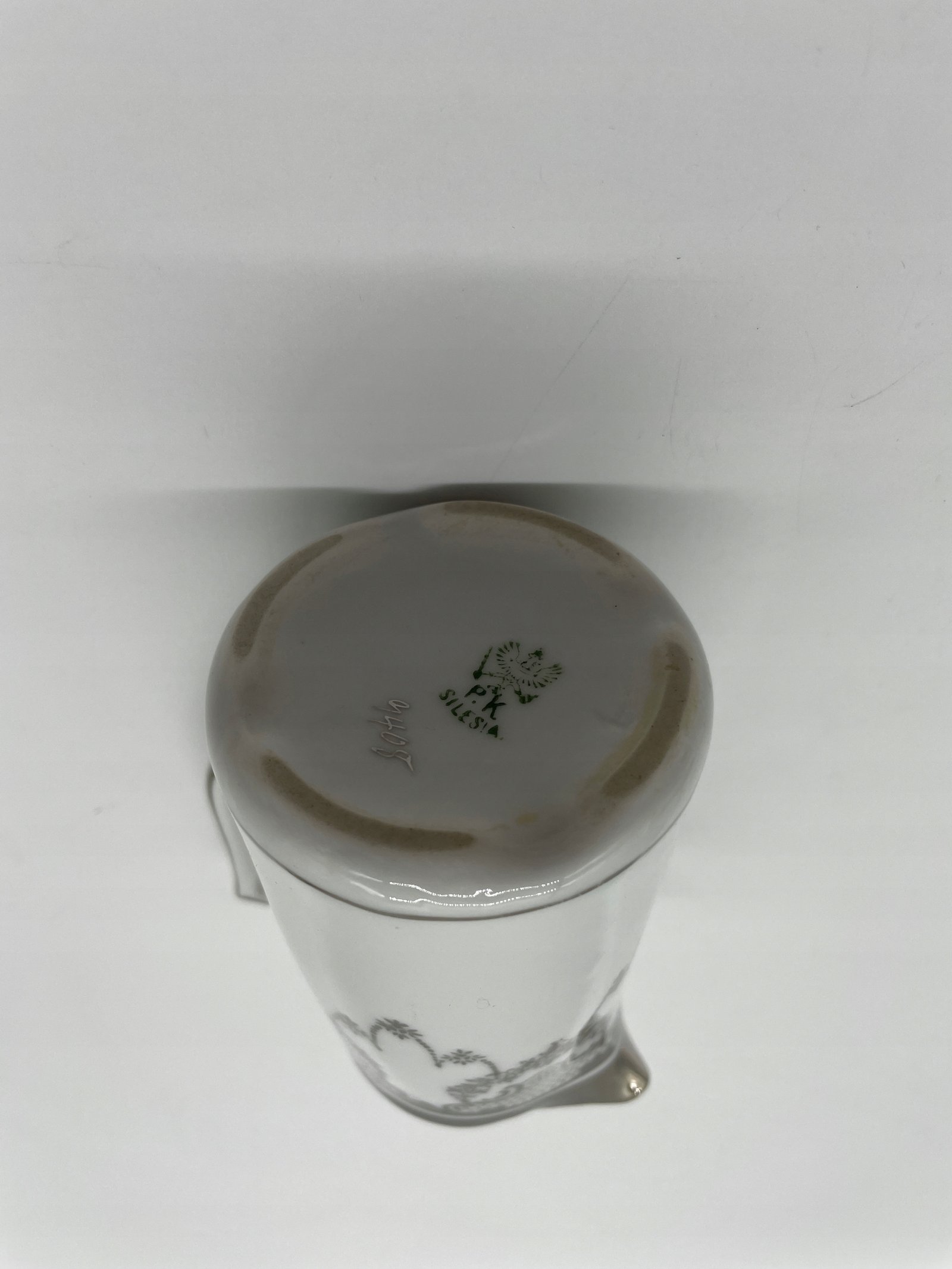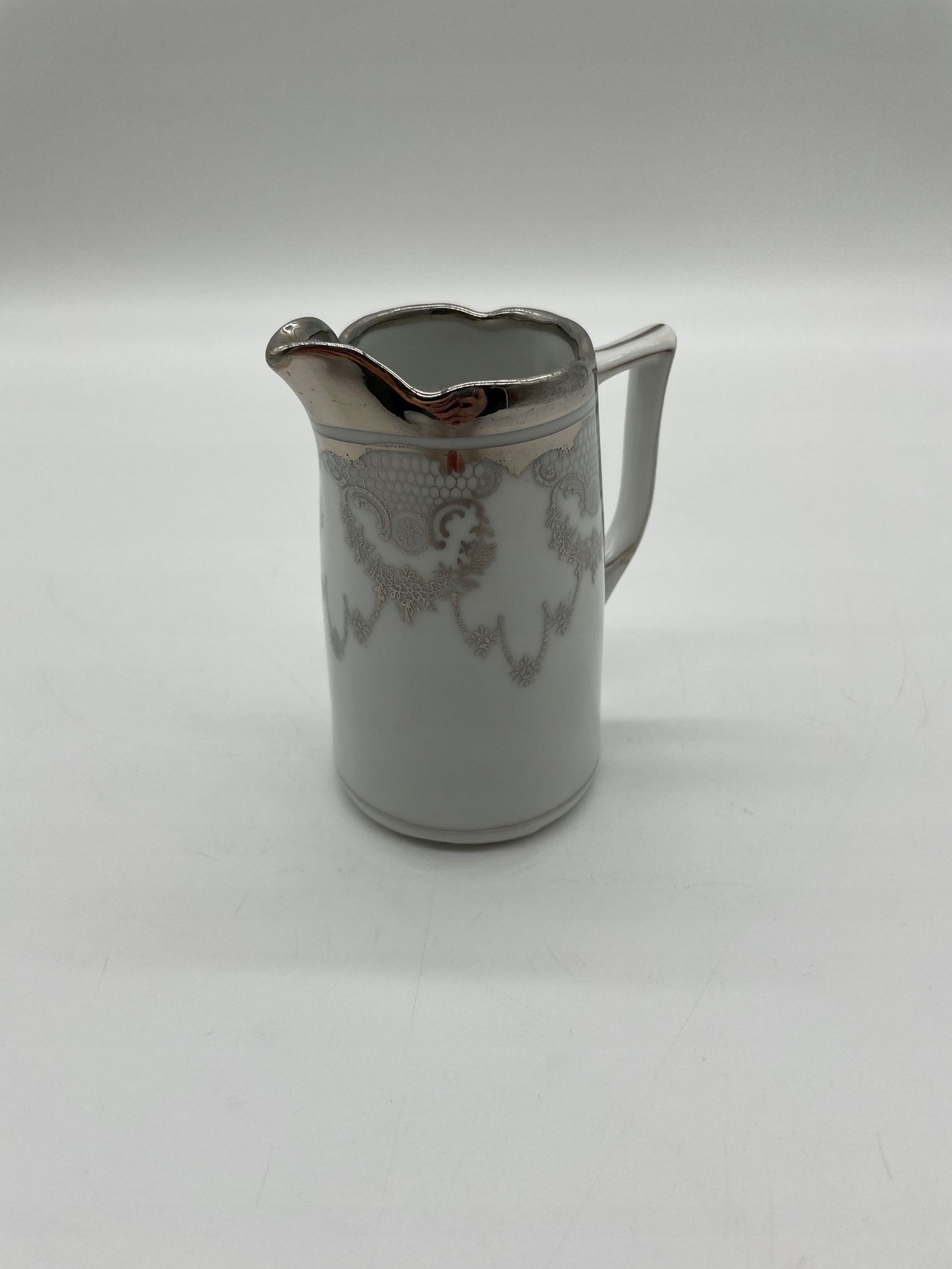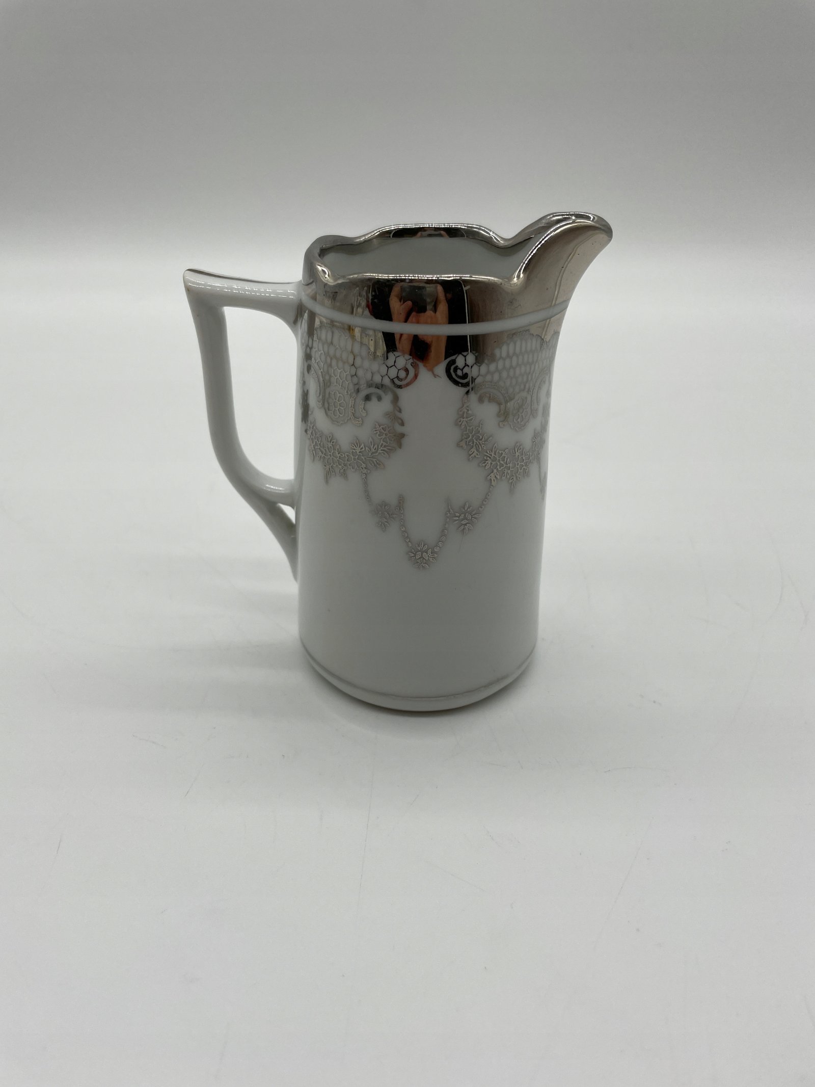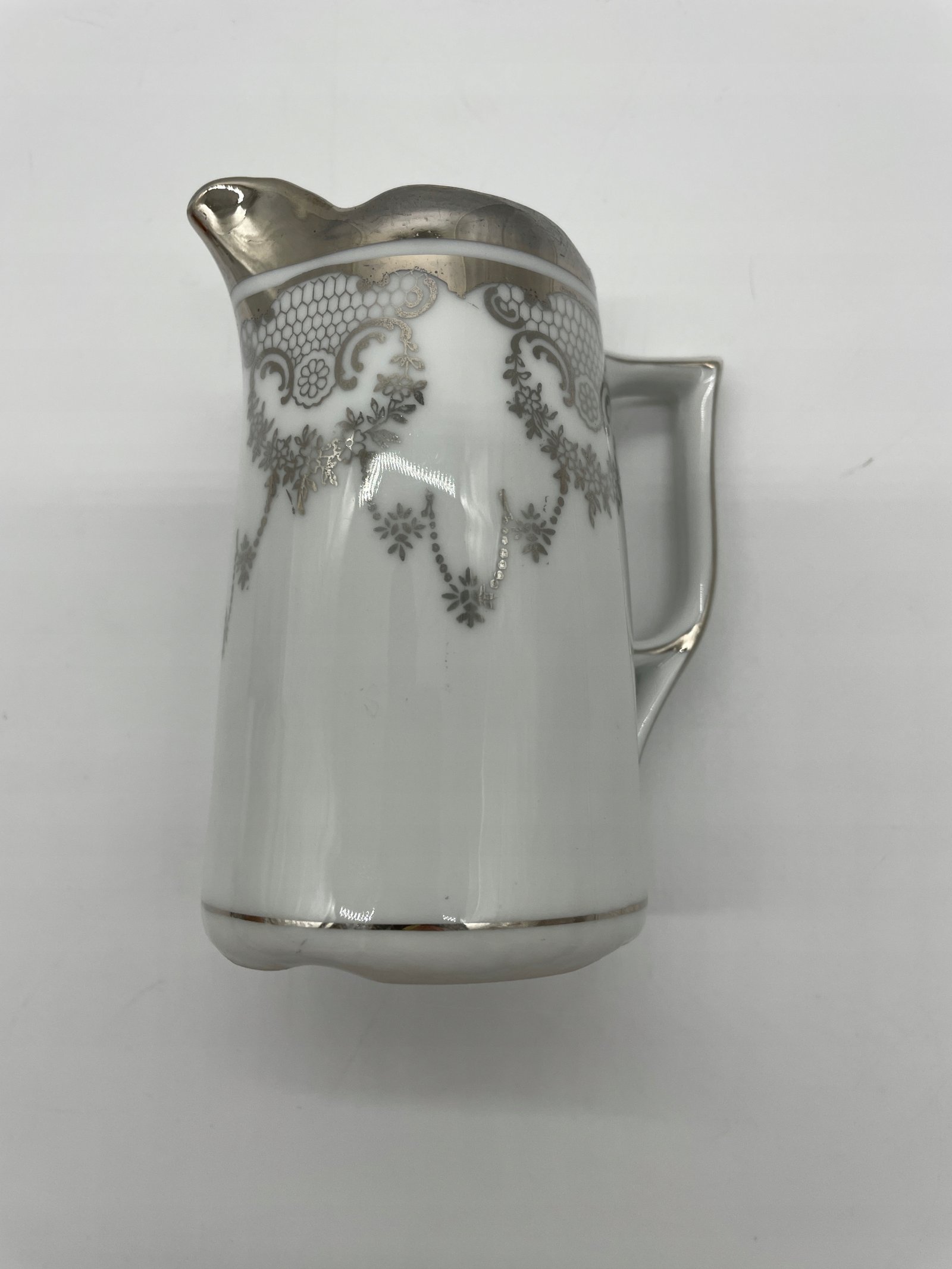 Porcelanowy mlecznik o cylindrycznym kształcie, zdobiony delikatnym reliefowym wzorem oraz ornamentem o metalicznym połysku – prawdopodobnie posrebrzanym. Brzeg, dzióbek i uchwyt pokryte są dekoracją o srebrzystym odcieniu. Zdobienie wykonane metodą kalkomanii z dodatkowym reliefem. Na spodzie widnieje znak fabryki Porzellanfabrik Koenigszelt – P.K. SILESIA z wizerunkiem orła.