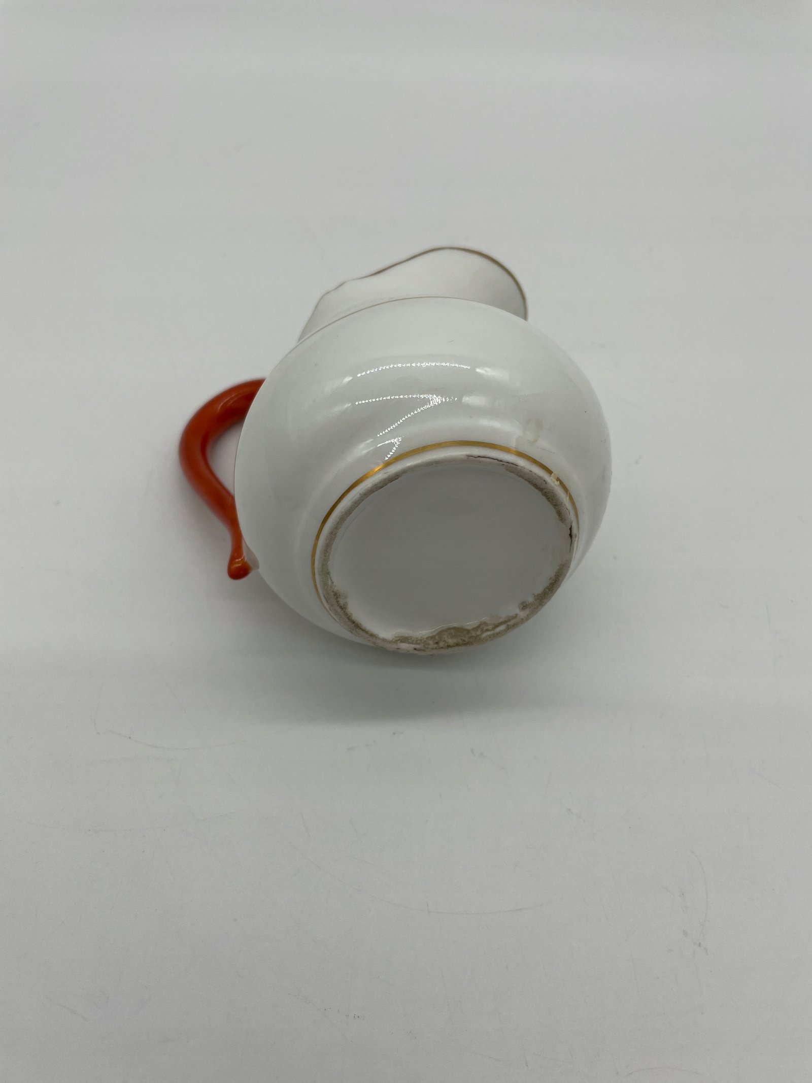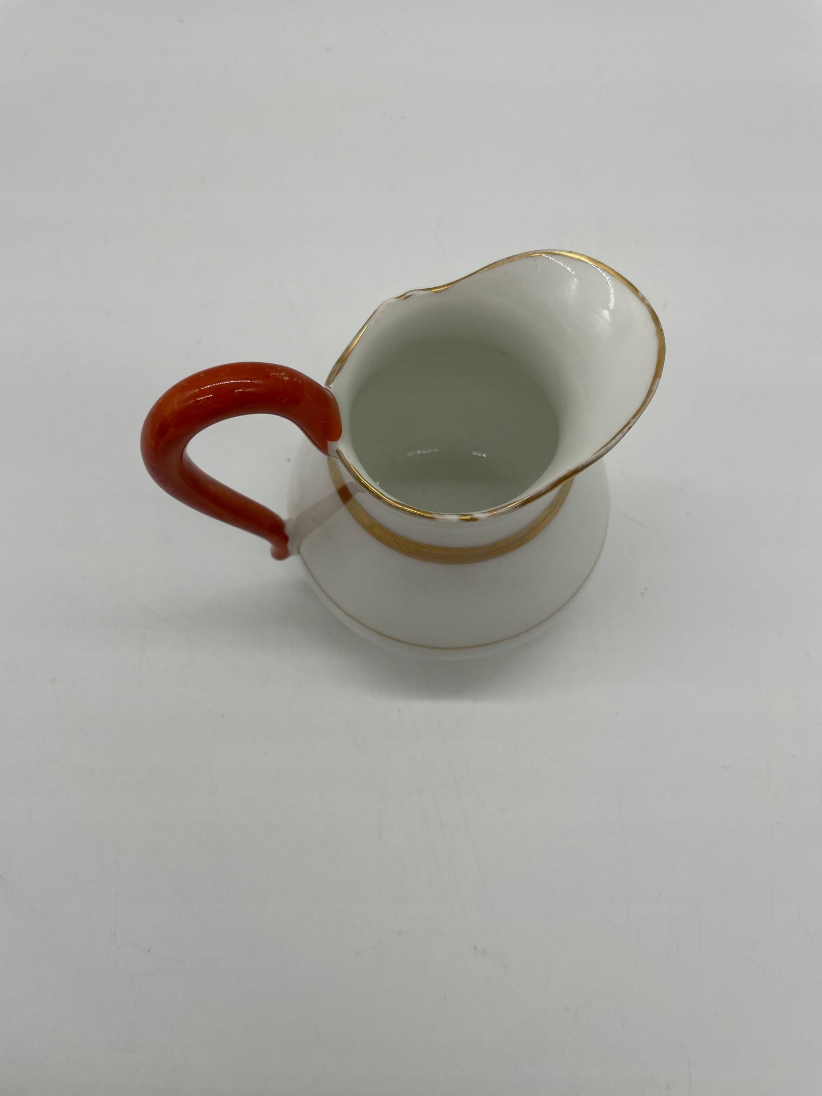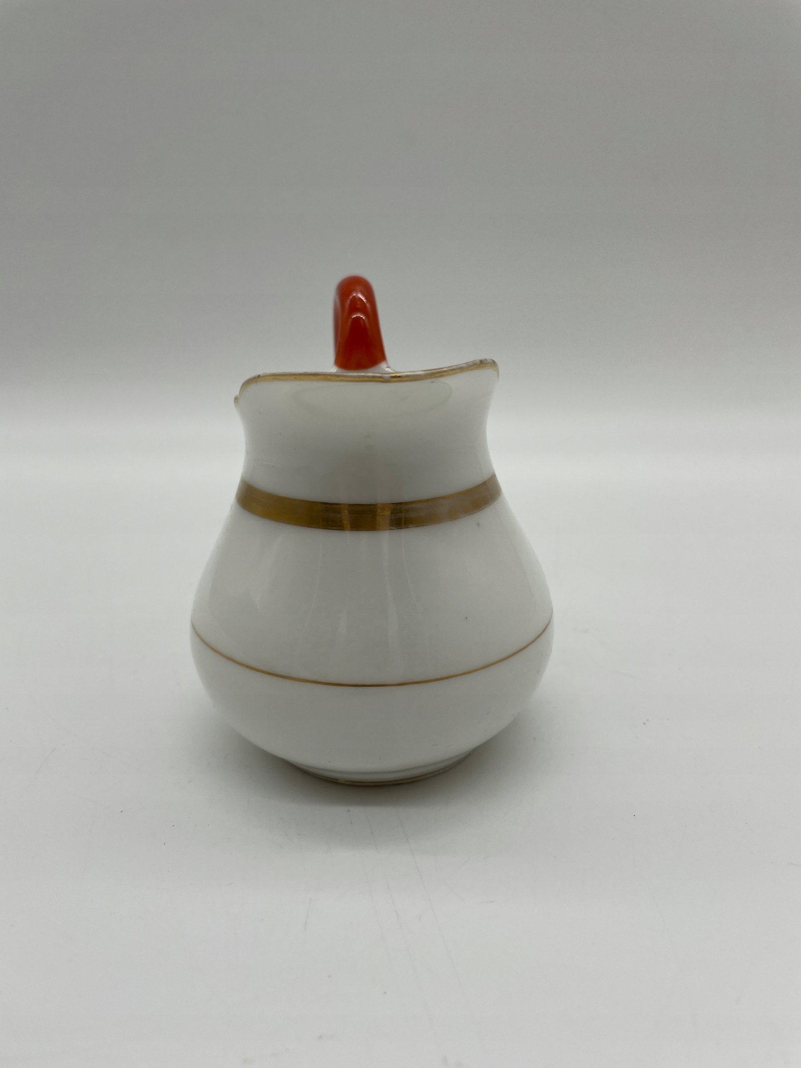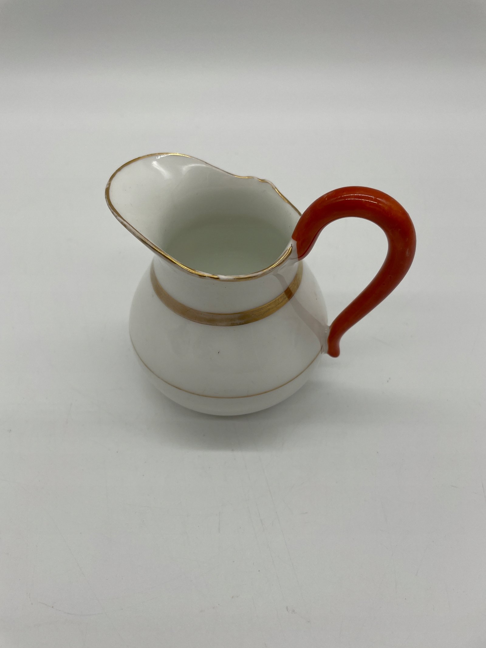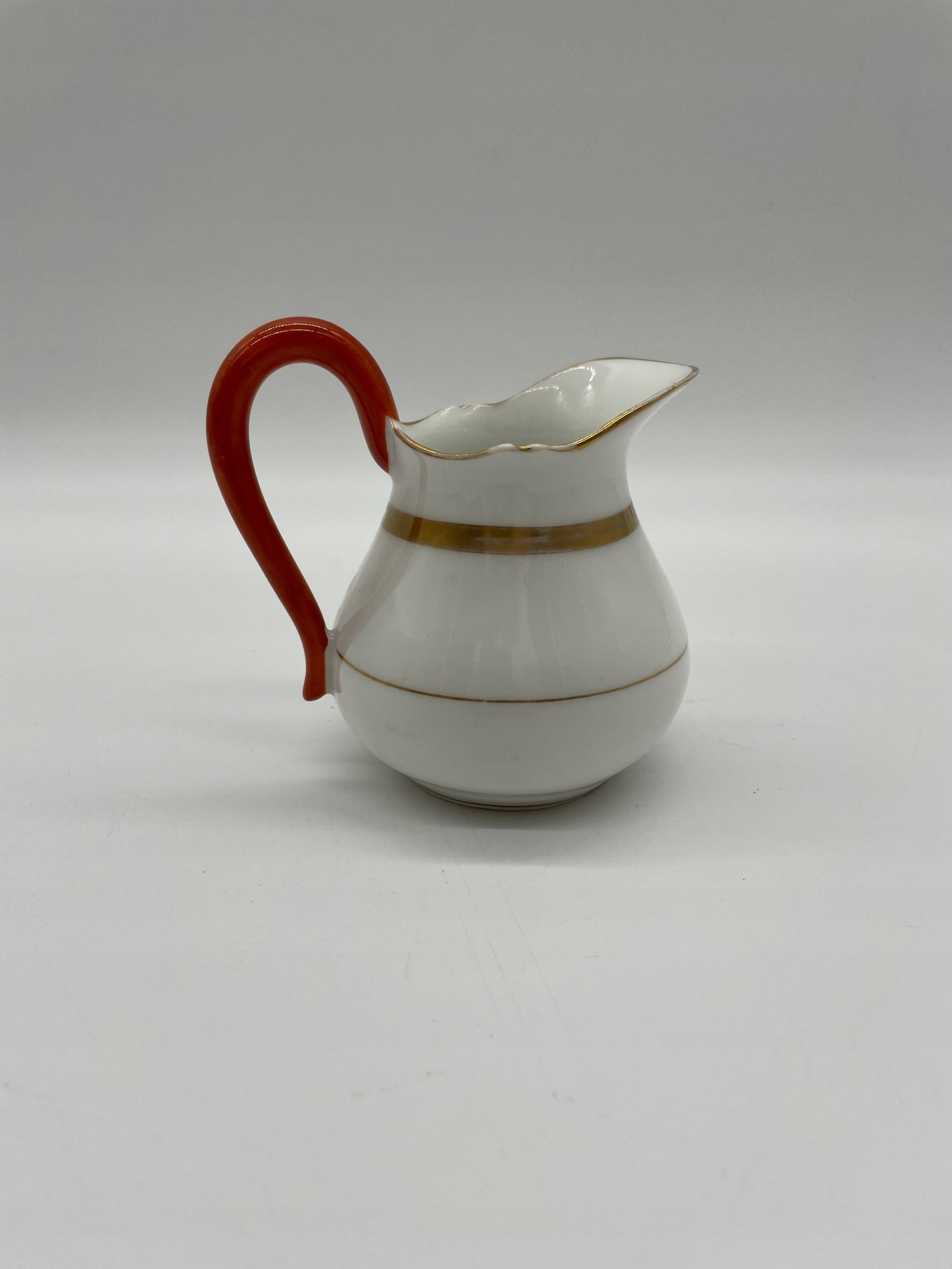 Porcelanowy mlecznik biały ze złotym paskiem i czerwonym uchwytem
