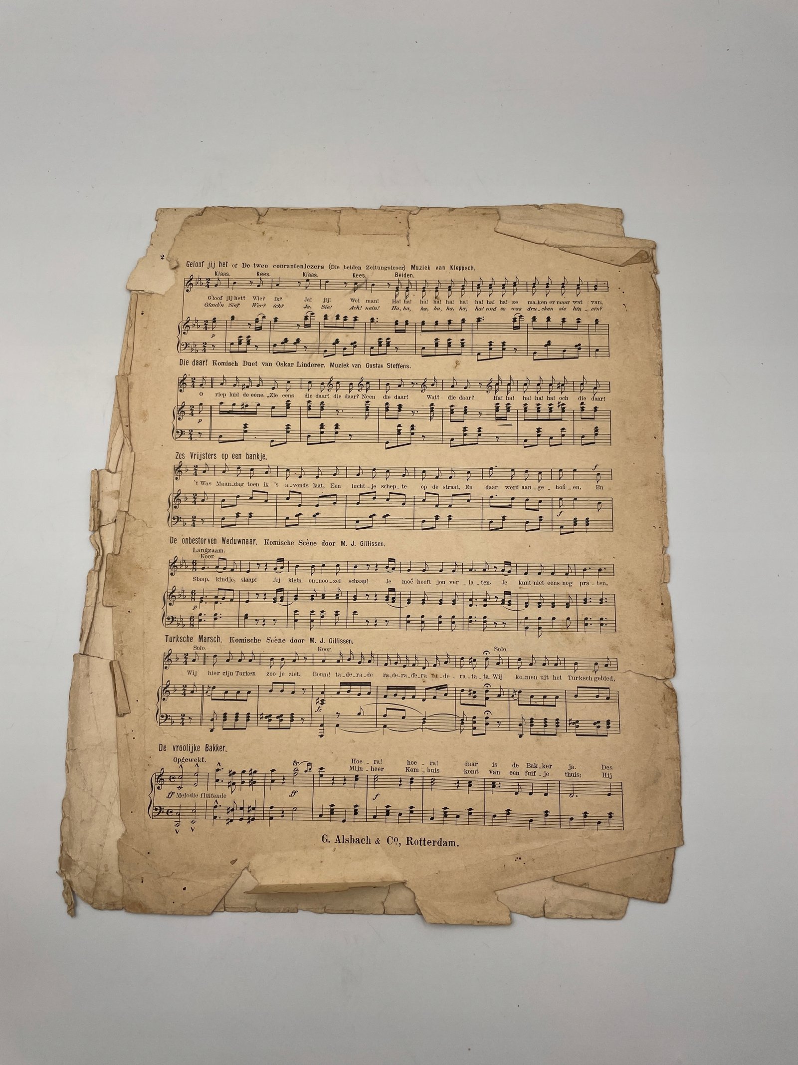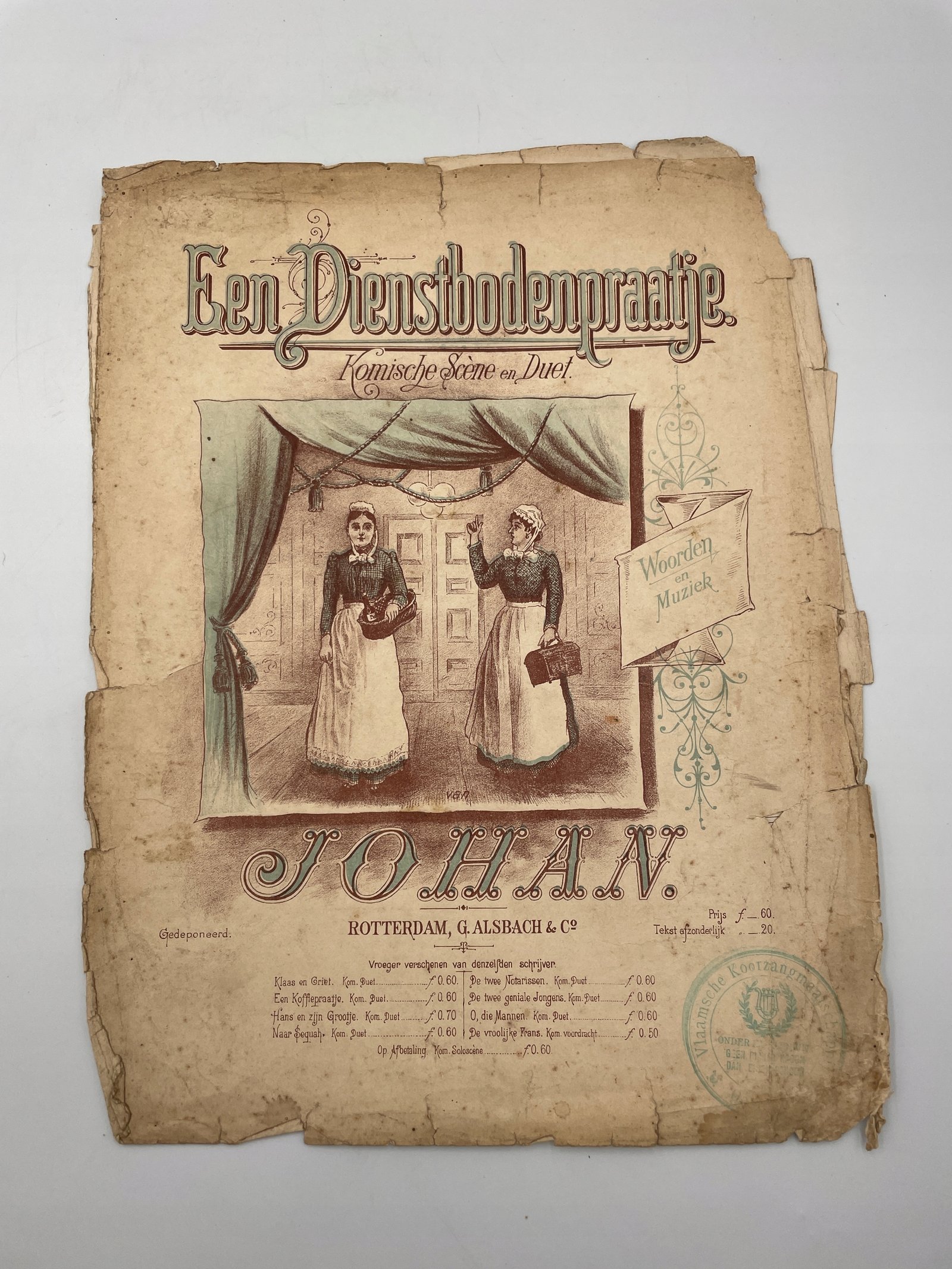 Holenderska scena komiczna z muzyką „Een Dienstbodenpraatje” („Rozmowa służących”) z ilustracją na okładce, wydana przez G. Alsbach & Co. w Rotterdamie. Kompozytor podpisany jako Johan. Wydanie datowane około 1890 roku. Utwór jest duetem wokalnym z akompaniamentem fortepianowym.