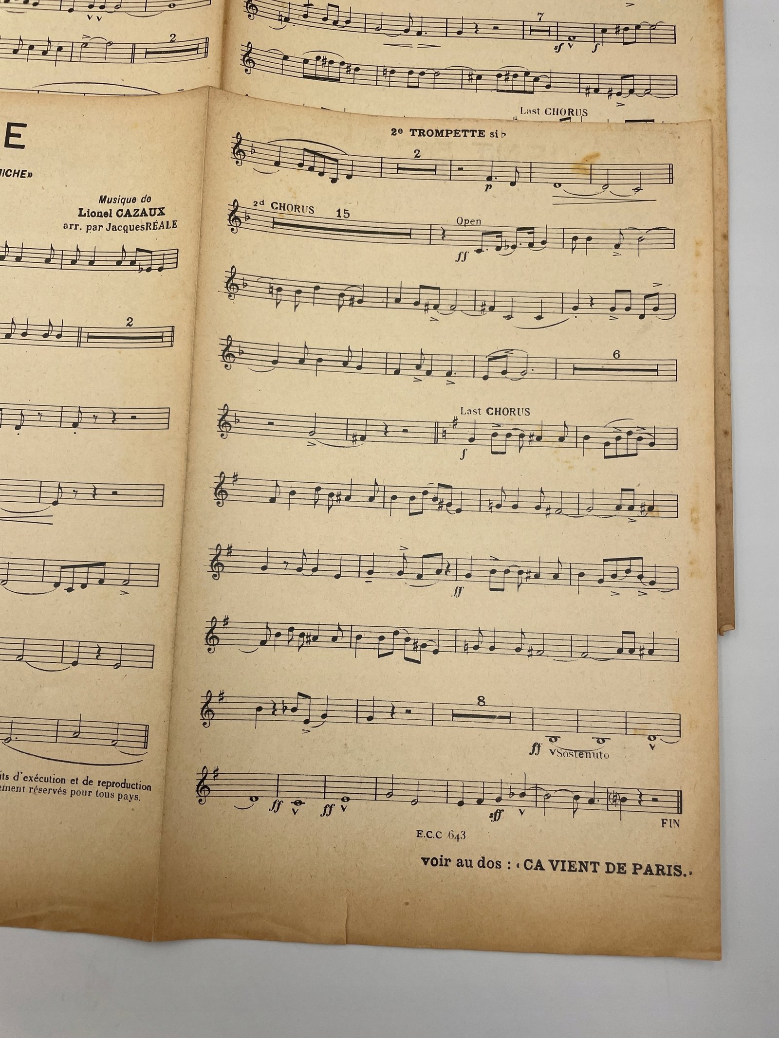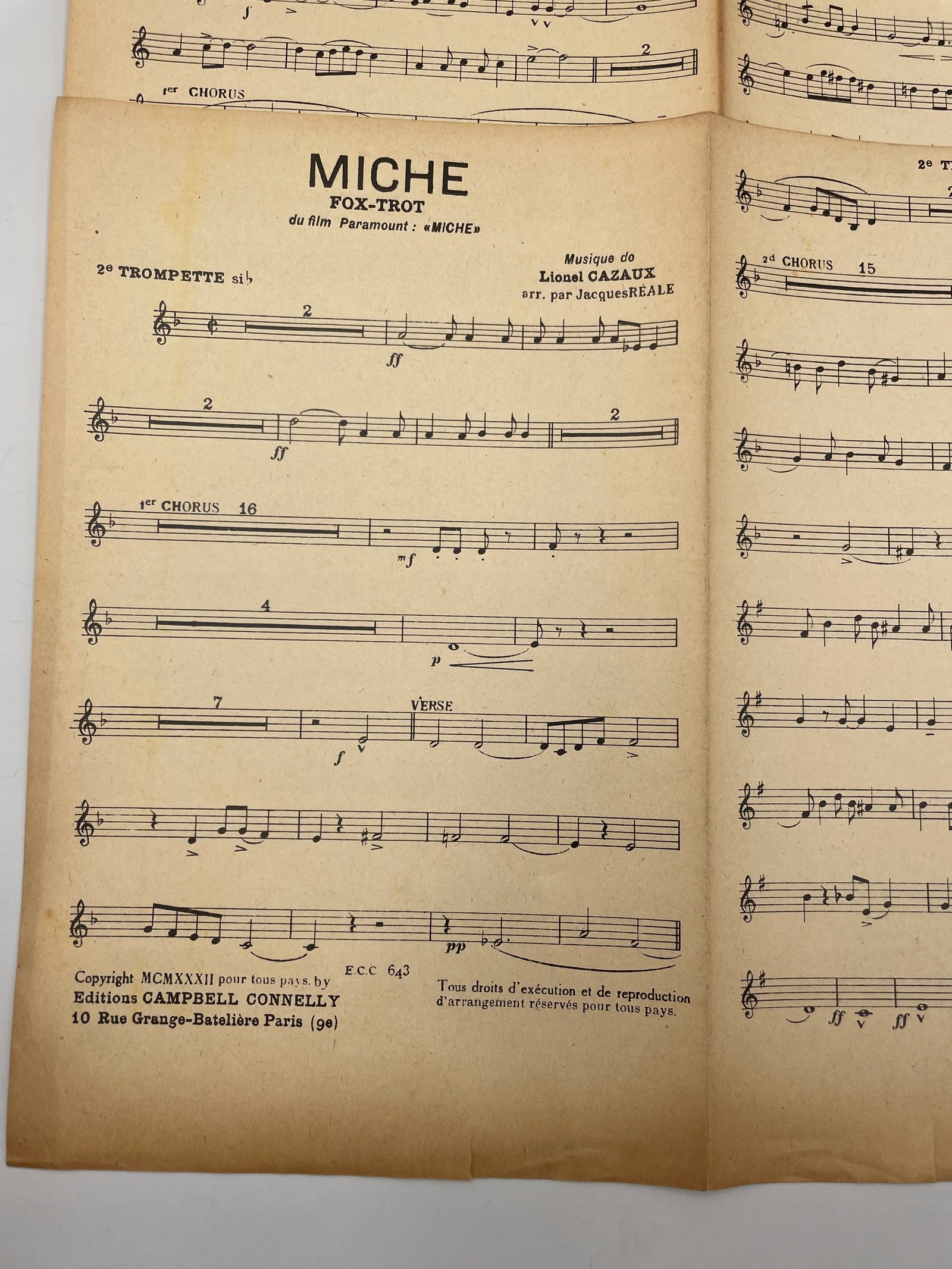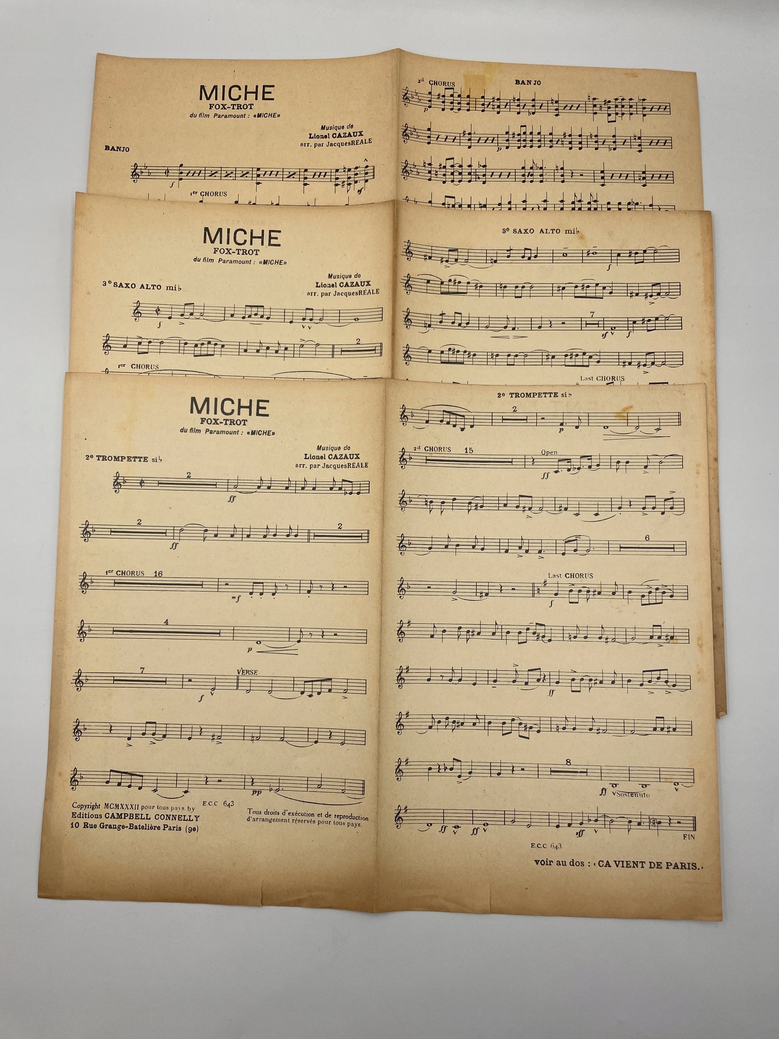 Nutowy materiał orkiestrowy z Francji z 1933 roku zawiera dwa utwory: foxtrot Miche oraz one step Ça vient de Paris. Obie kompozycje pochodzą z filmów i zostały wydane przez Campbell Connelly w Paryżu. Aranżacje przygotował Jacques Rales. Kompozytor utworu Miche — Lionel Cazaux, Ça vient de Paris — Marc Helling. W skład kompletu wchodzą głosy na banjo, saksofon altowy i trąbkę. Nuty wydrukowane na trzech dwustronnych arkuszach.