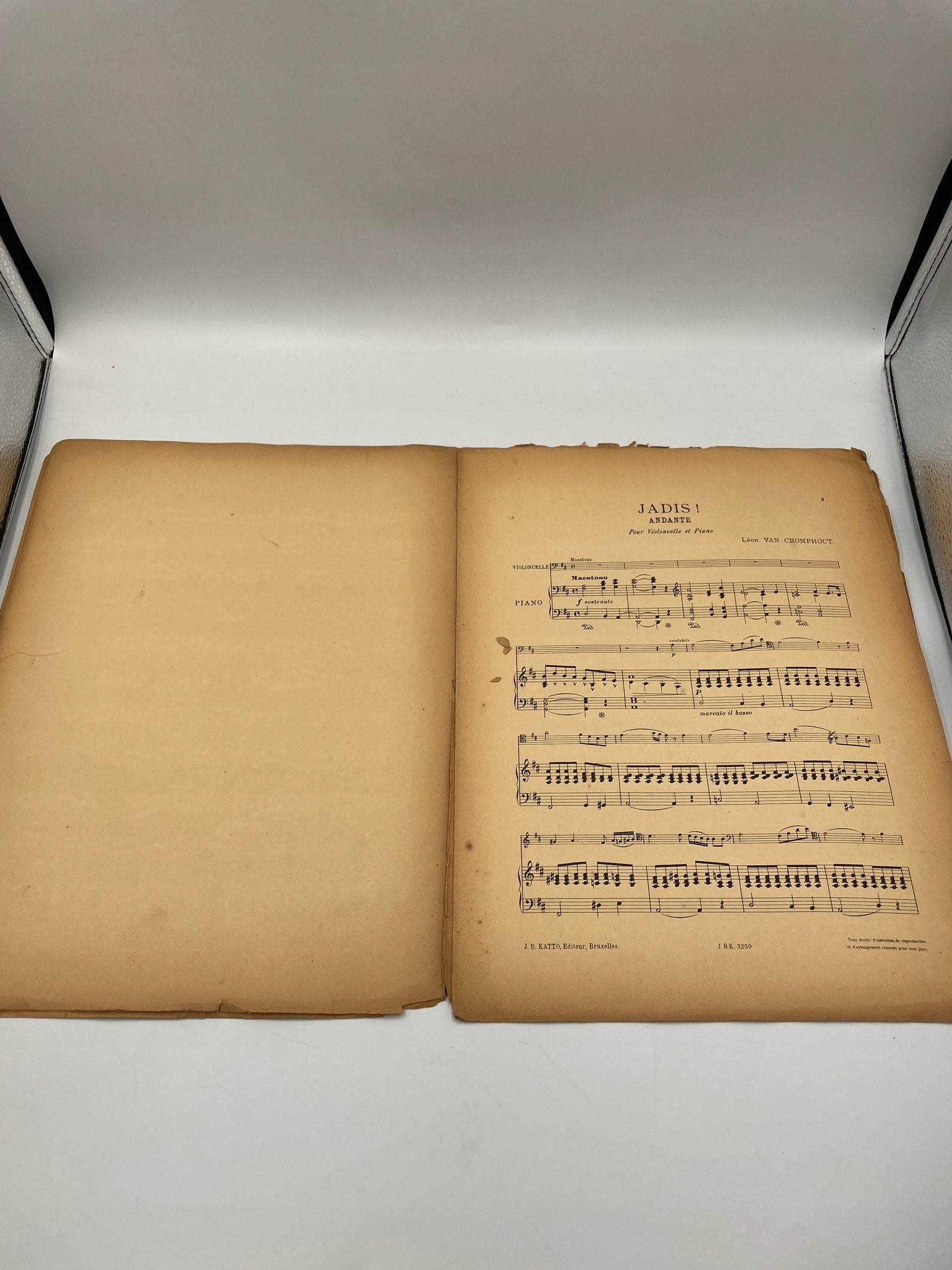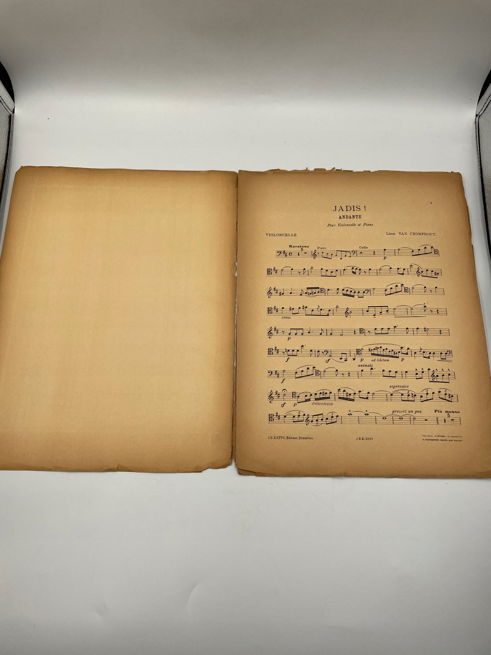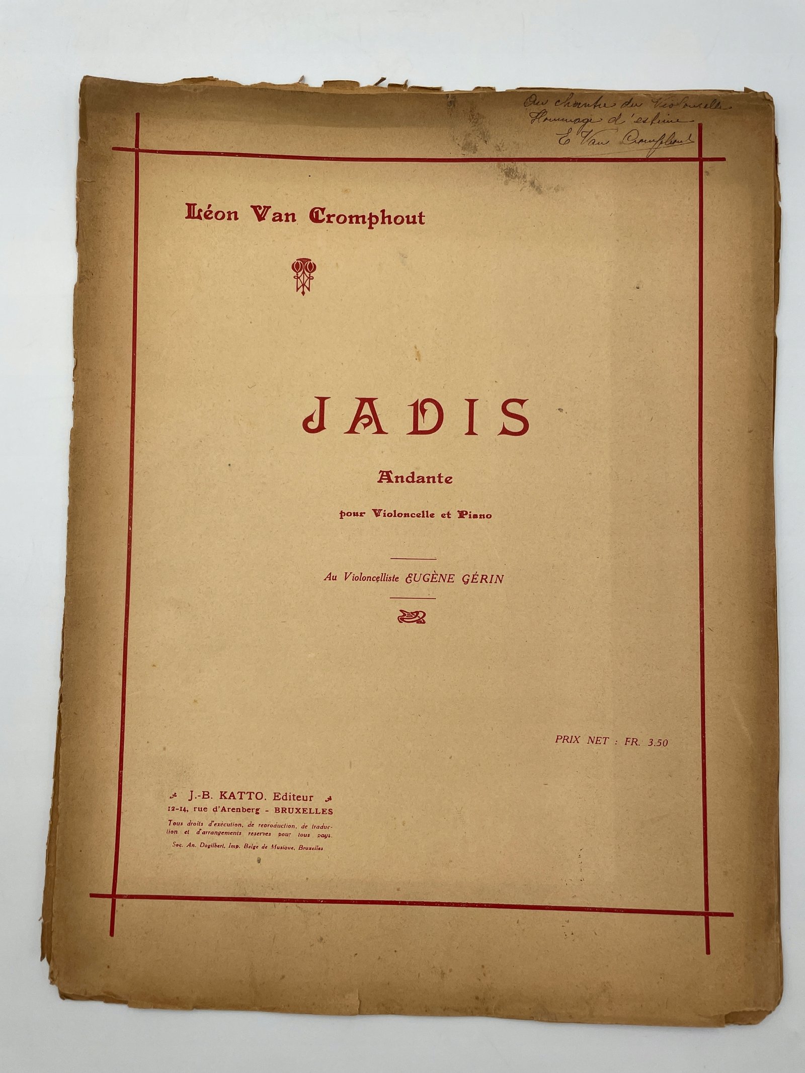 Nut belgijskiego wydania z początku XX wieku z kompozycją „Jadis” autorstwa Léona Van Cromphouta na wiolonczelę i fortepian. Dedykacja dla wiolonczelisty Eugène’a Gérina, z autografem kompozytora na okładce. Wydawnictwo J.-B. Katto, Bruksela