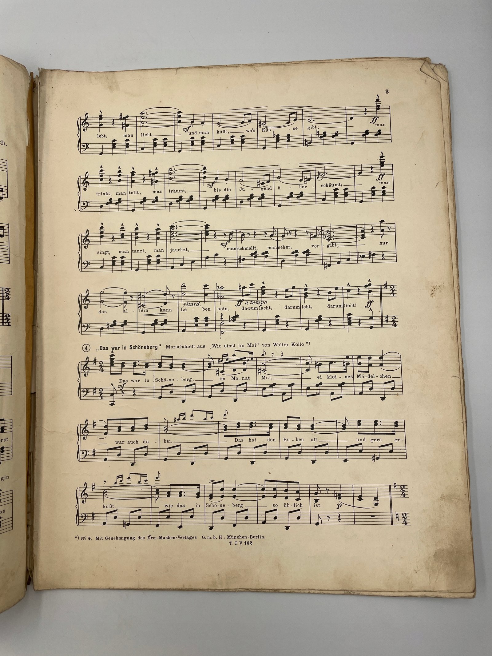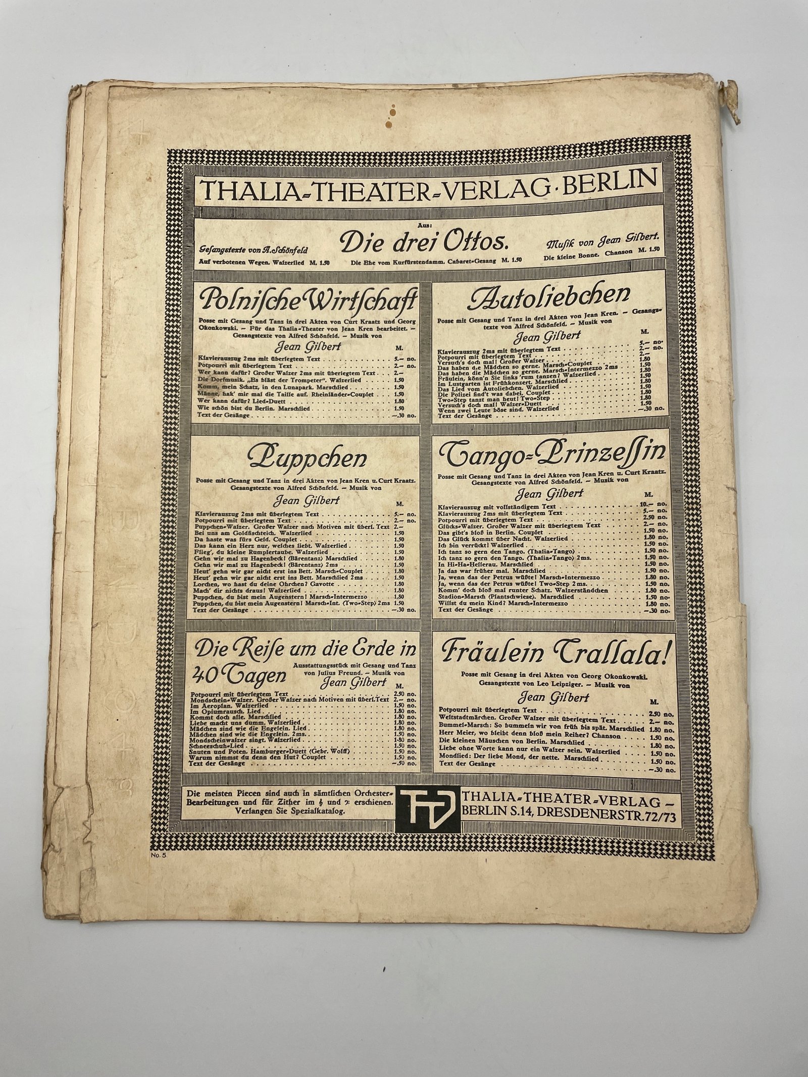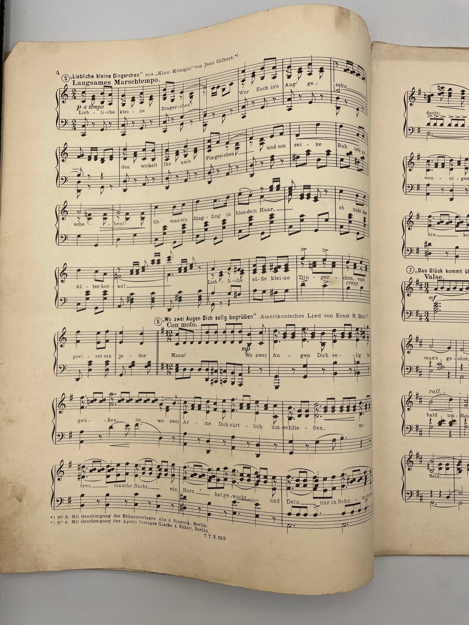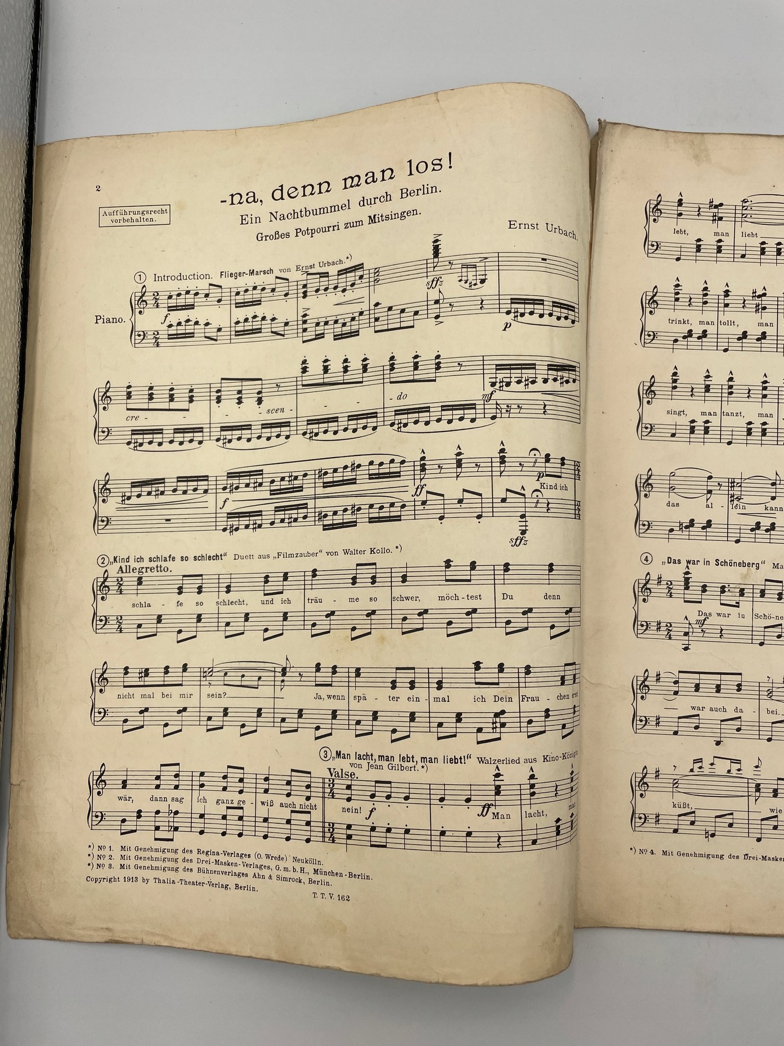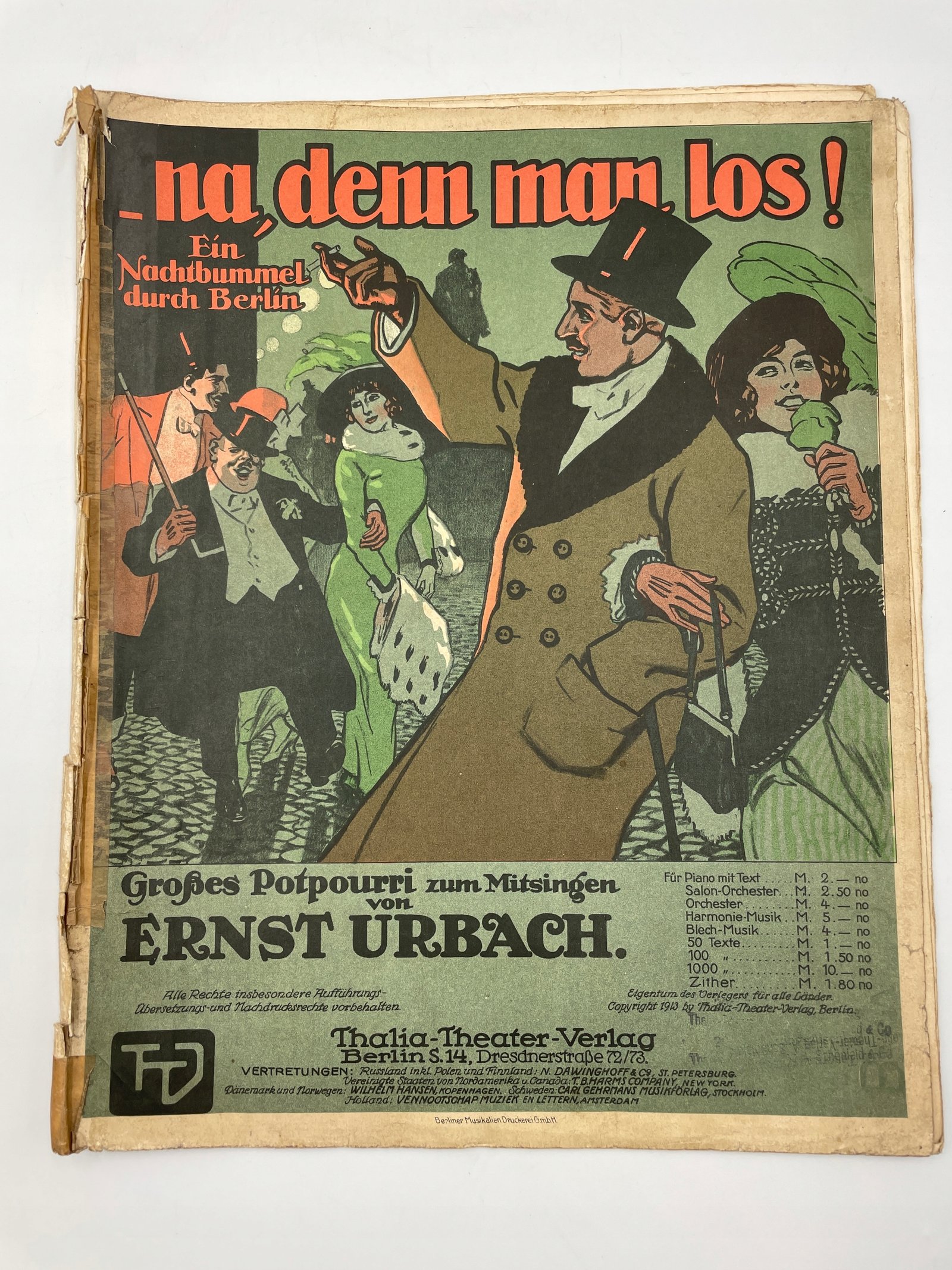 Rzadkie oryginalne wydanie nut „Na, denn man los!” — wielkie potpourri do wspólnego śpiewania z fortepianem, skomponowane przez Ernsta Urbacha. Utwór oddaje atmosferę nocnych wędrówek po Berlinie na początku XX wieku i zawiera popularne melodie i satyryczne kuplety w stylu kabaretowym. Wydane przez Thalia-Theater-Verlag, Berlin, w roku 1913.