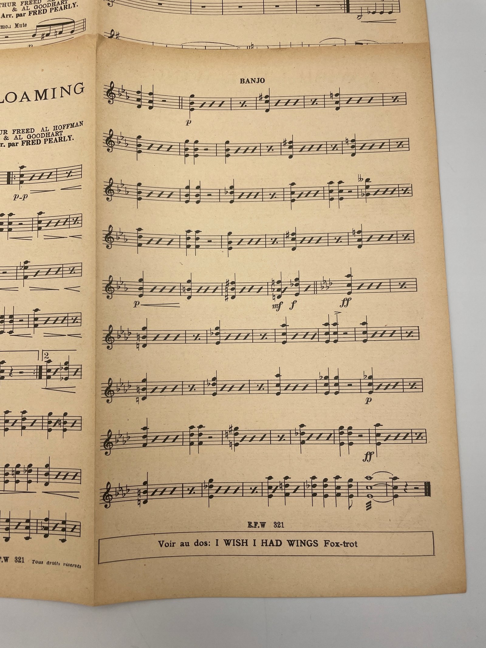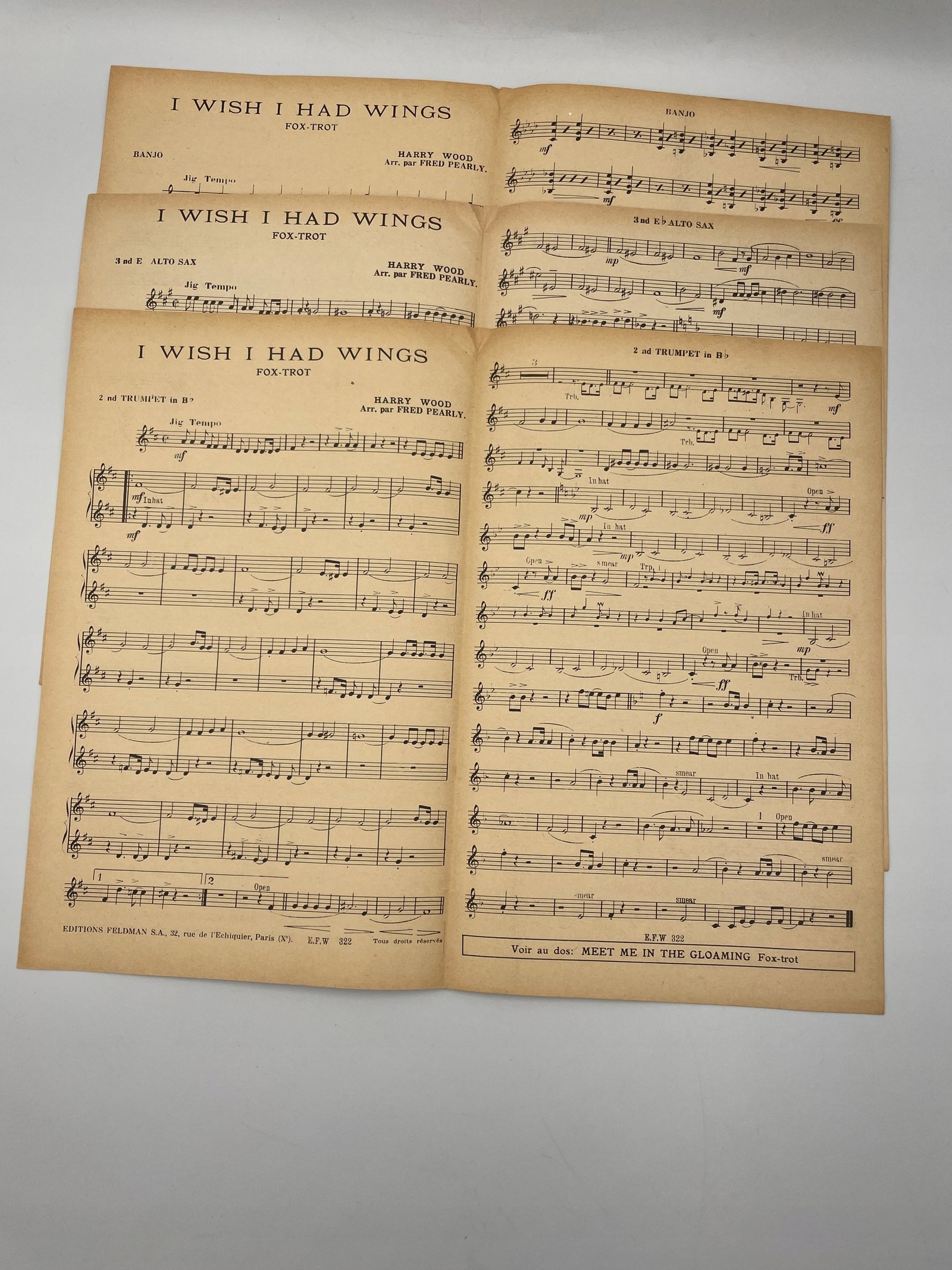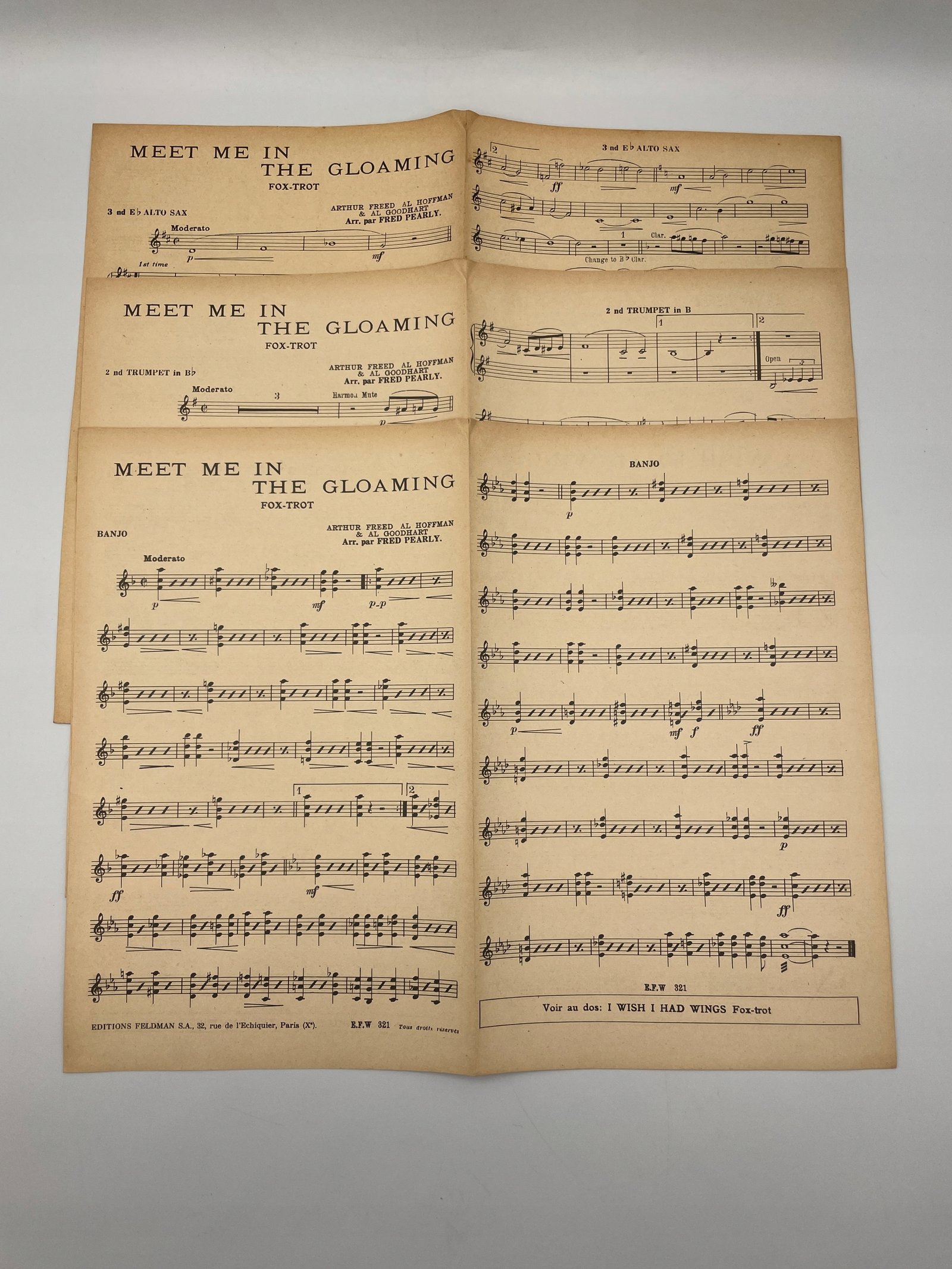 Nuty orkiestrowe zawierające dwa popularne foxtroty: „Meet Me In The Gloaming” (muzyka: Arthur Freed i Al Hoffman) oraz „I Wish I Had Wings” (muzyka: Harry Wood), w aranżacji Freda Pearly’ego. Wydane przez francuskie wydawnictwo Editions Feldman z Paryża. Komplet obejmuje trzy dwustronne arkusze z partiami dla saksofonu, trąbki i banjo. Styl typograficzny wskazuje na lata 30. XX wieku. Stan dobry, papier z naturalną patyną starzenia.