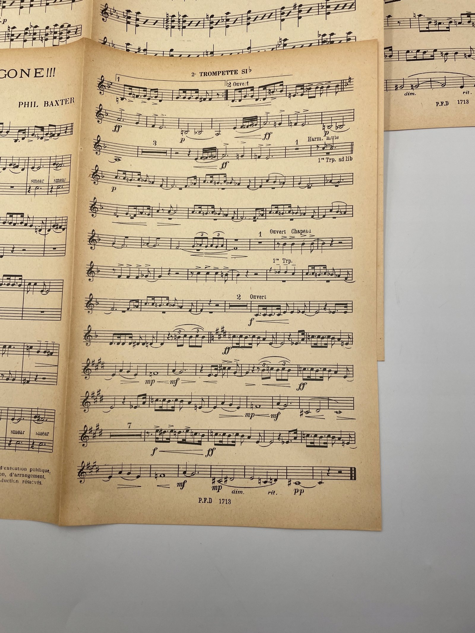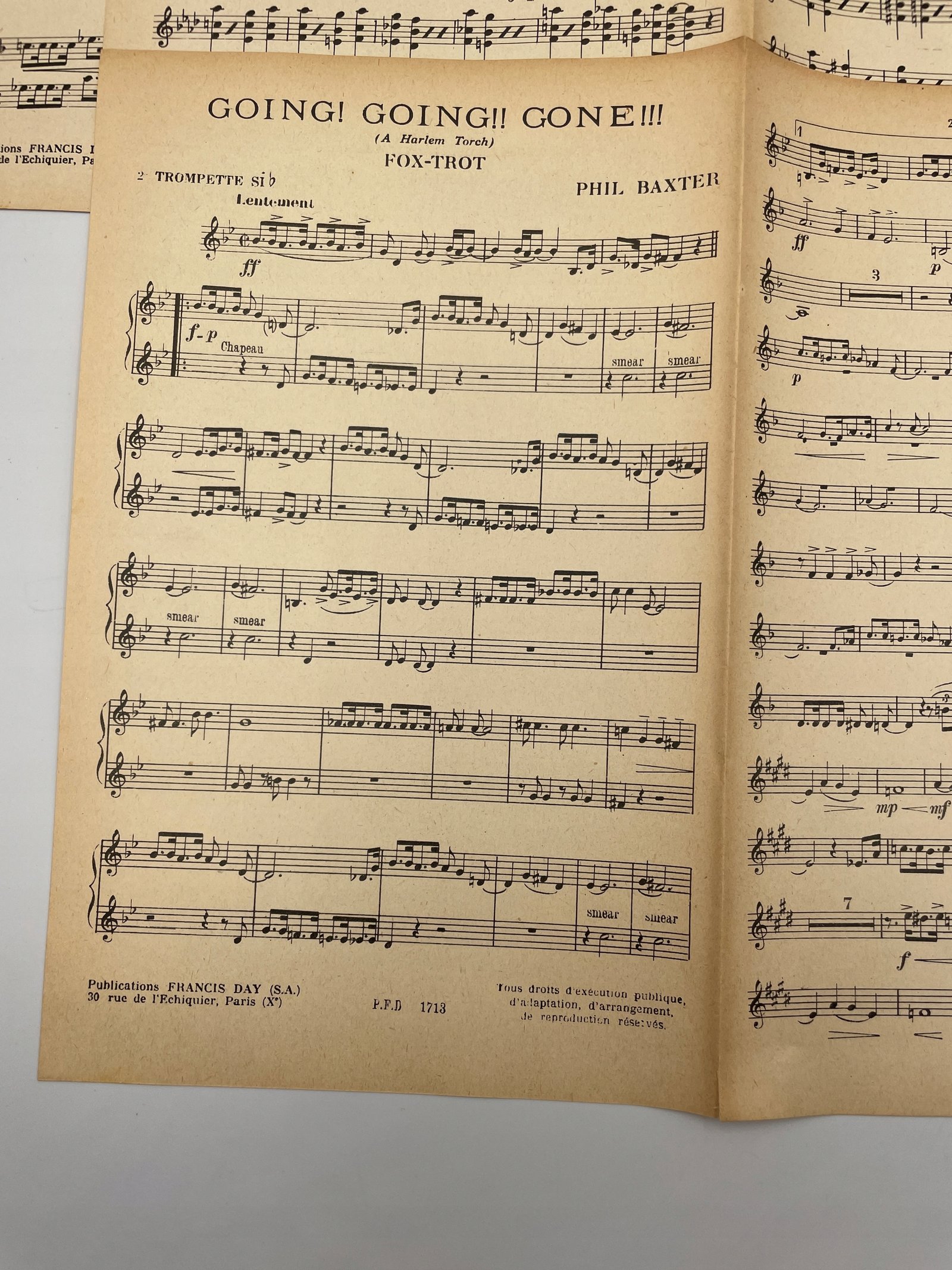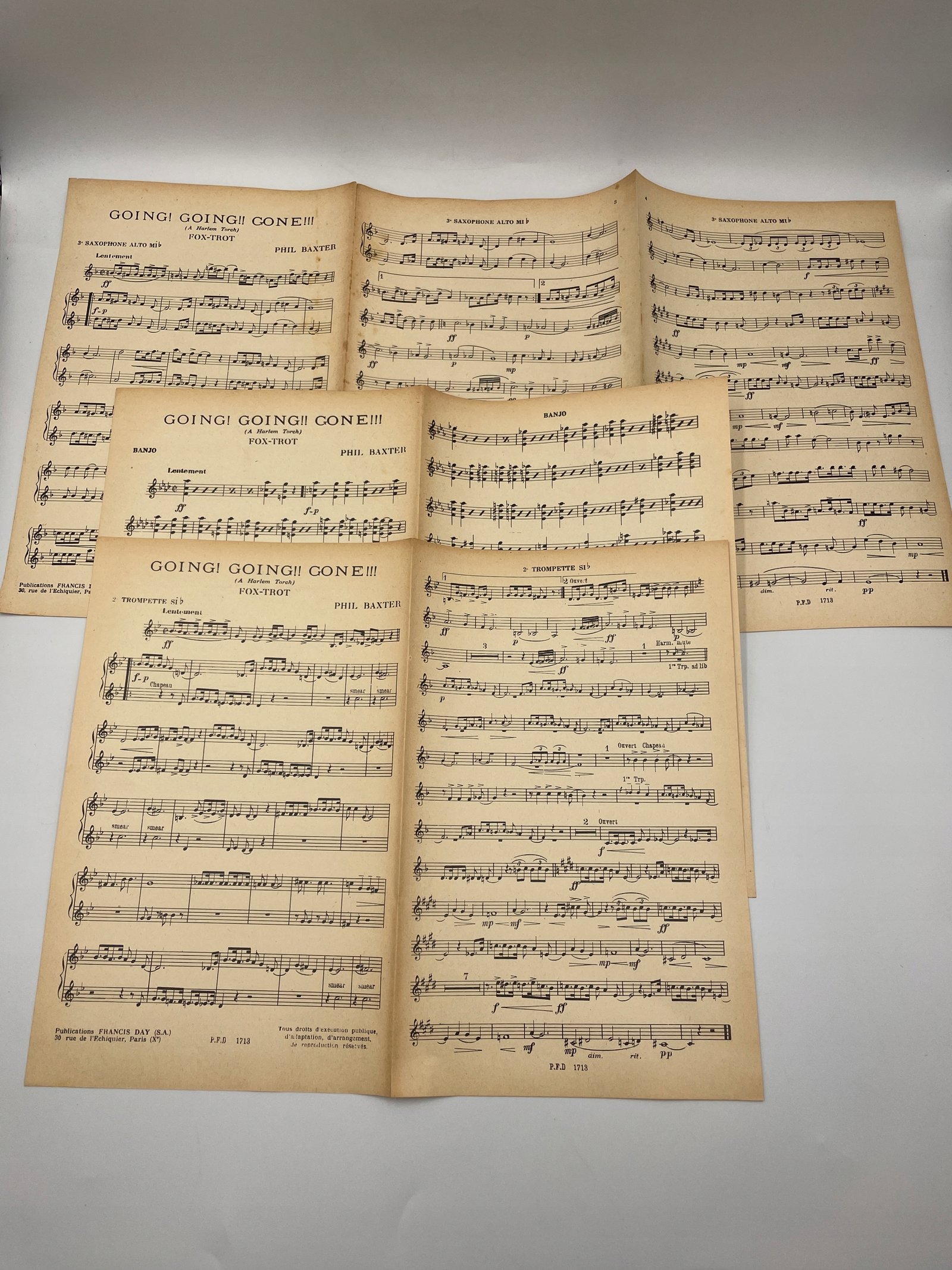 Nuty do utworu „Going! Going!! Gone!!! (A Harlem Torch)” w stylu foxtrot, skomponowanego przez Phila Baxtera. Wydane przez francuskie wydawnictwo „Francis Day (S.A.)”, 30 rue de l’Échiquier, Paris (Xe). Reprezentują typowy jazz taneczny z lat 30. XX wieku z okresu Harlem Renaissance. Zawierają partie dla saksofonu, banjo i trąbki. Styl graficzny oraz papier wskazują na oryginalne wydanie z epoki.
