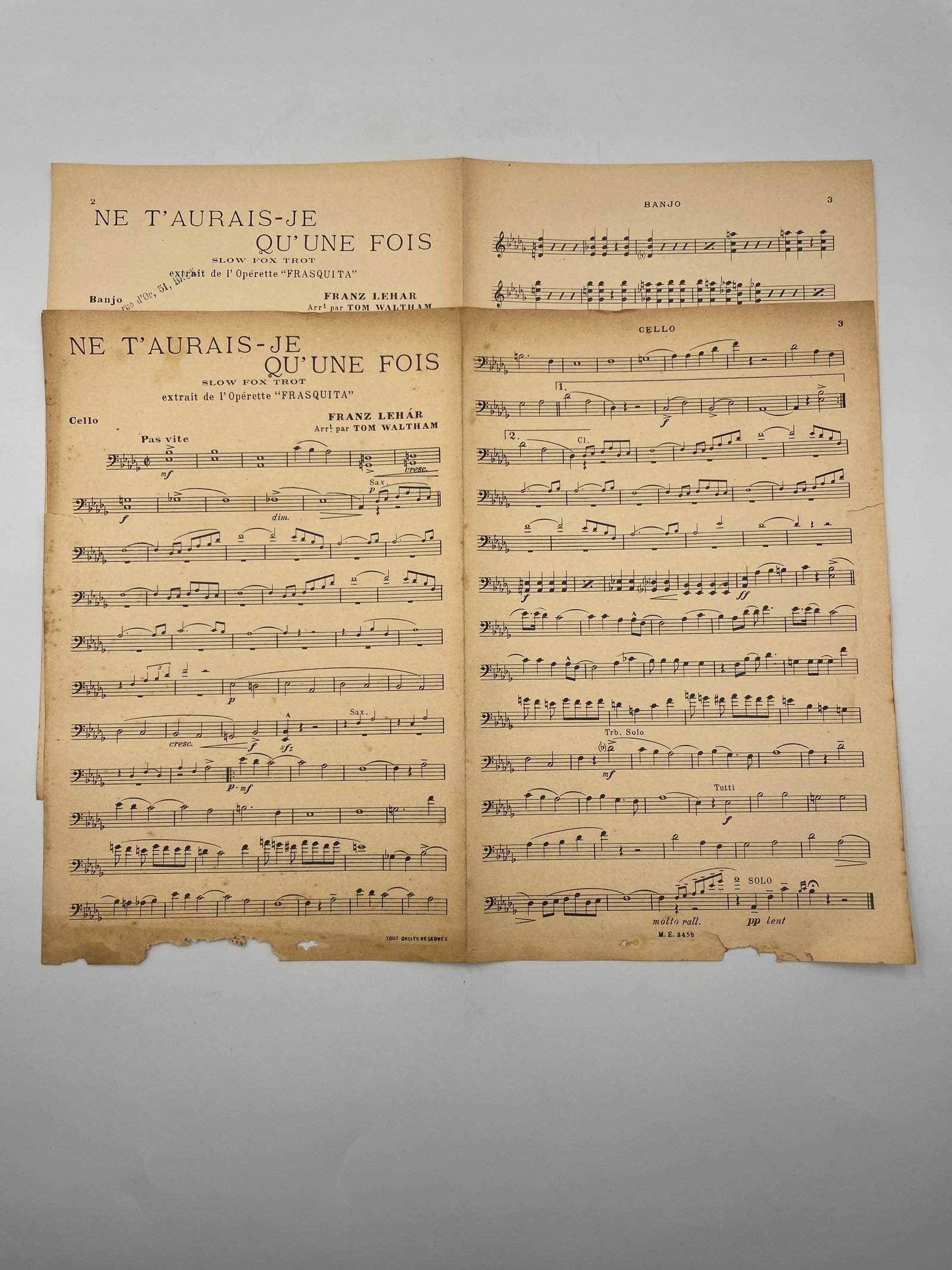 Nuty do utworu „Ne t’aurais-je qu’une fois” Franza Lehára w aranżacji Toma Walthama. Fragment operetki „Frasquita”, przekształcony w stylu slow-fox. Wydanie francuskie z lat 30. XX w. Komplet dwóch jednostronnych arkuszy przeznaczonych na wiolonczelę i banjo.