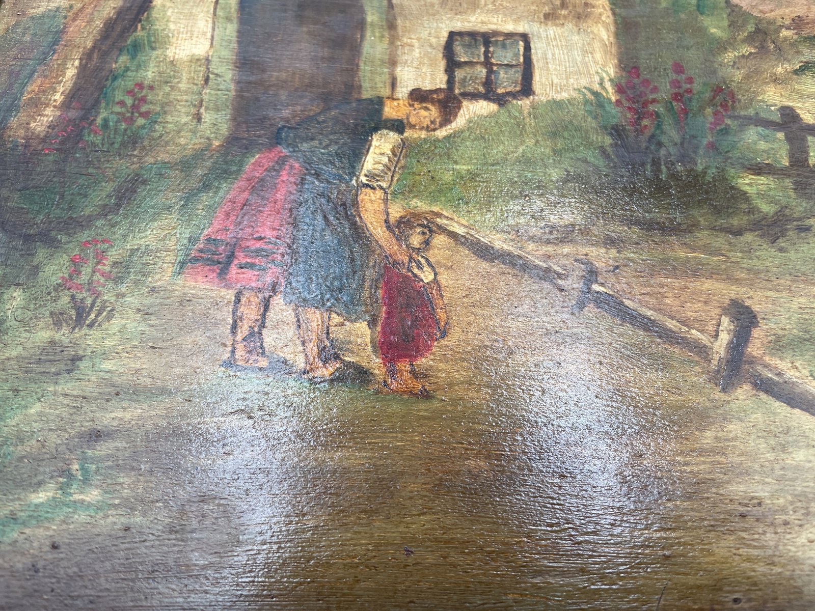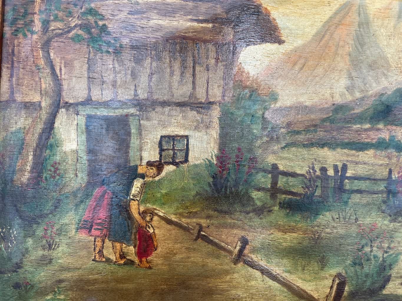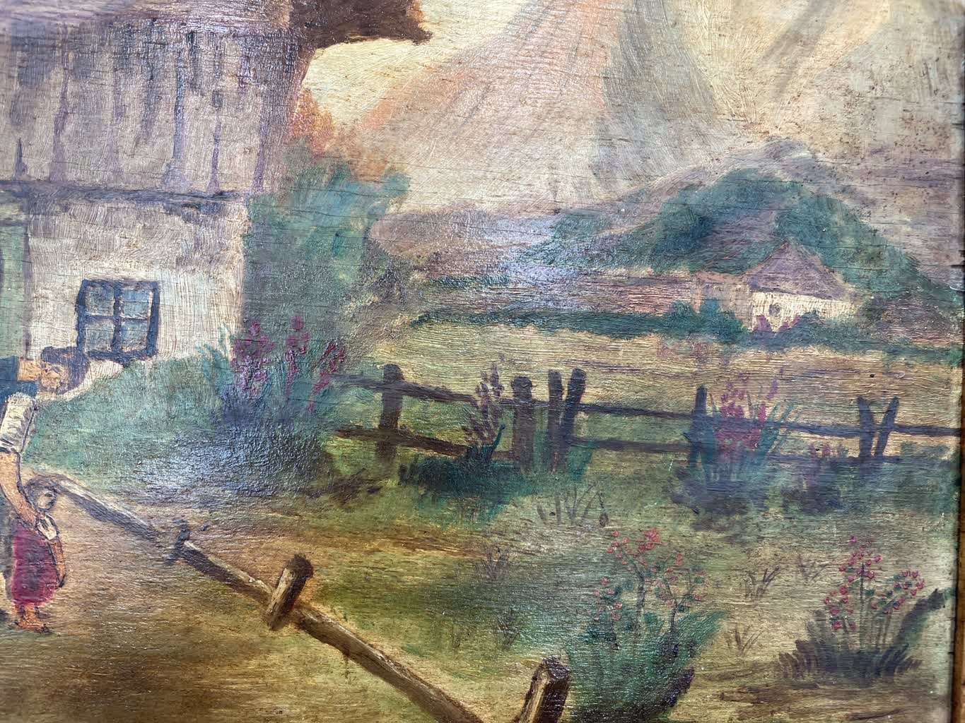 Obraz olejny wiejski dom z postaciami w górach w ramie