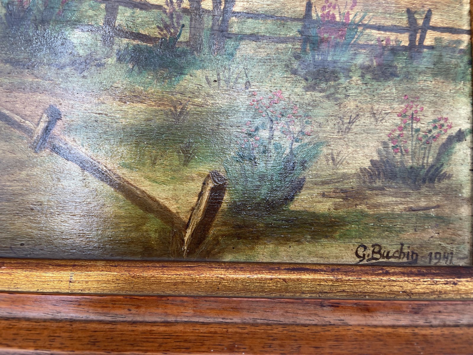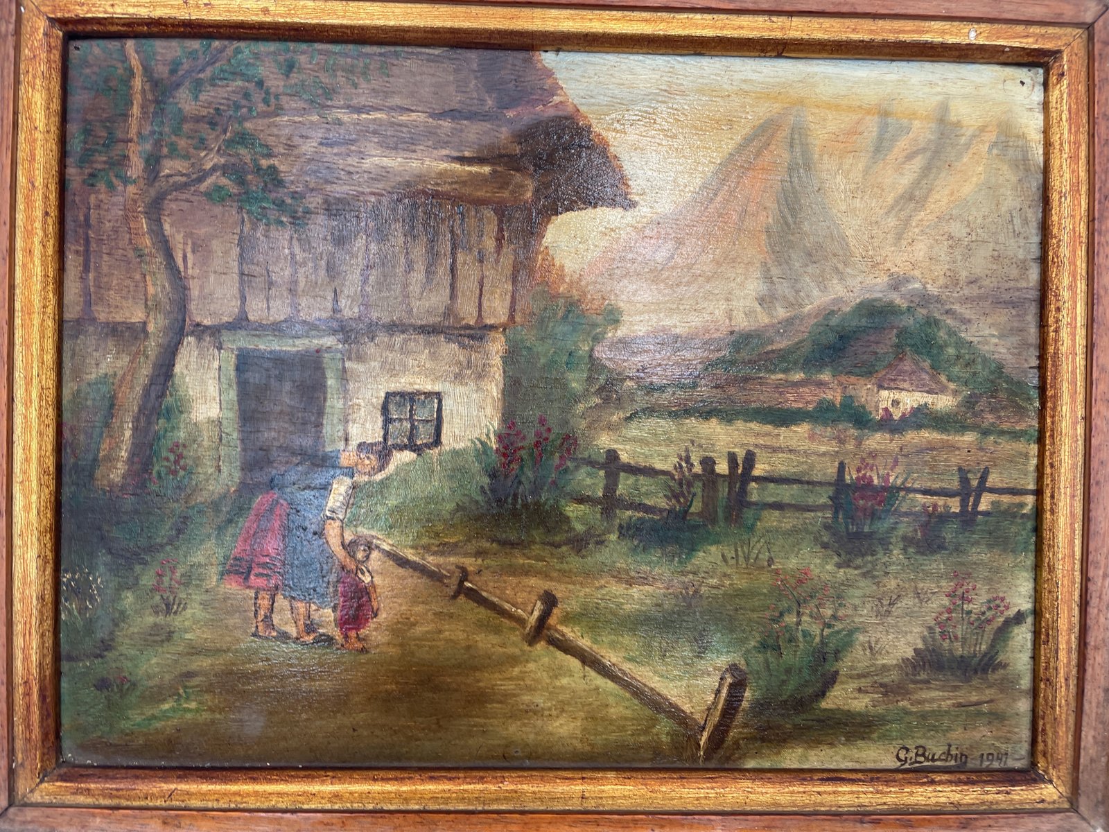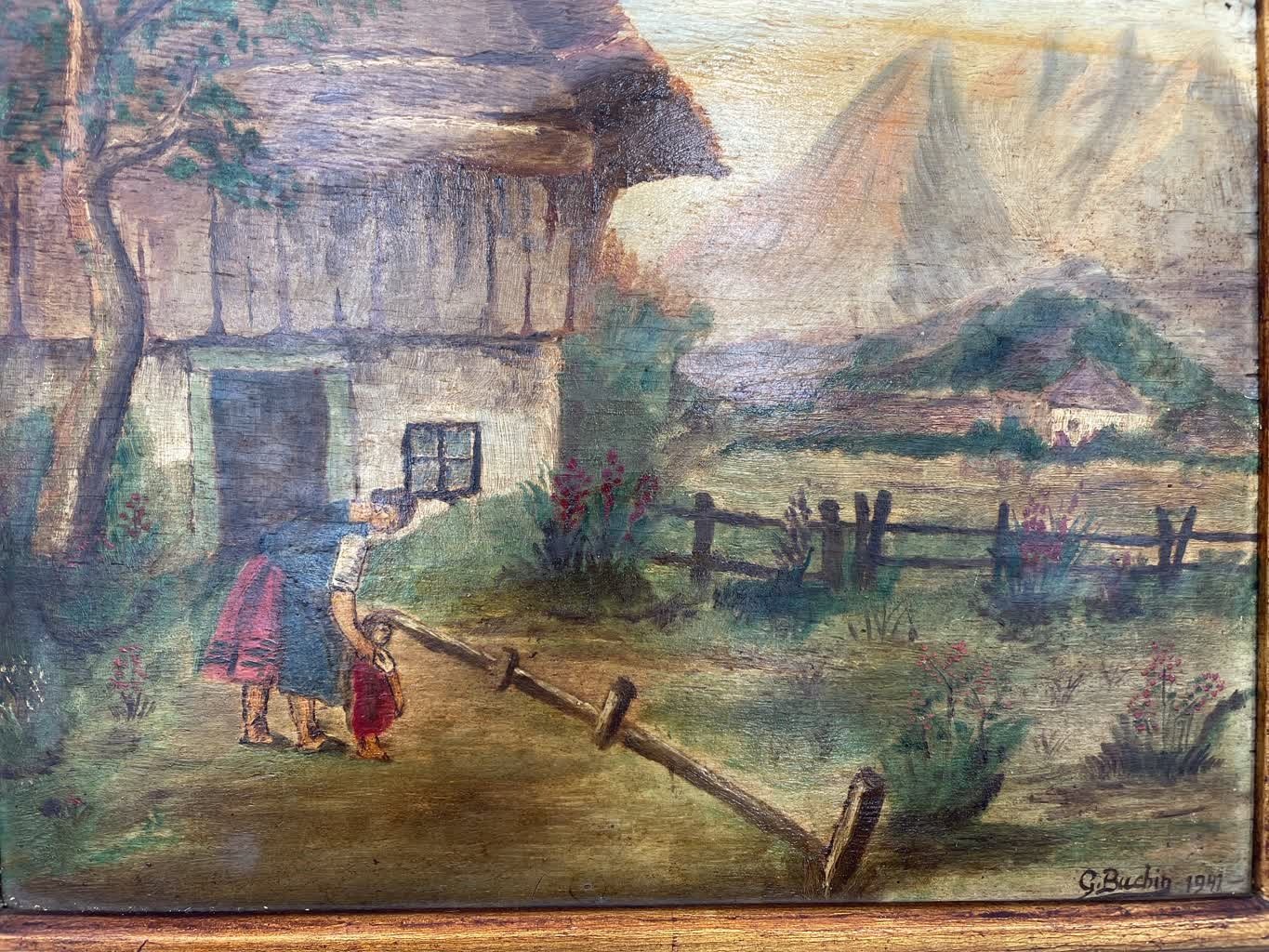 Obraz olejny wiejski dom z postaciami w górach w ramie