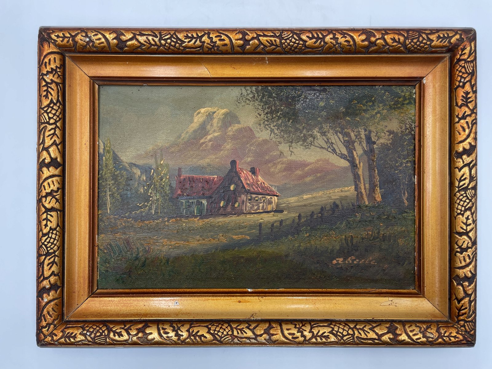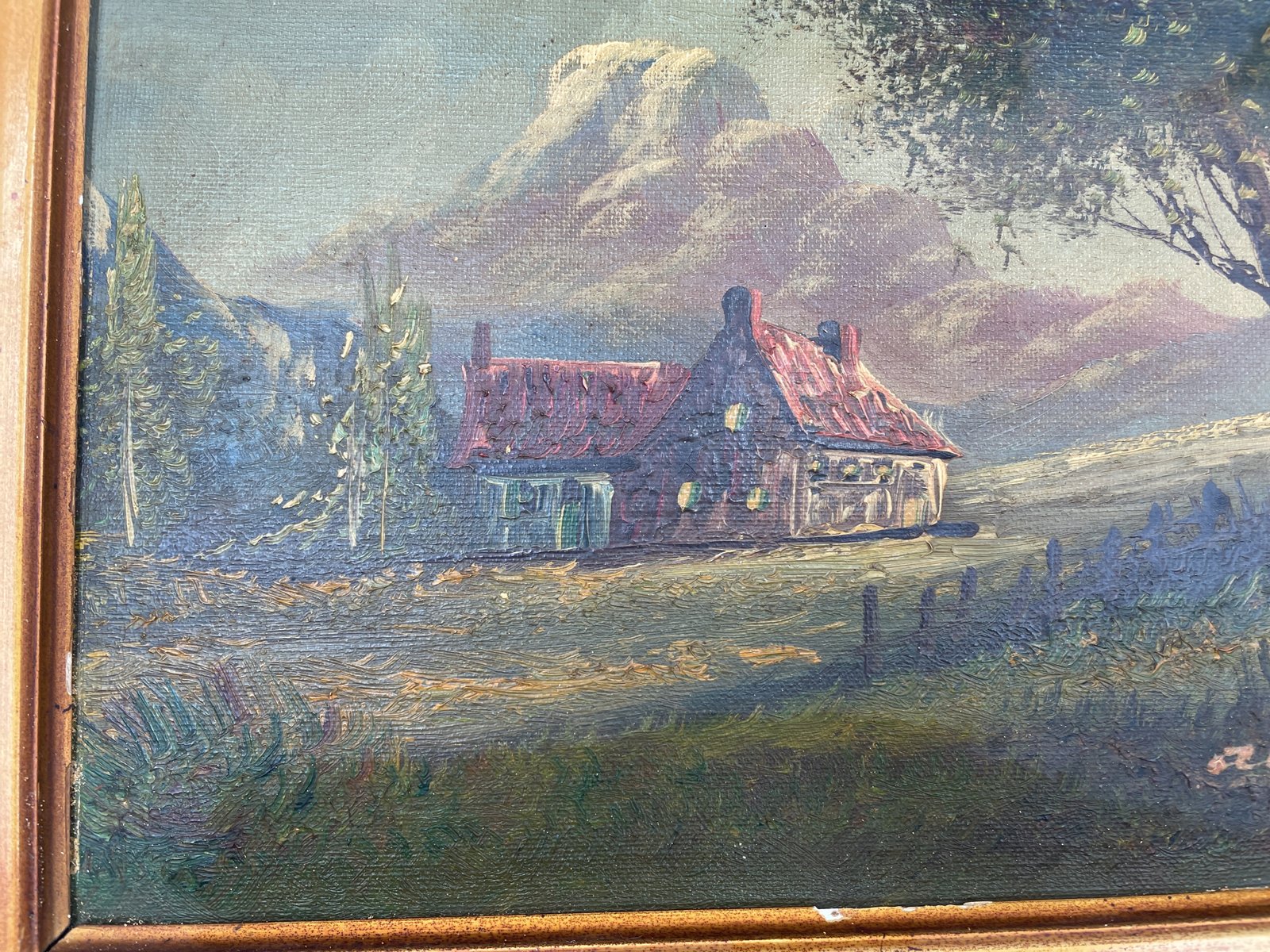 Obraz dom z czerwoną dachówką u podnóża gór w ramie