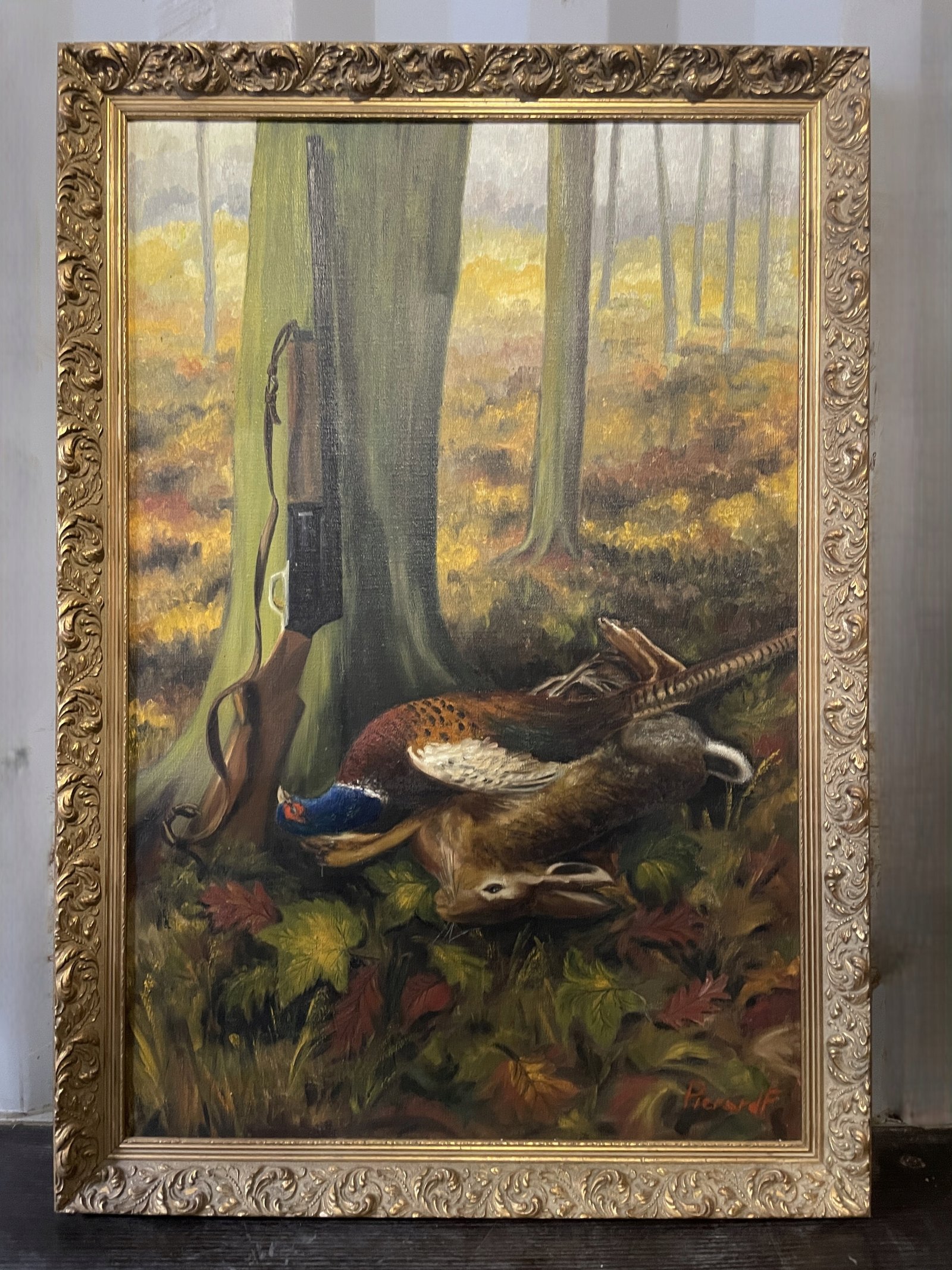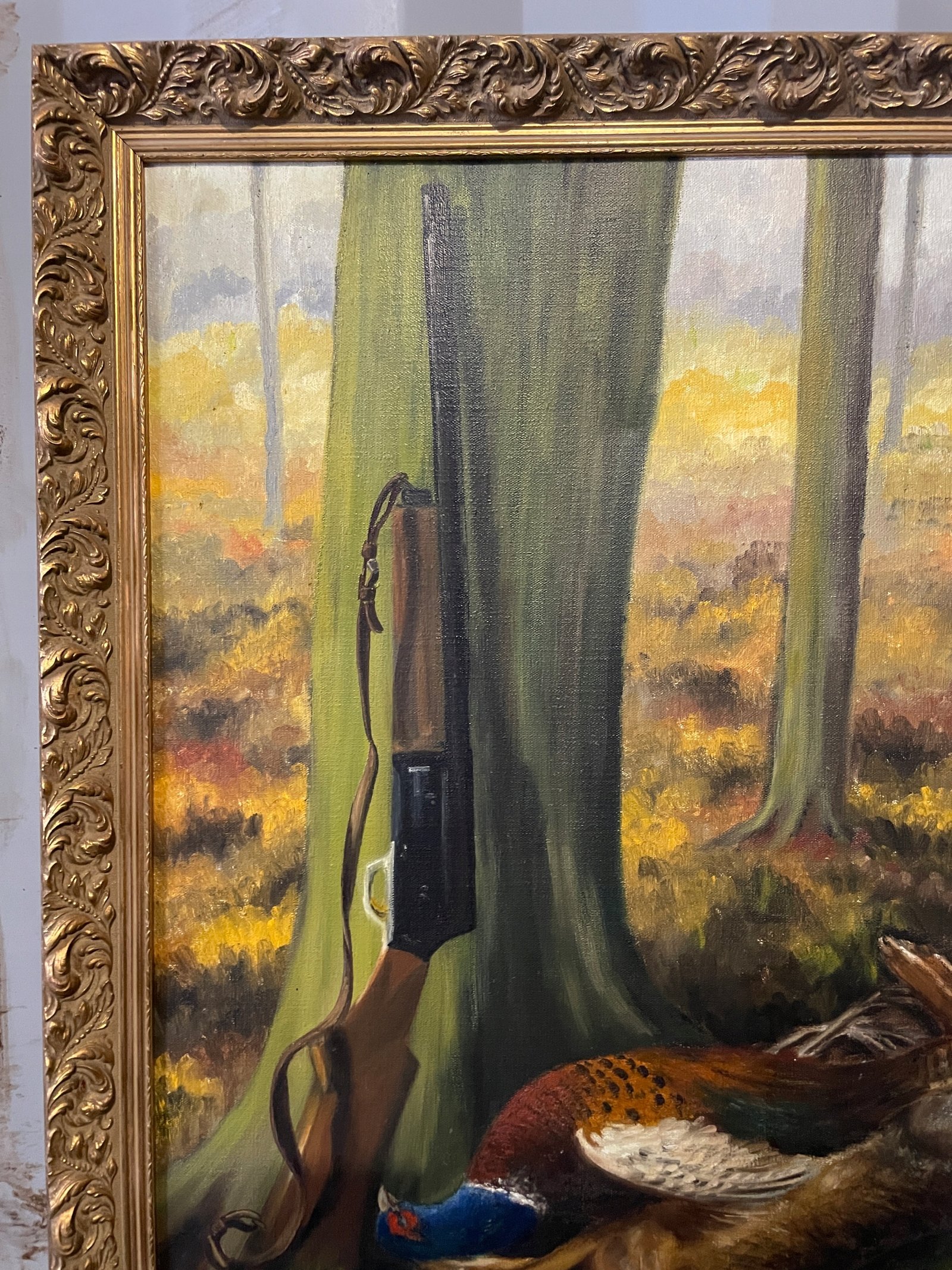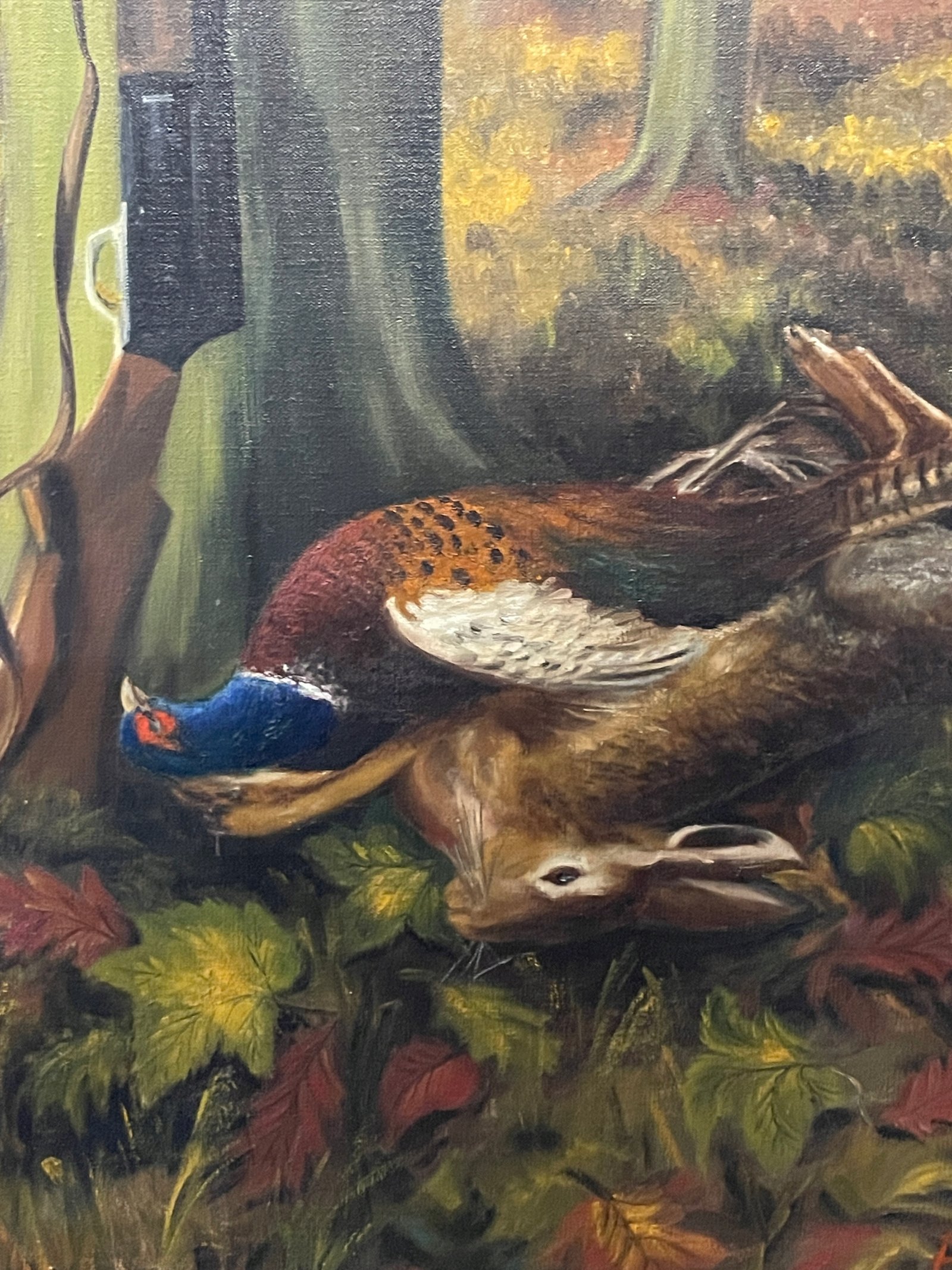 Obraz martwa natura myśliwska z bronią bażantem i zającem 98x68cm