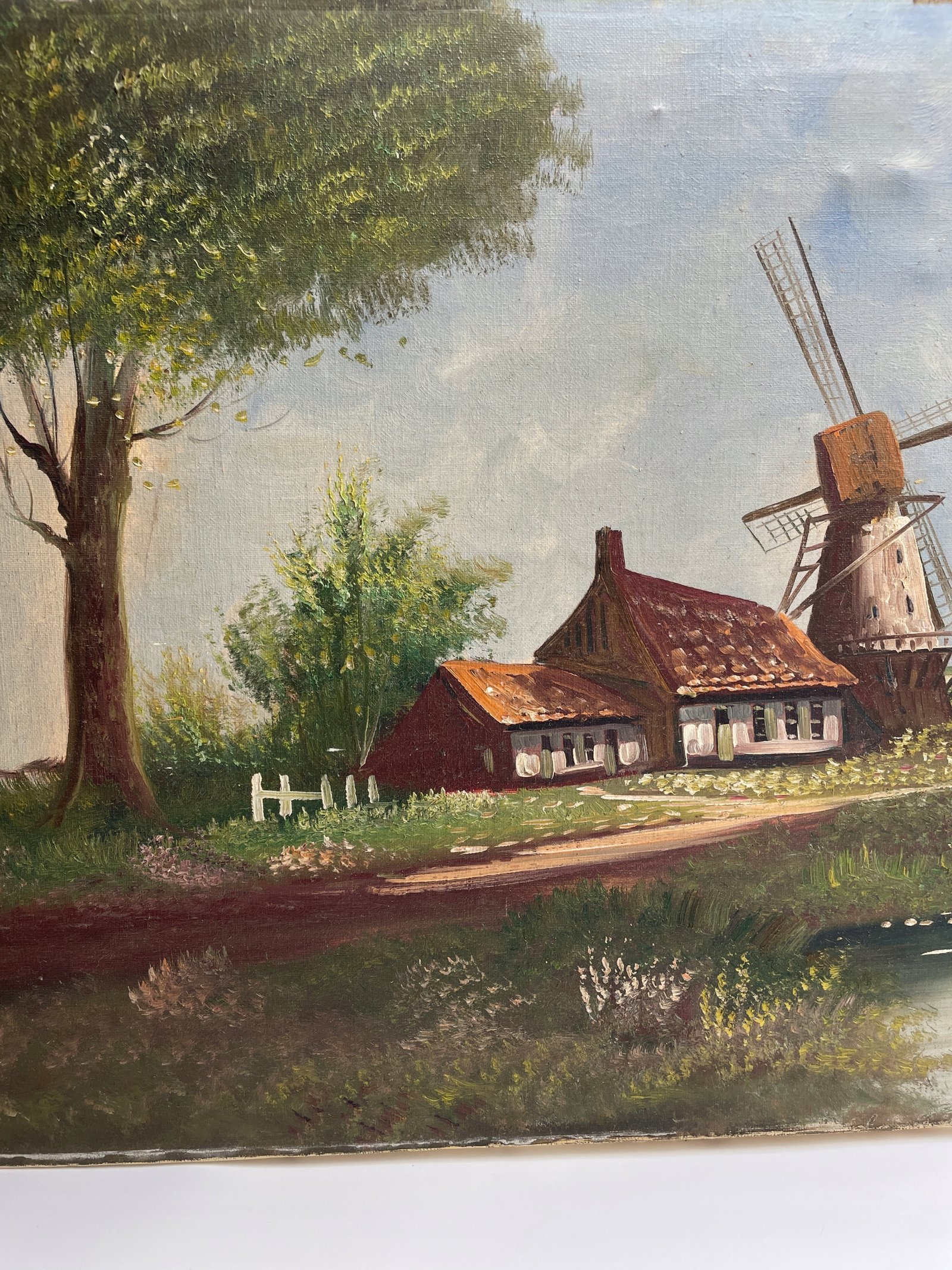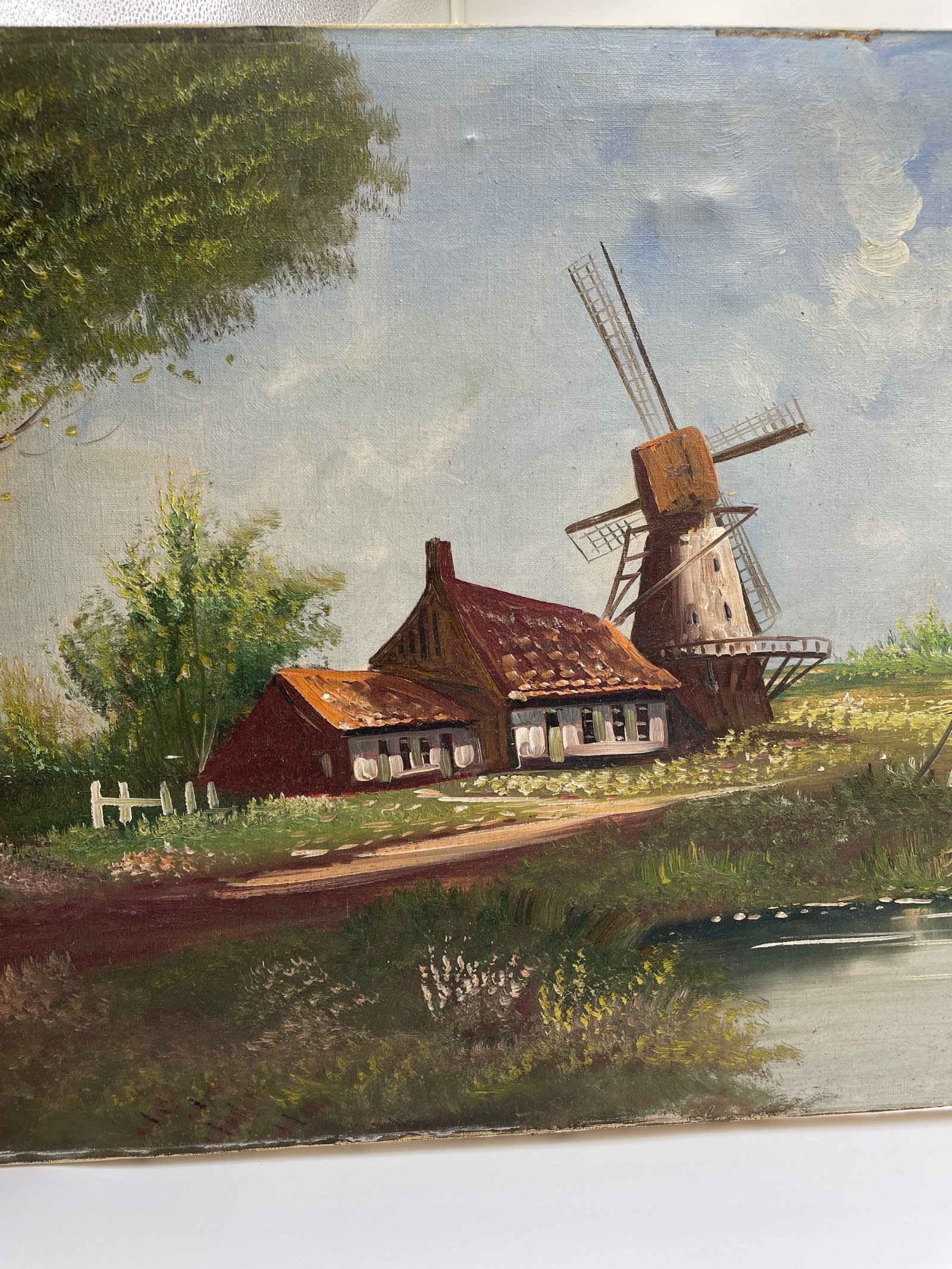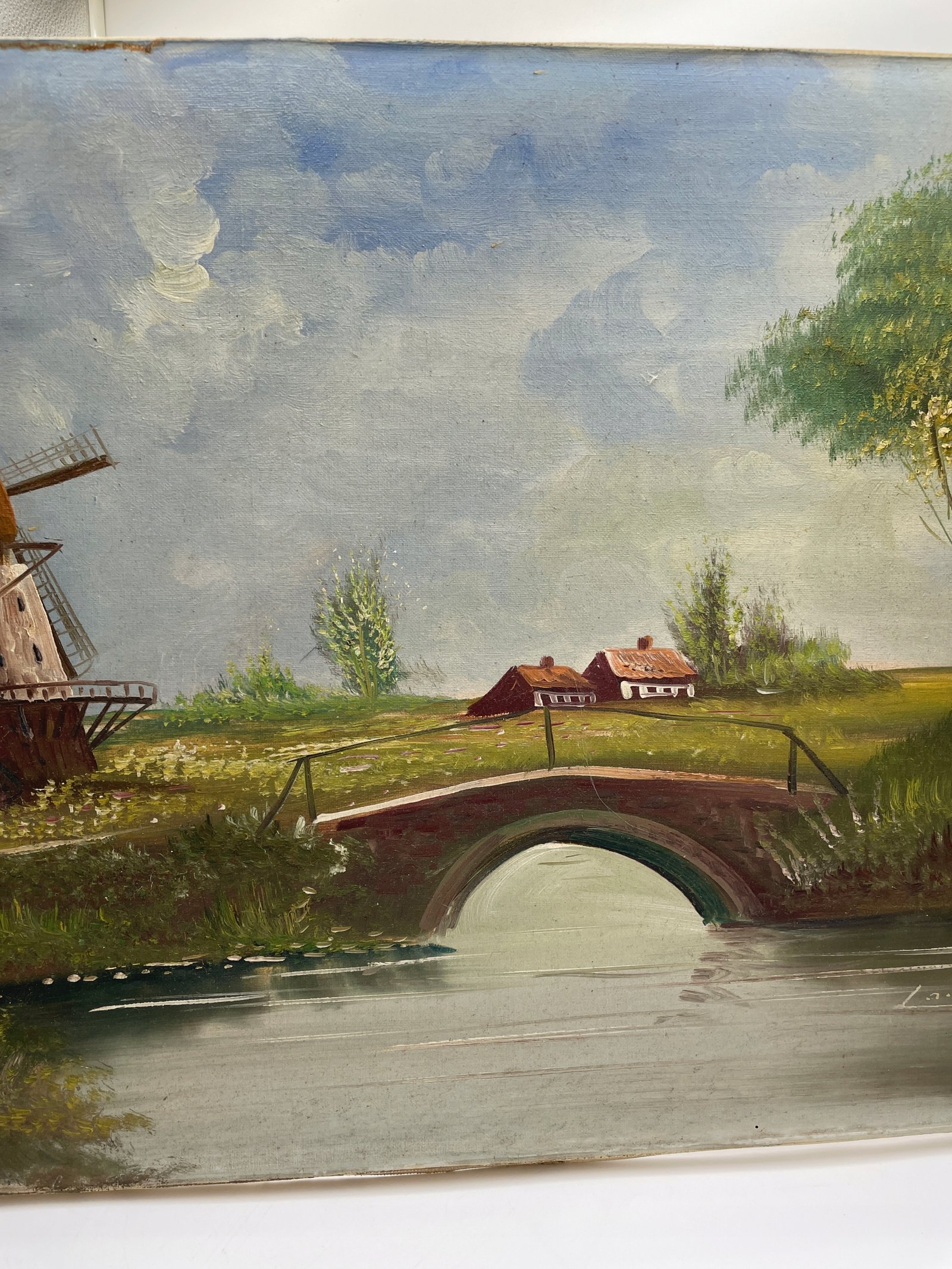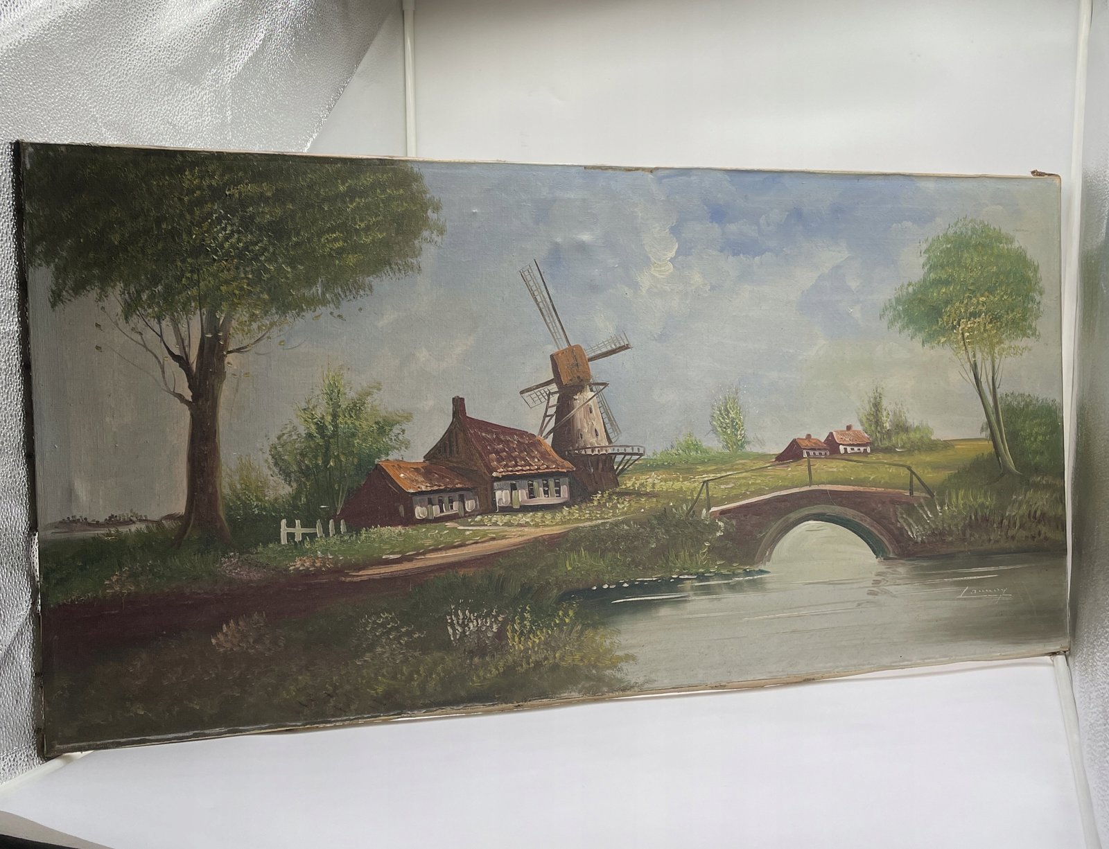 Piękny, nastrojowy pejzaż przedstawiający wiejski dom, wiatrak oraz mostek nad rzeką. Praca wykonana farbą olejną na płótnie, sygnowana przez autora (podpis widoczny na zdjęciu).