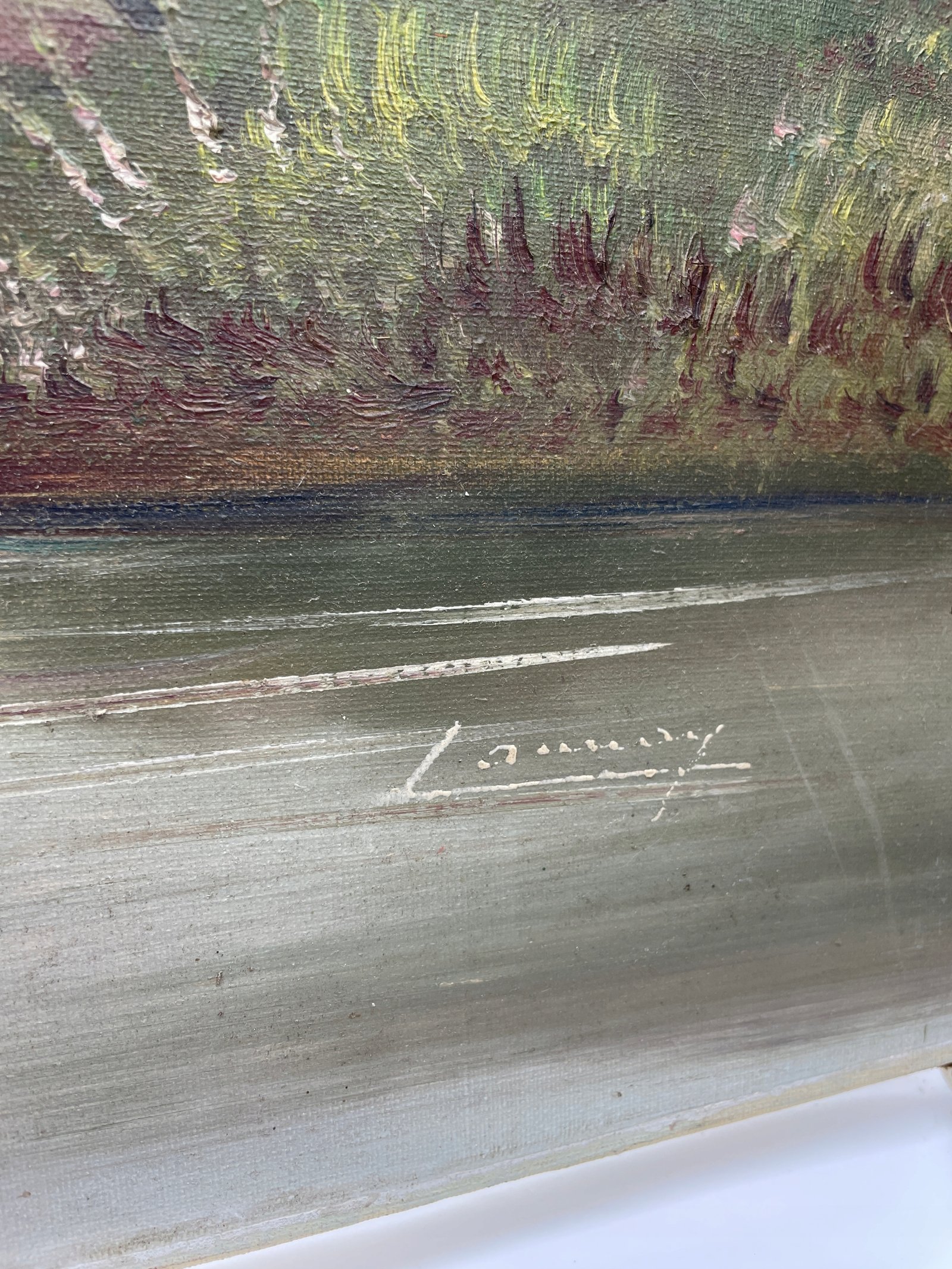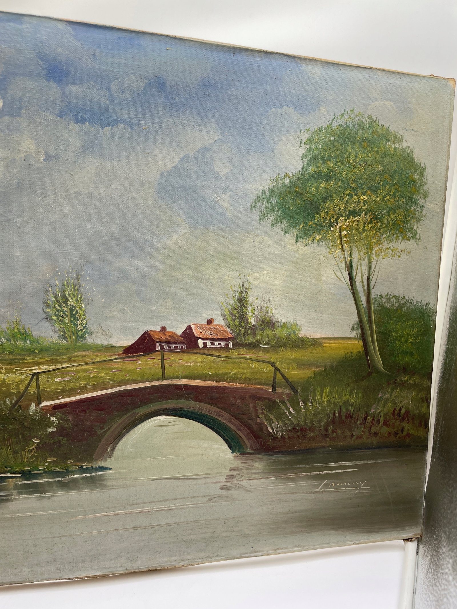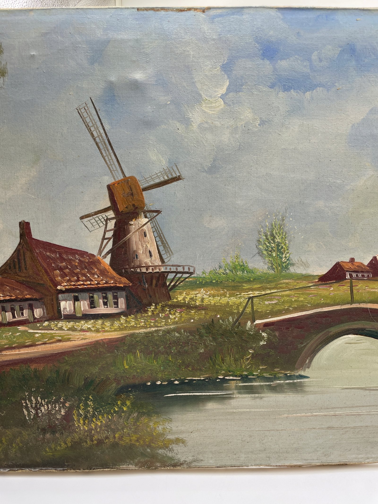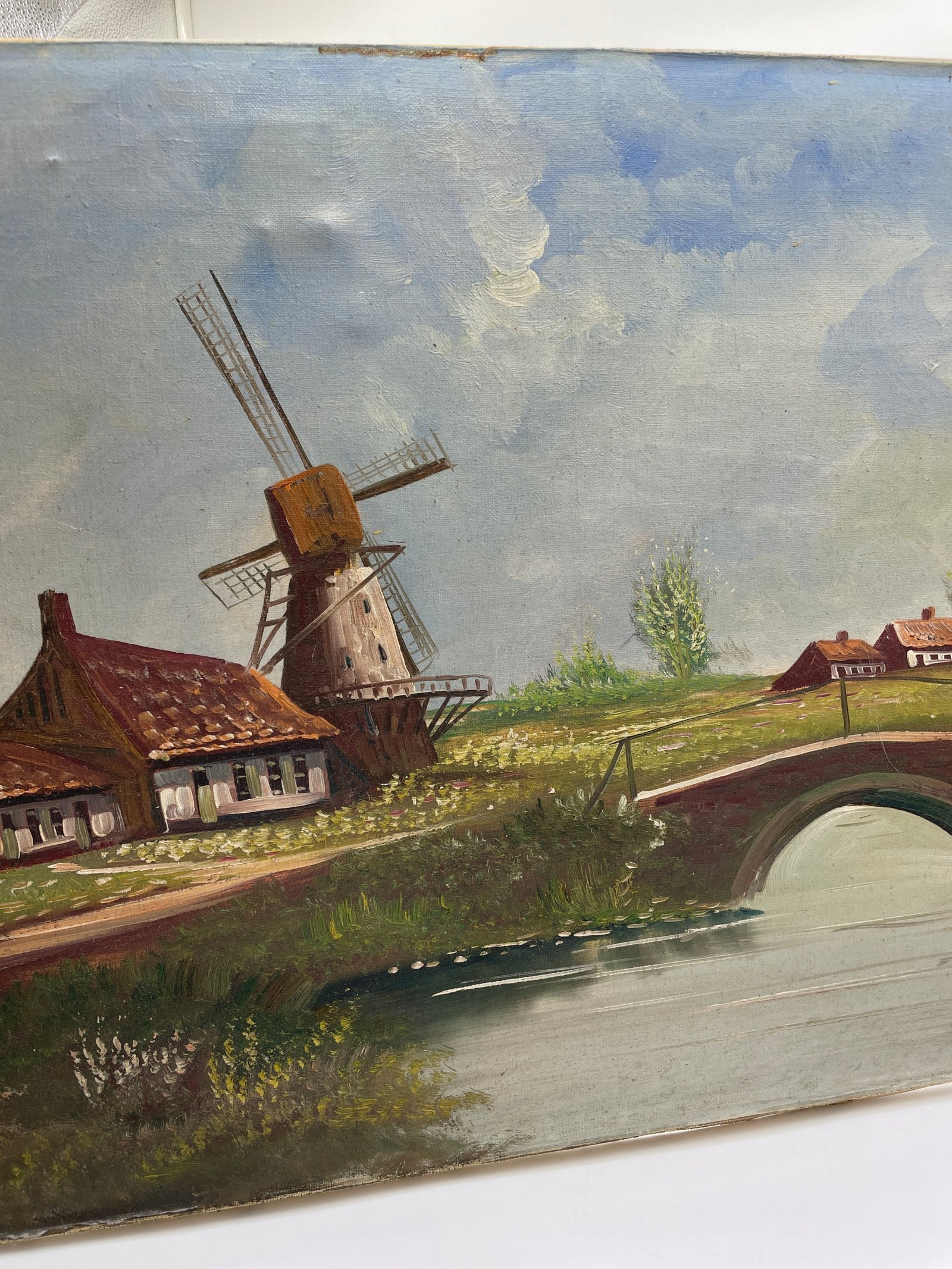 Piękny, nastrojowy pejzaż przedstawiający wiejski dom, wiatrak oraz mostek nad rzeką. Praca wykonana farbą olejną na płótnie, sygnowana przez autora (podpis widoczny na zdjęciu).
