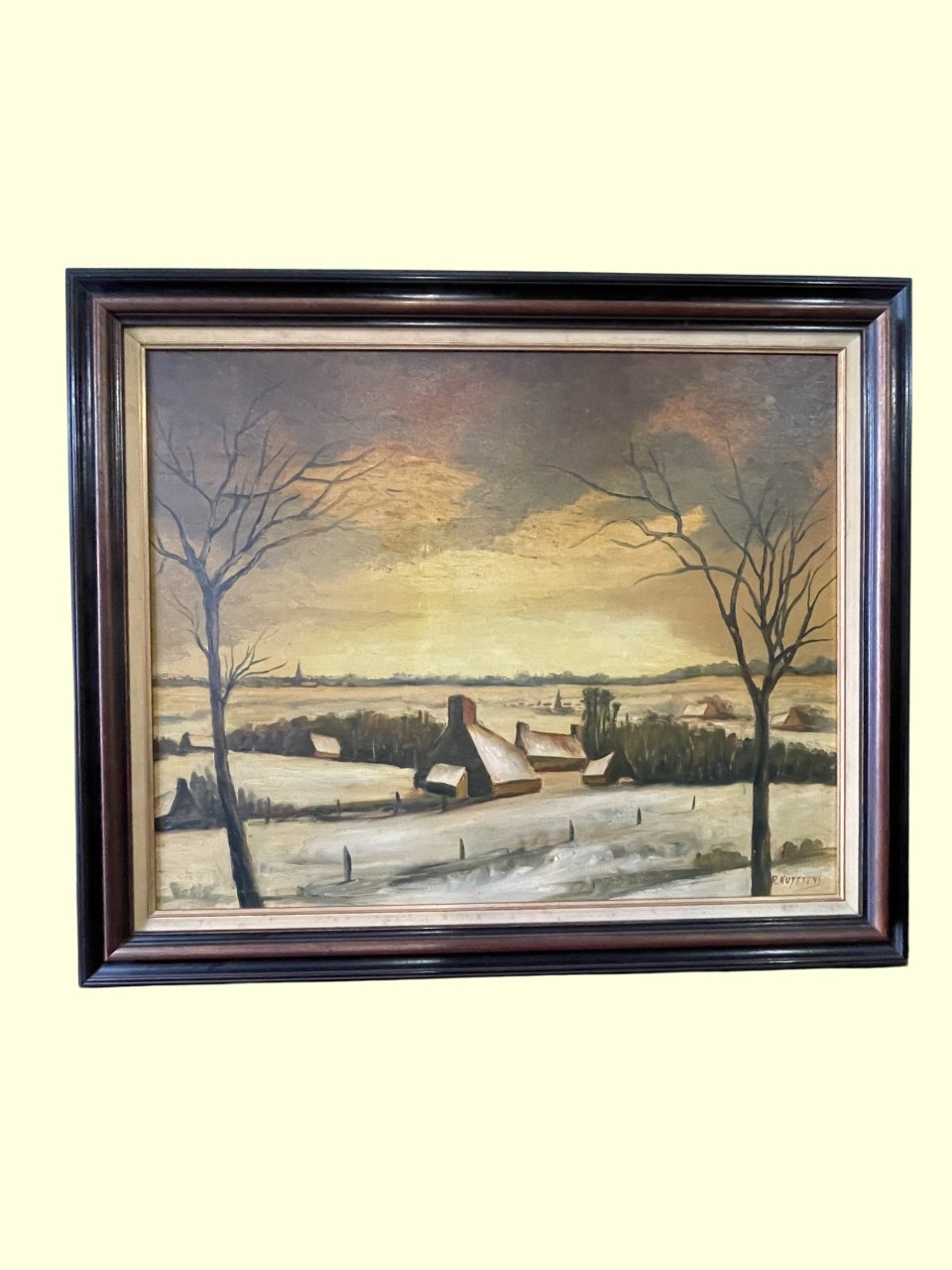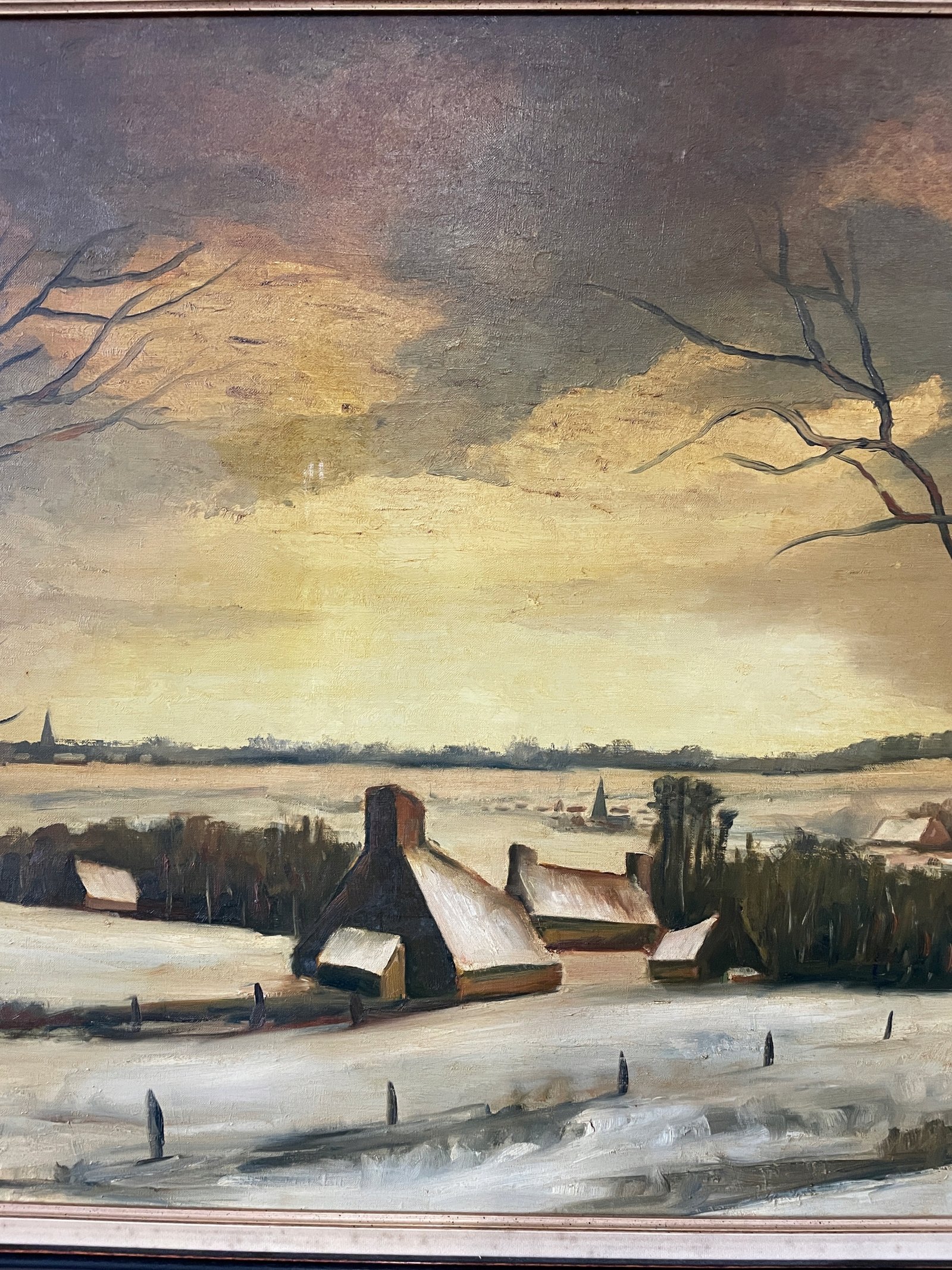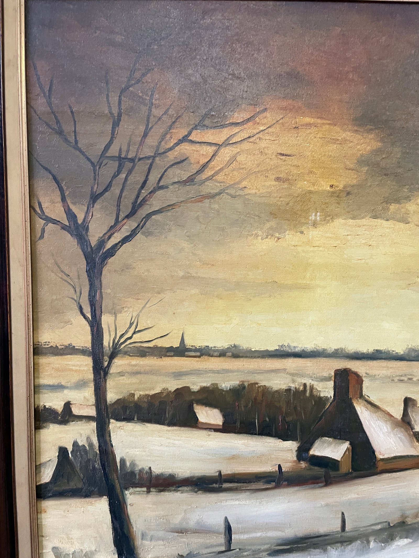 Pejzaż zimowy w ciepłej tonacji, wykonany techniką olejną na płótnie. Obraz przedstawia malowniczą wieś skąpaną w śniegu o zachodzie słońca. Kompozycję uzupełniają smukłe, bezlistne drzewa na pierwszym planie oraz charakterystyczne wiejskie domy z wysokimi kominami. Subtelne przejścia tonalne i delikatna gra światła nadają scenie spokojny, nostalgiczny nastrój.