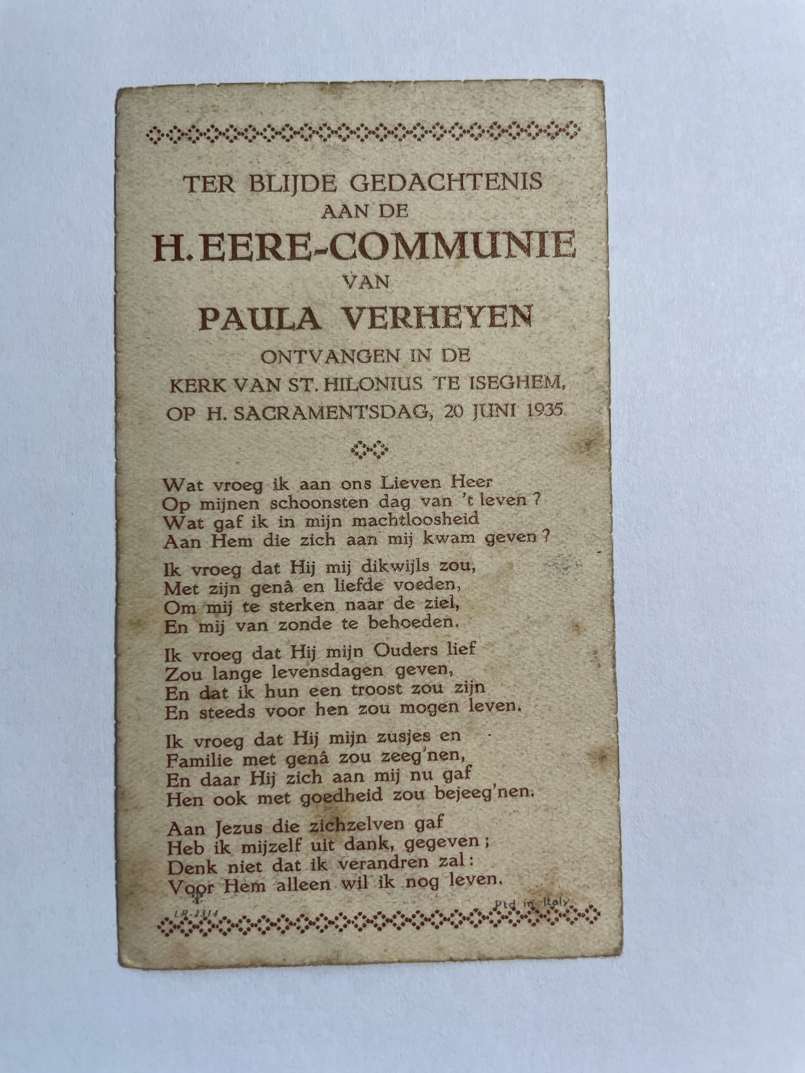 OBRAZEK Belgia 1935 Pierwsza Komunia Święta Iseghem Paula Verheyen