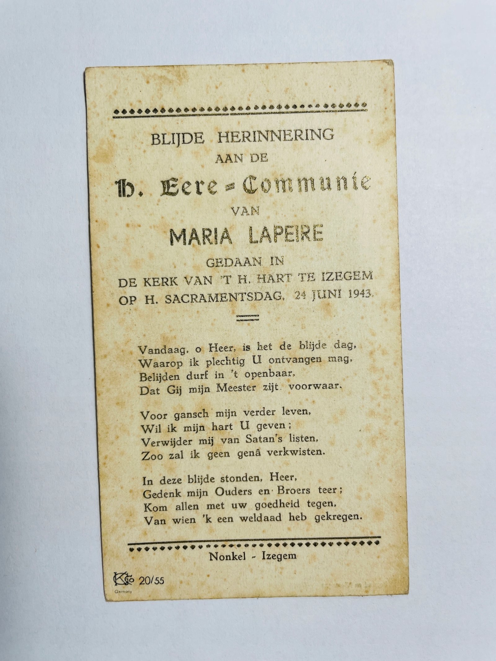 Obrazek Belgia 1943 Pierwsza Komunia Maria Lapeire Izegem Nonkel