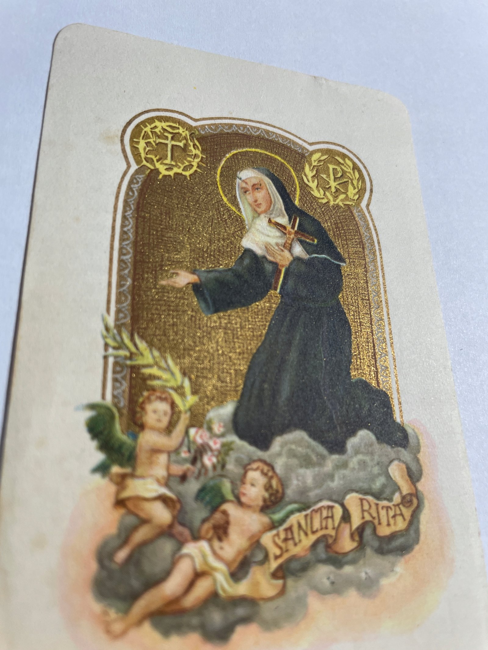 Kolorowy obrazek religijny przedstawiający św. Ritę z aureolą i krzyżem, unoszącą się na obłokach w otoczeniu dwóch aniołków. Na dole widnieje wstęga z napisem „Sancta Rita”. Na odwrocie znajduje się drukowana modlitwa w języku niderlandzkim z nagłówkiem „Gebed tot de H. Rita”. W dolnej części umieszczono napis: „Cum permissu Superiorum. P.P. Augustijnen. Kontich (Antw)”.