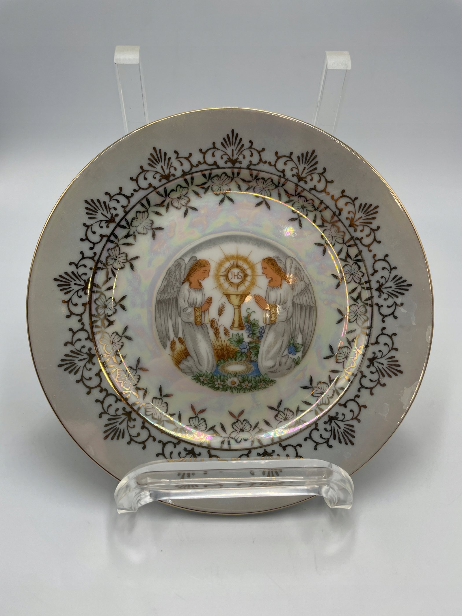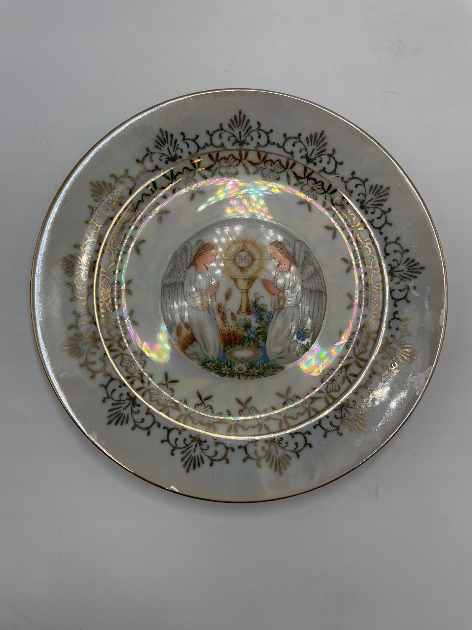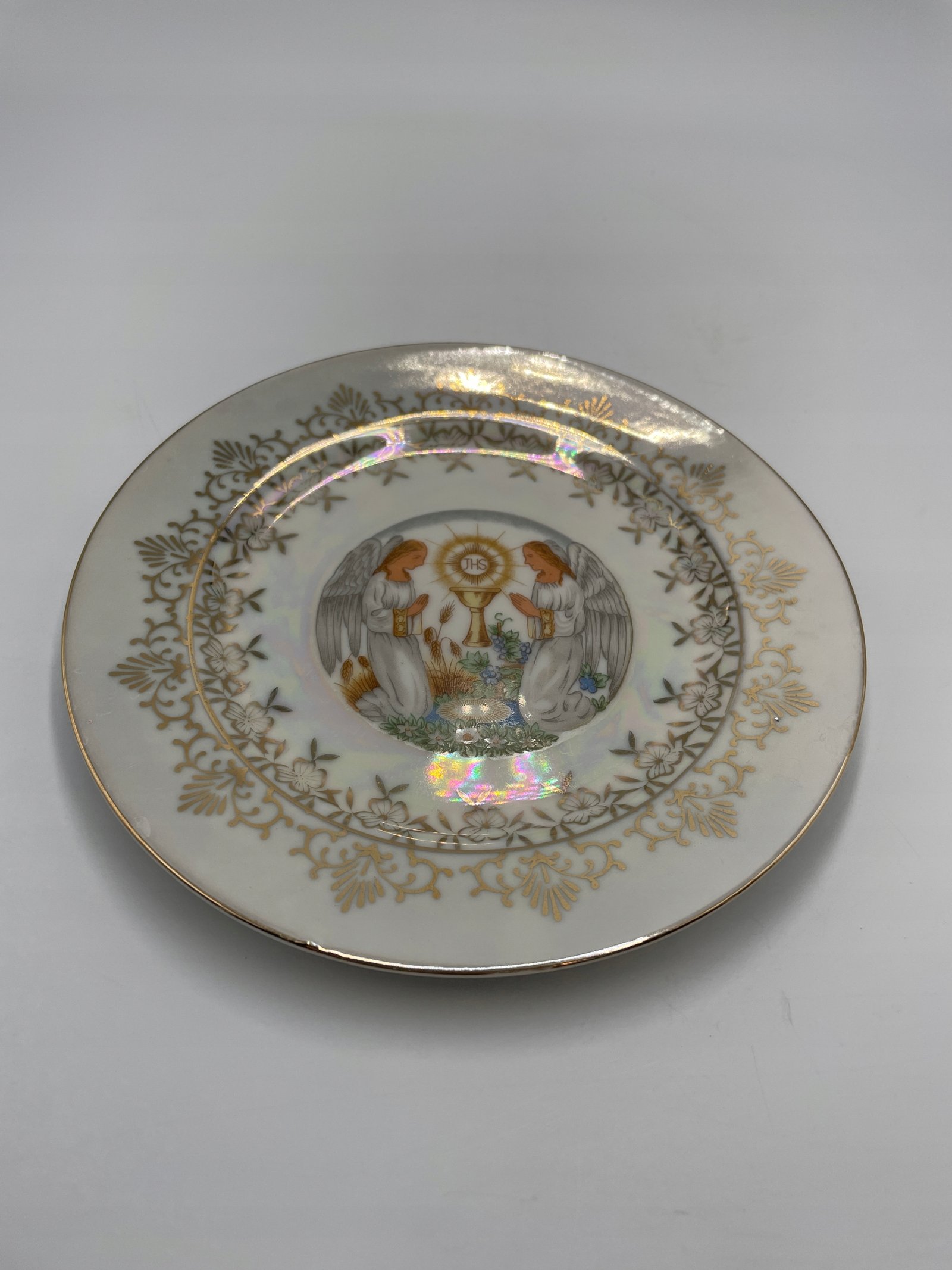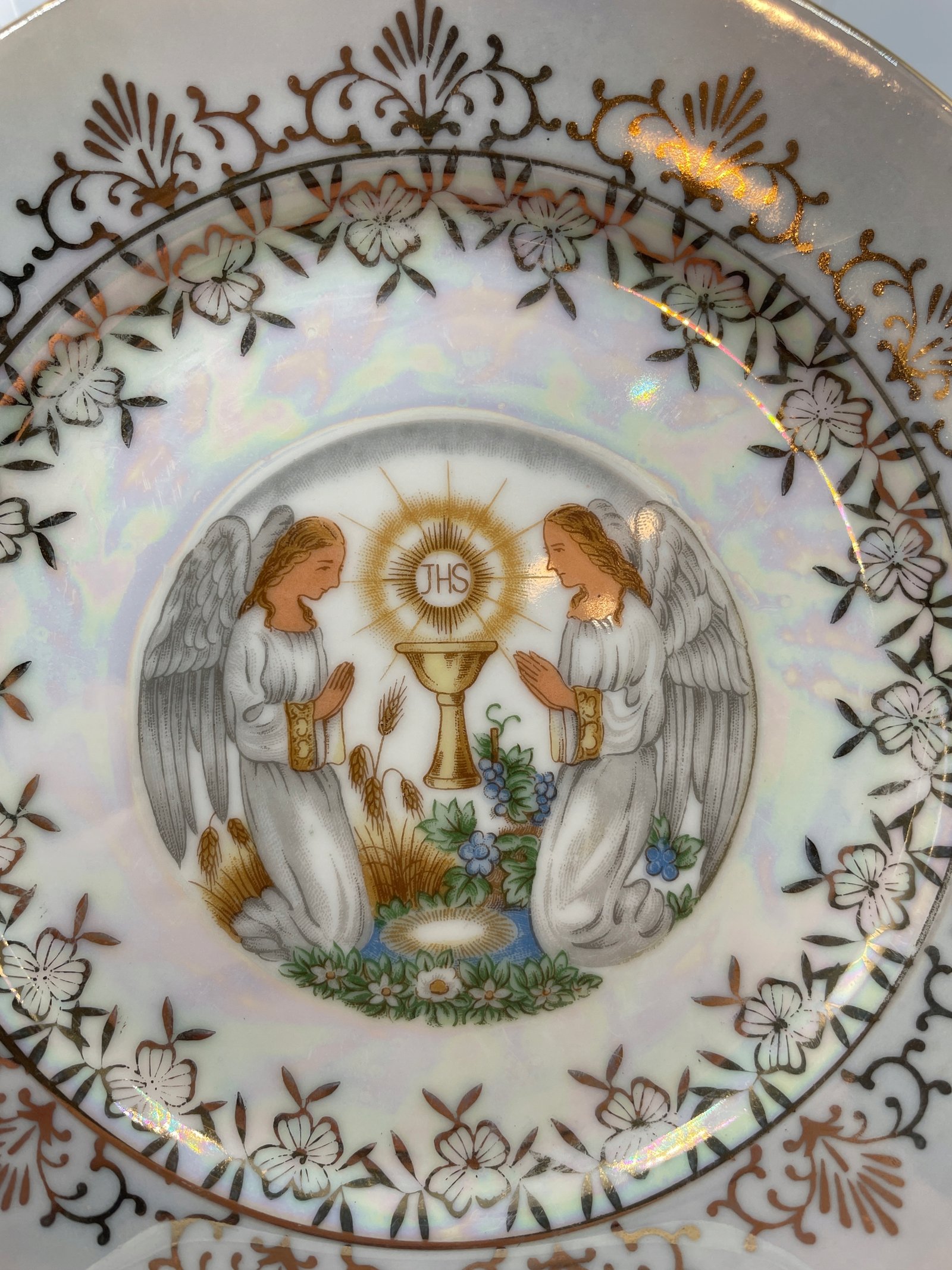 Opis: Dekoracyjny talerz pamiątkowy z motywem sakralnym, przedstawiający dwóch aniołów klęczących przed kielichem eucharystycznym. Wykonany z porcelany, zdobiony złoconym ornamentem oraz delikatnym perłowym połyskiem na powierzchni. Brzeg talerza dekorowany klasycznym wzorem z florystycznymi akcentami, co dodaje mu elegancji.