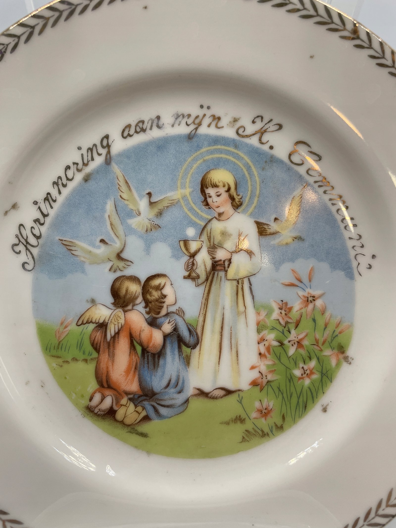 Dekoracyjny talerz pamiątkowy z okazji Pierwszej Komunii Świętej, zdobiony uroczą sceną aniołów klęczących przed Chrystusem trzymającym kielich. W górnej części widnieje napis w języku niderlandzkim: „Herinnering aan mijn H. Communie”, co oznacza „Pamiątka mojej Pierwszej Komunii Świętej”. Brzeg talerza ozdobiony jest subtelnym roślinnym ornamentem.