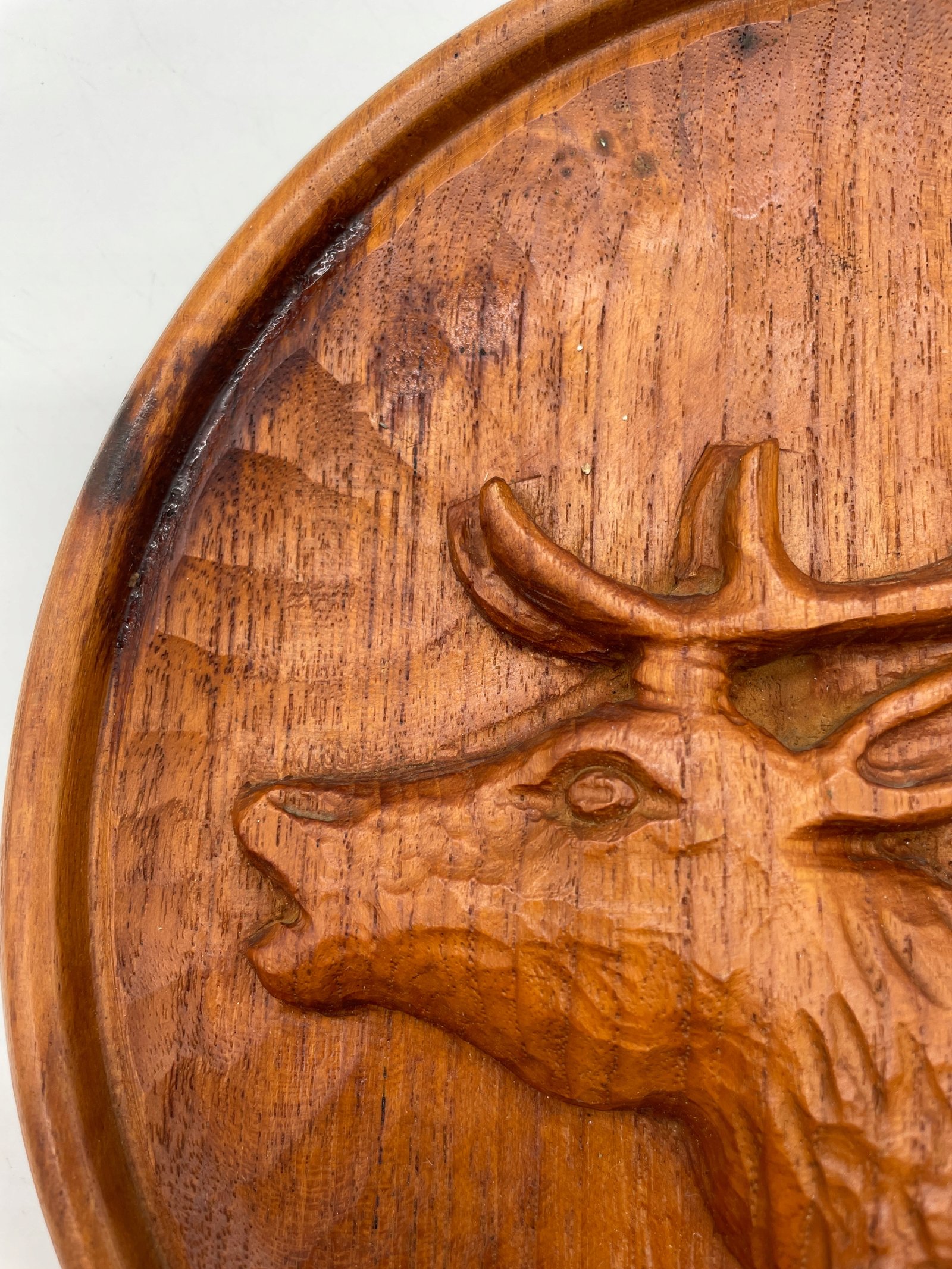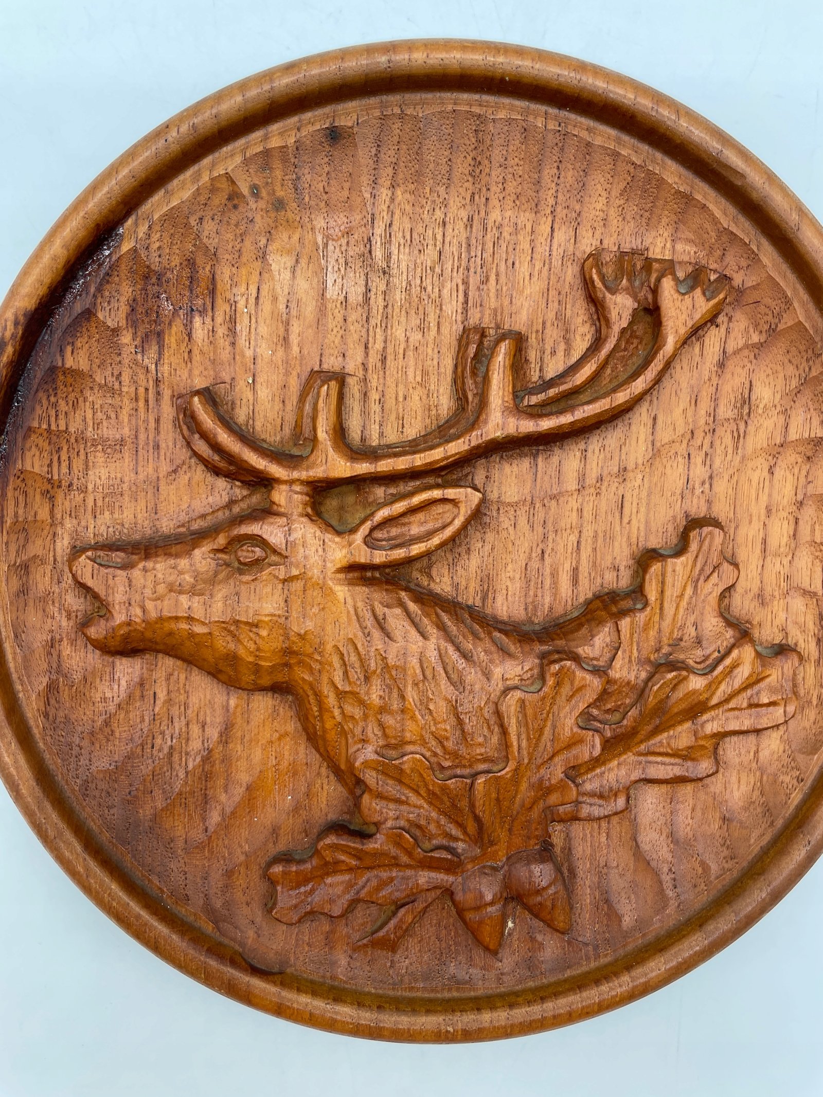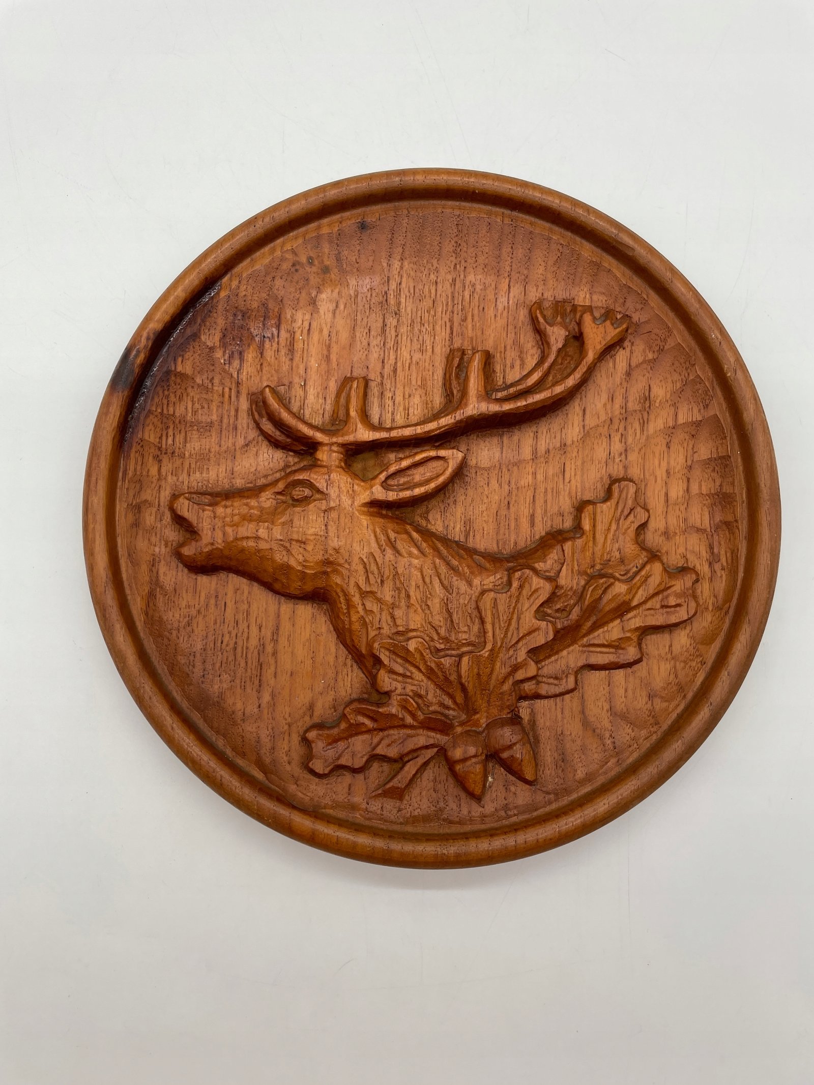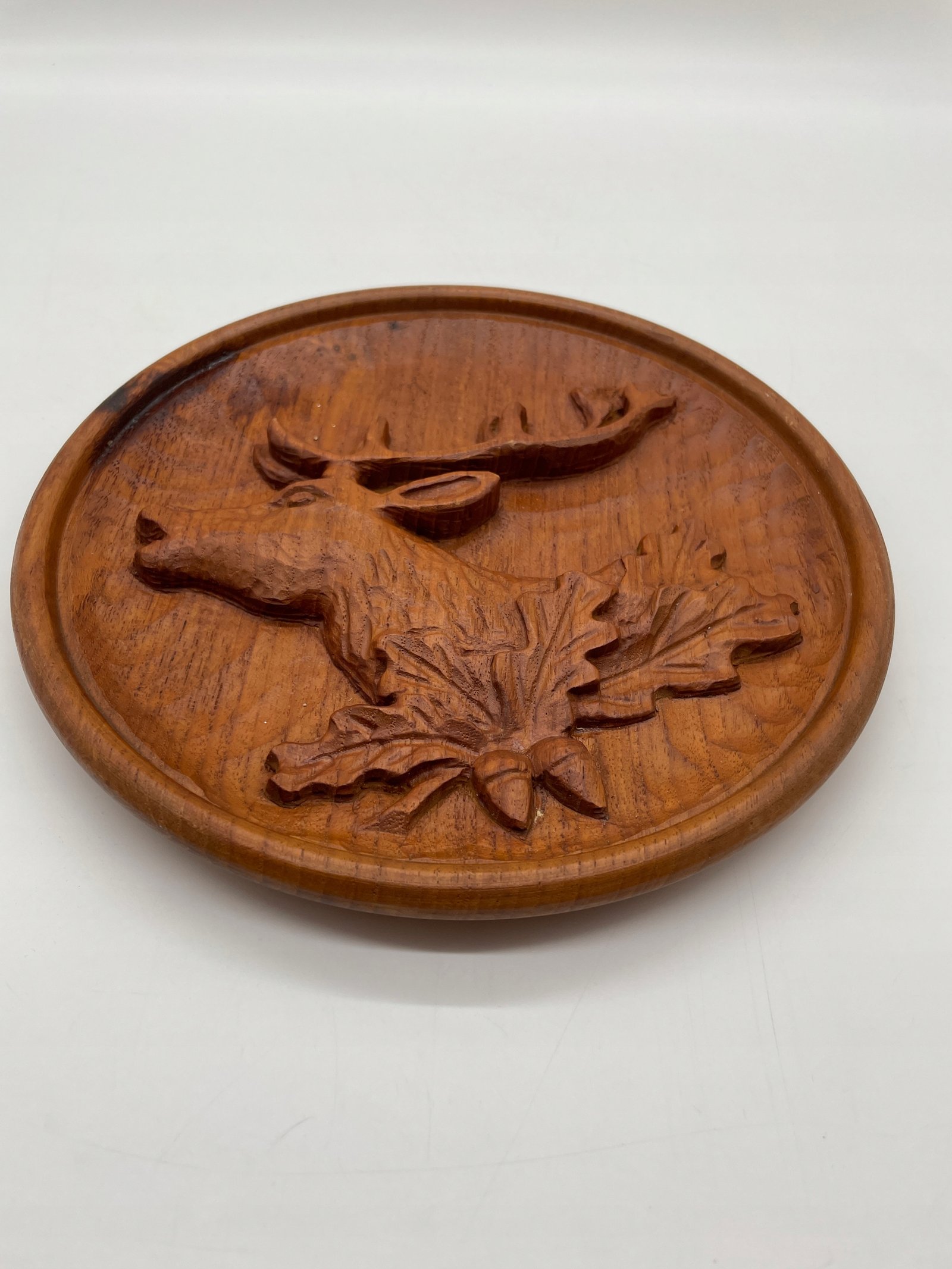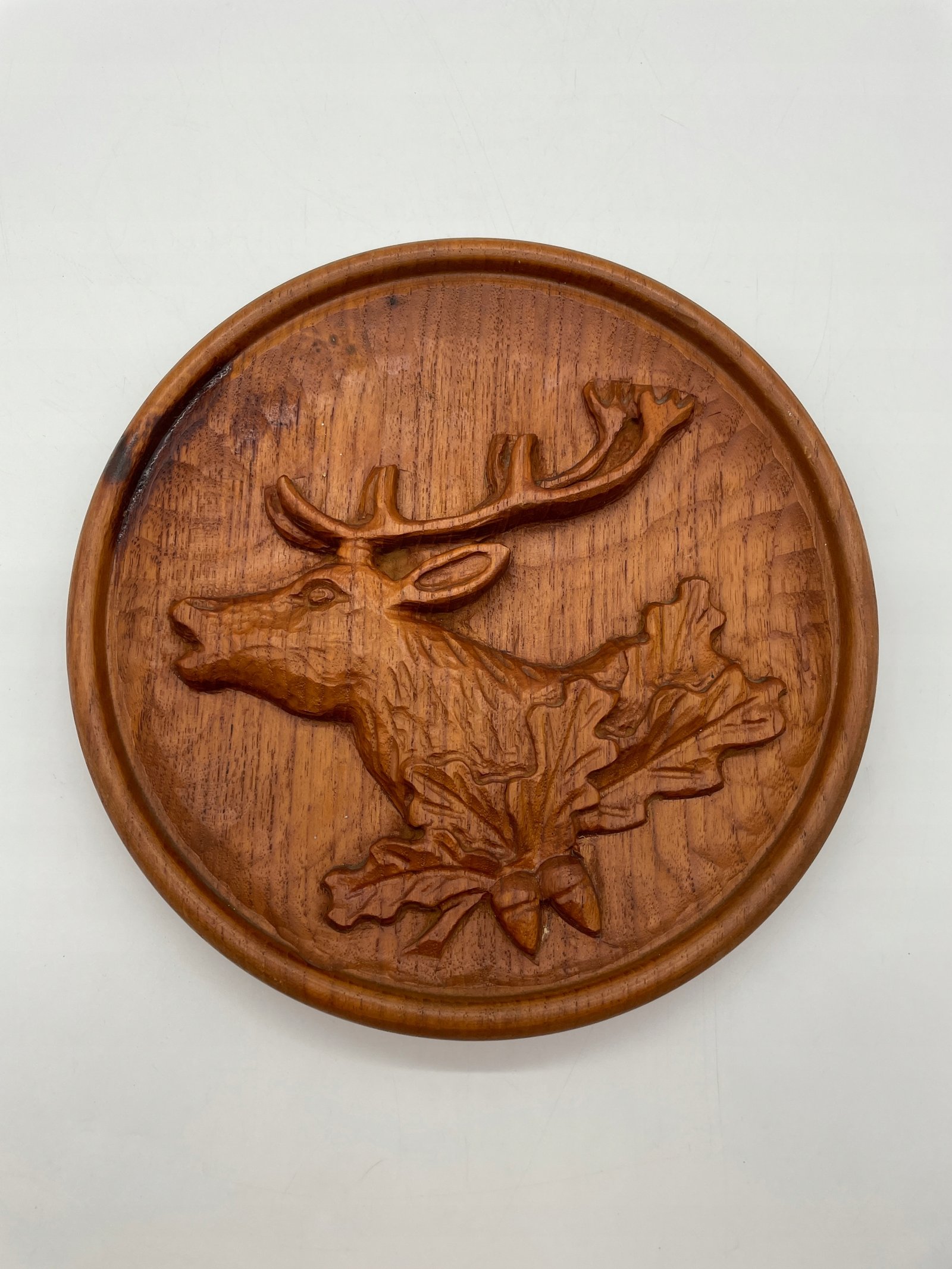Panno drewniane rzezbione jelen z liscmi ok. 1970 srednica 25 cm