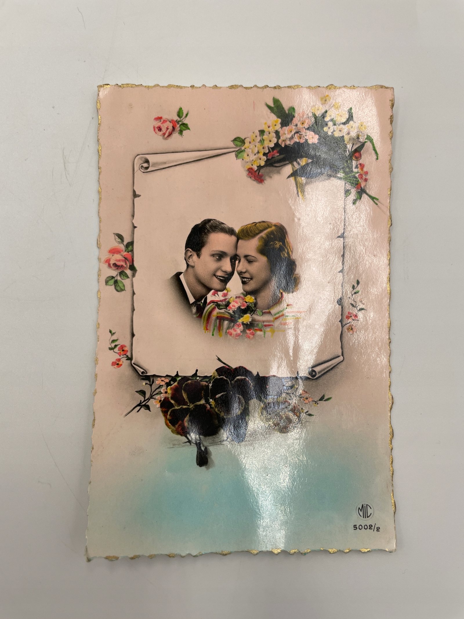 Paryska pocztówka romantyczna kolorowana, zakochana para