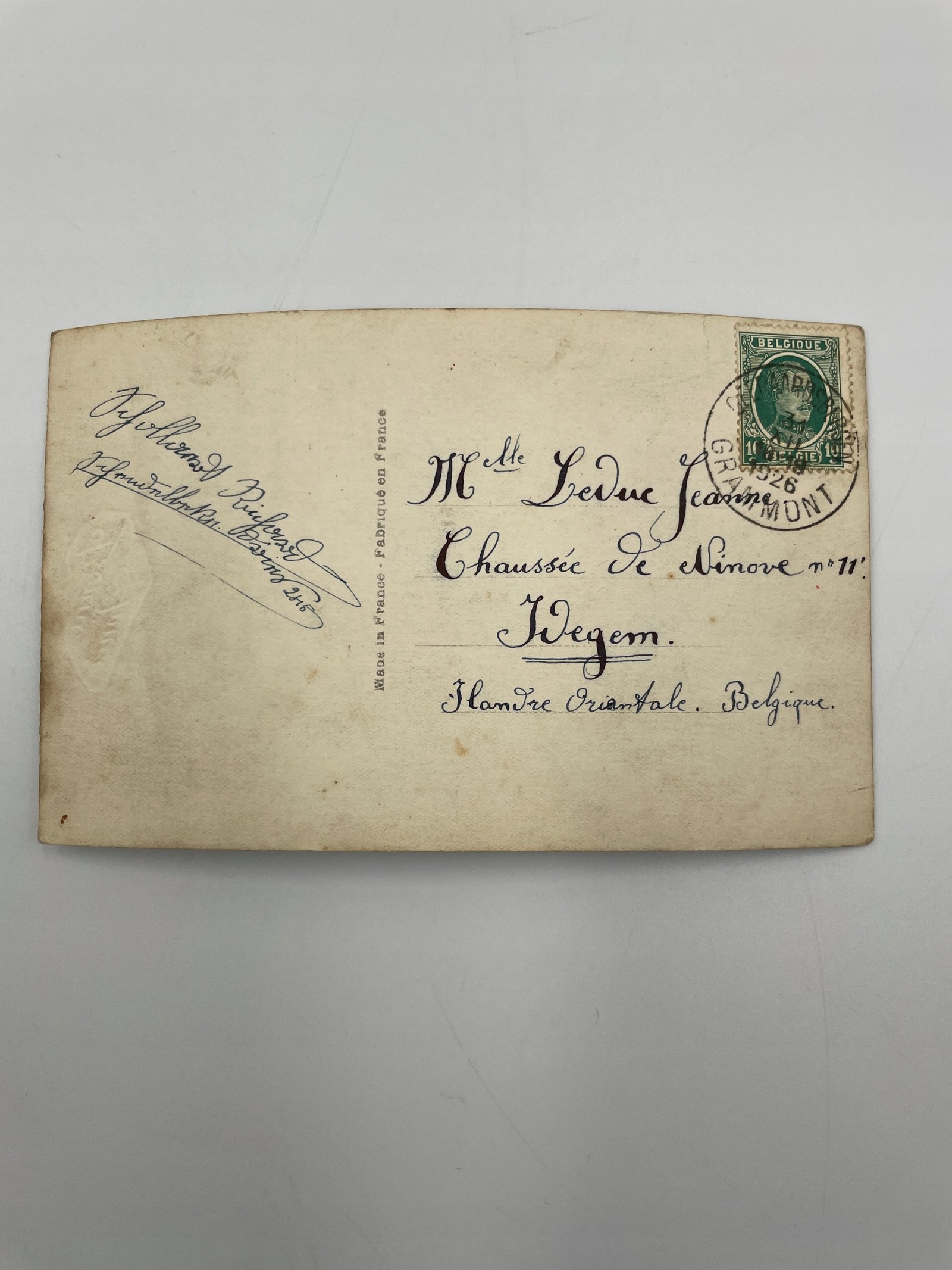 Oryginalna, ręcznie kolorowana pocztówka z początku XX wieku, przedstawiająca zakochaną parę w stylu art déco.