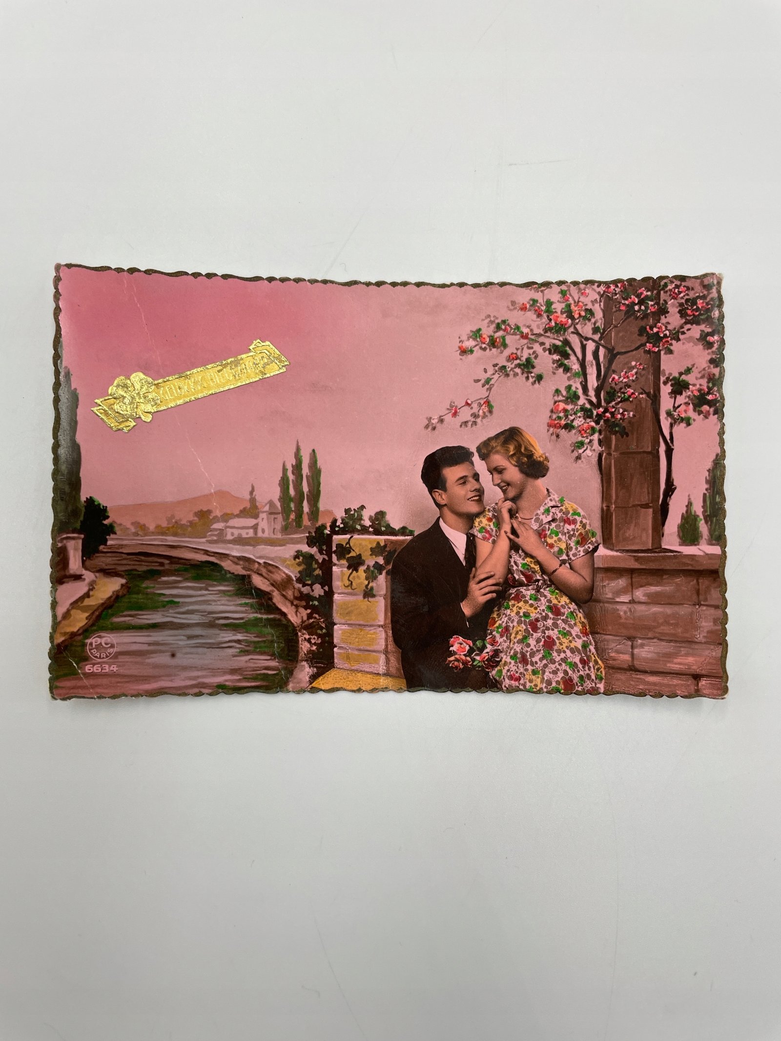 Paryska pocztówka romantyczna kolorowana, zakochana para, 1953 r.