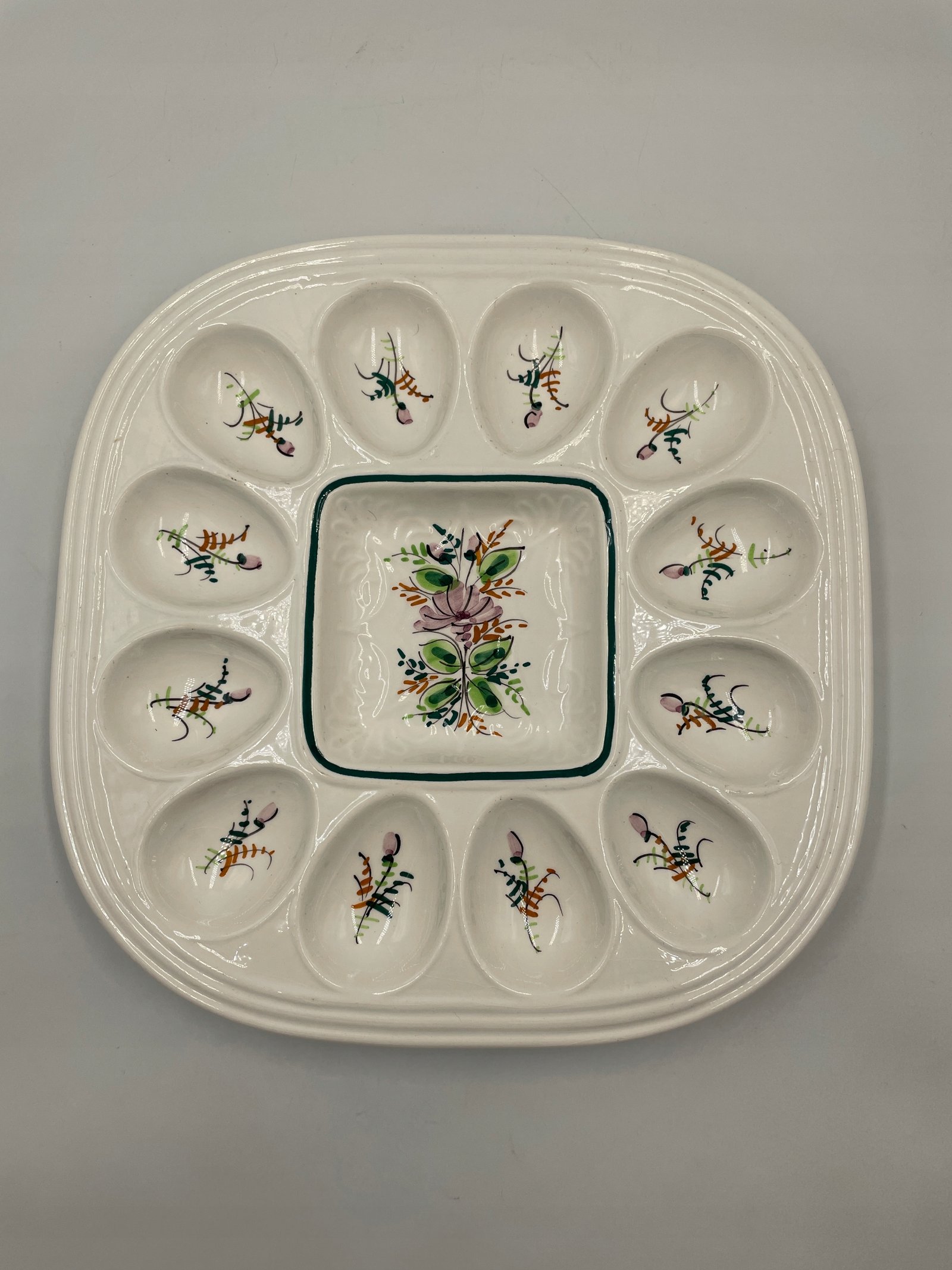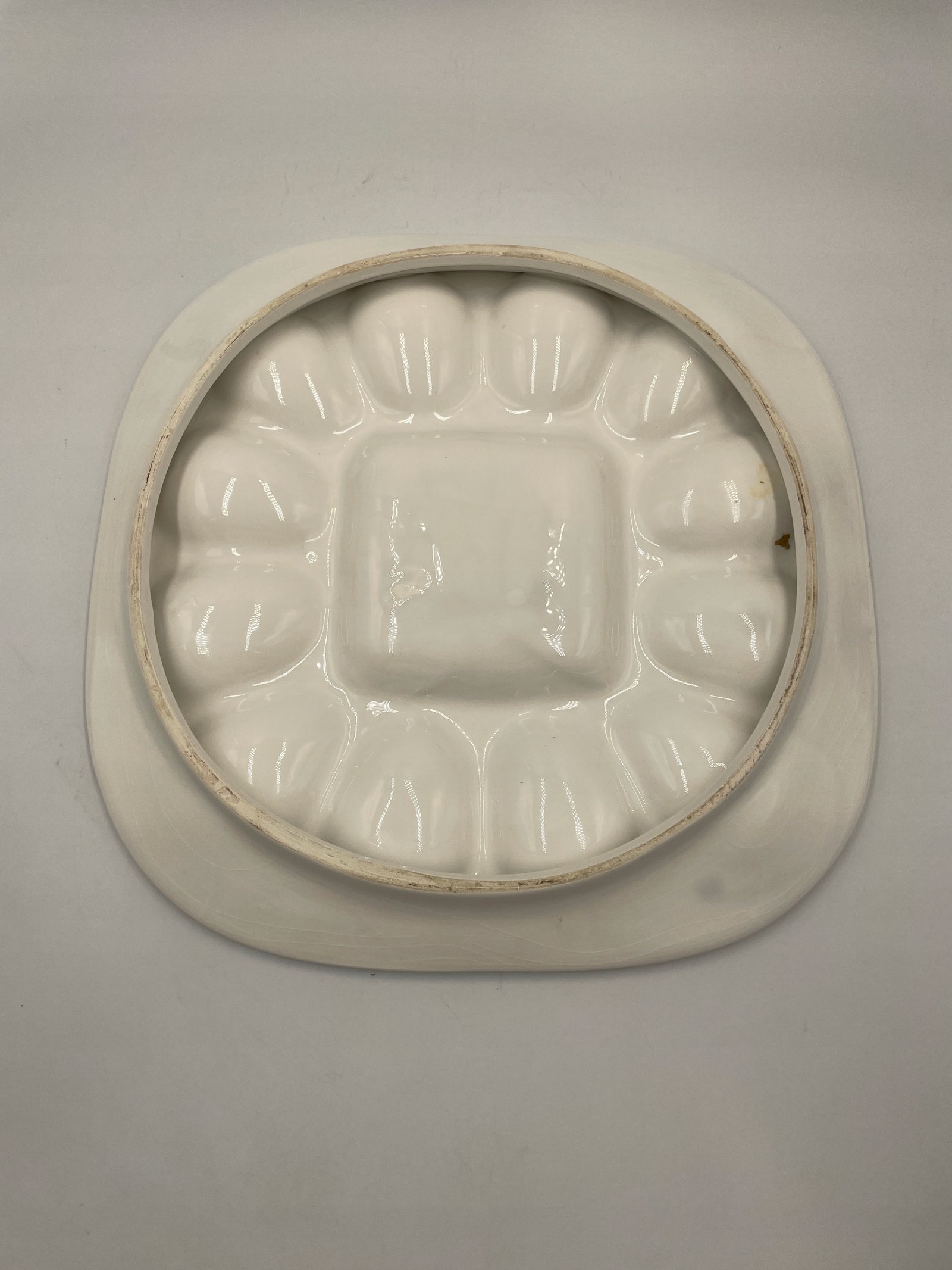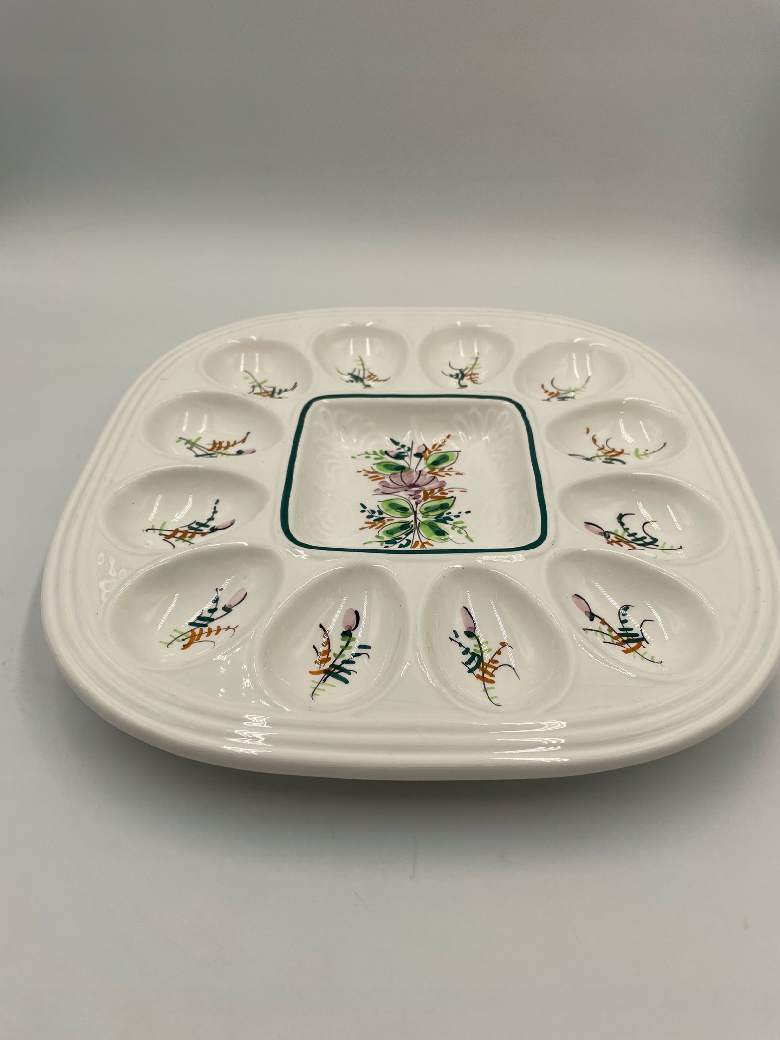 Piękny kwadratowy talerz na jajka z centralnym otworem na sos, ręcznie malowana porcelana