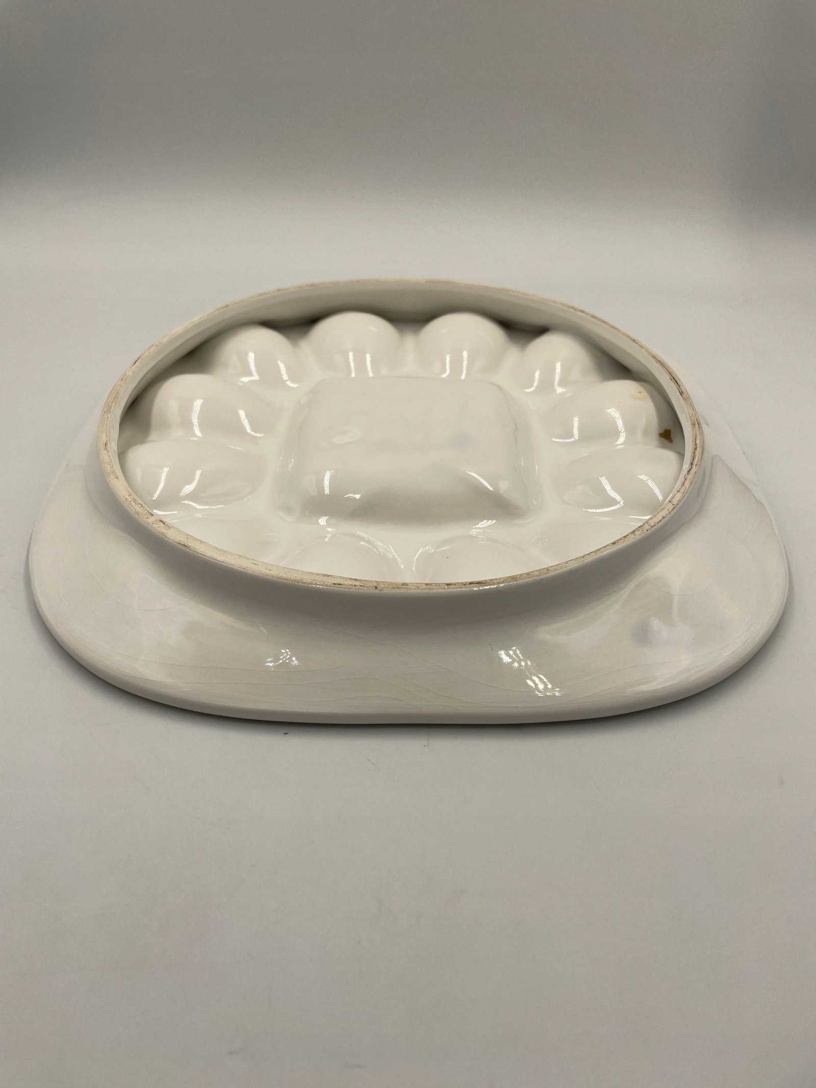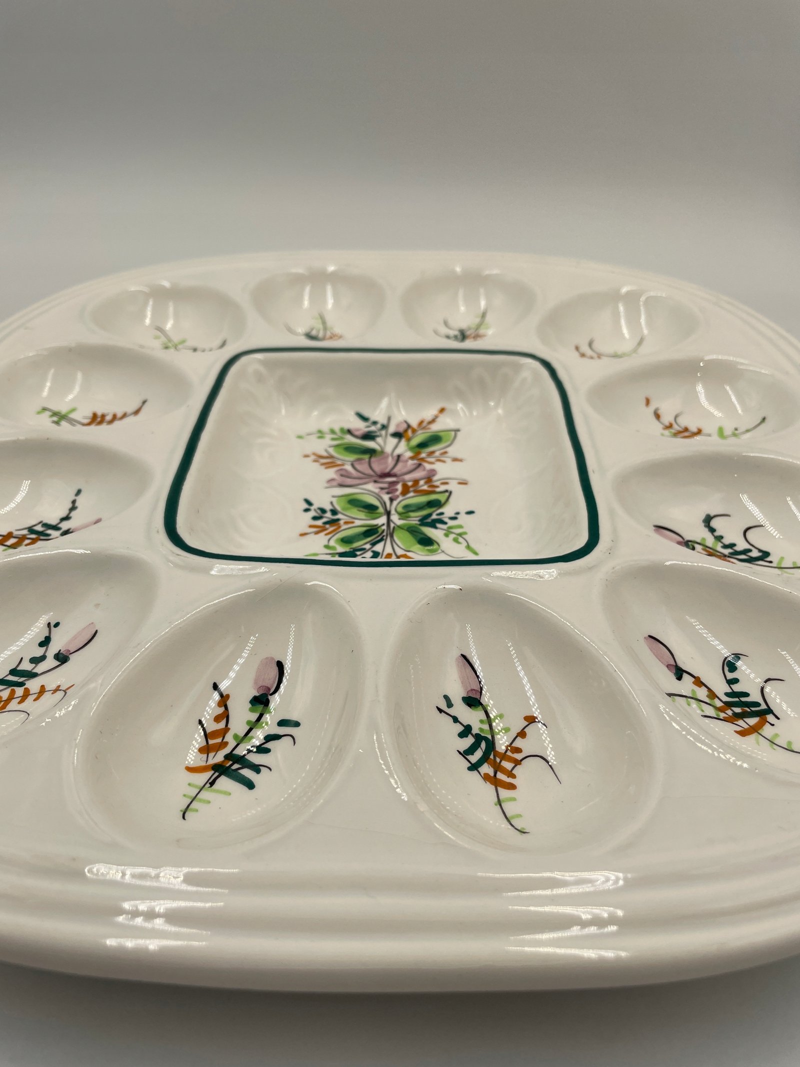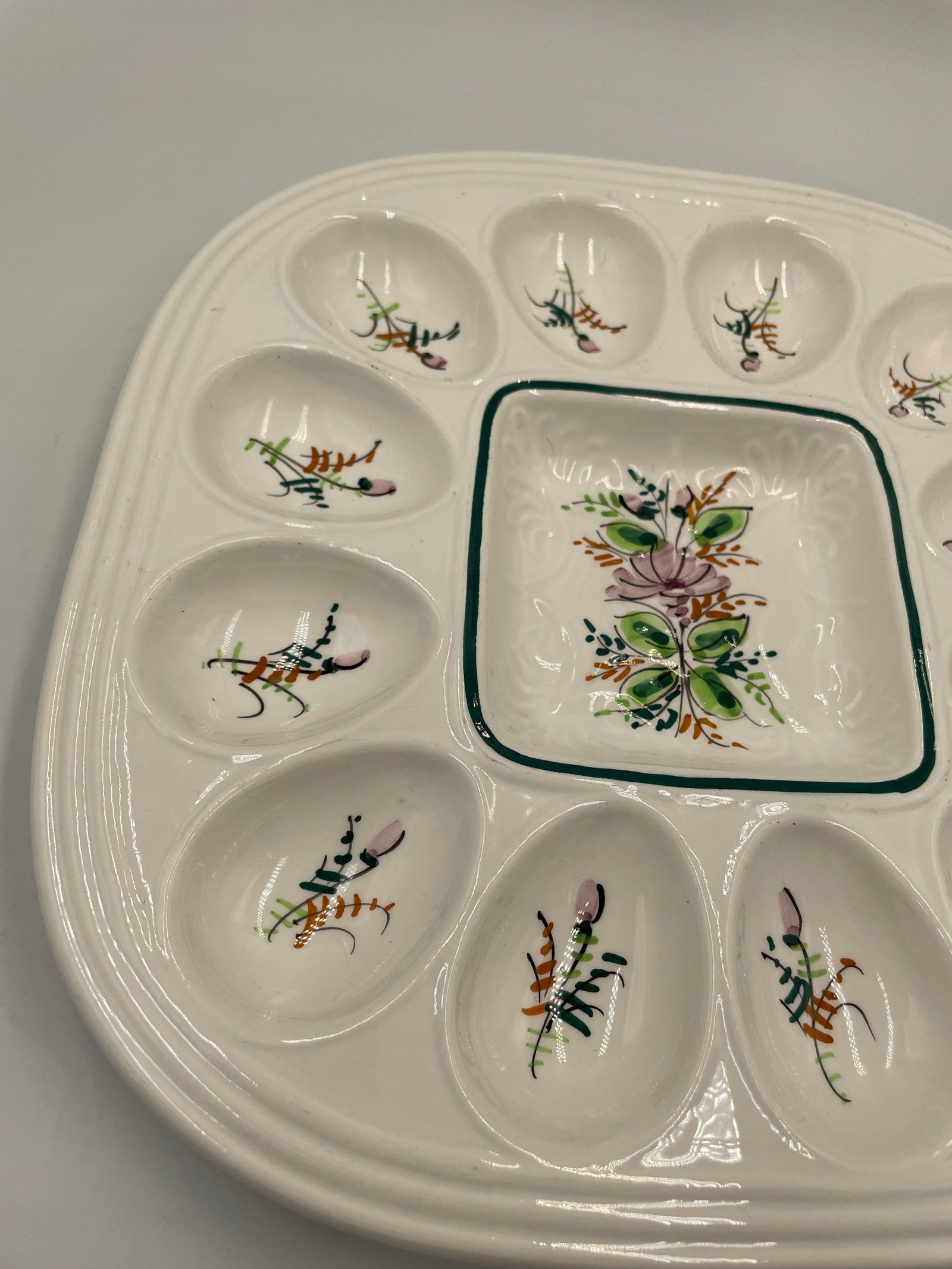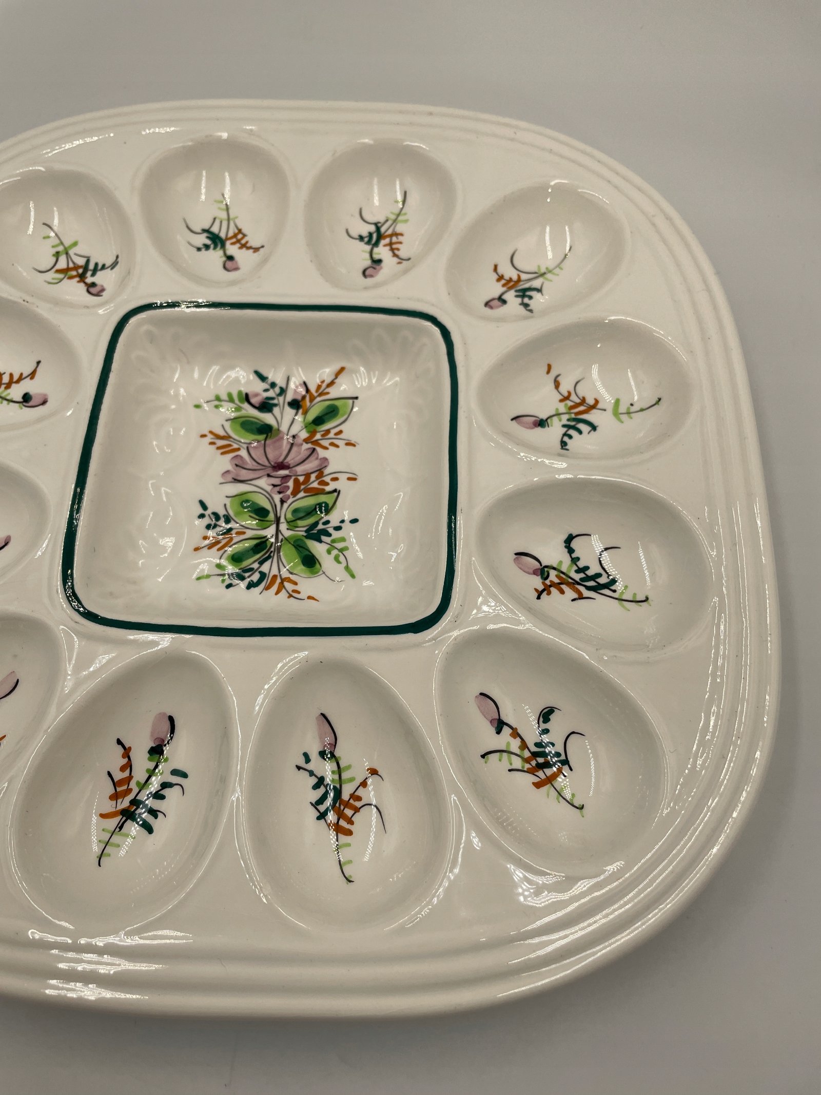 Piękny kwadratowy talerz na jajka z centralnym otworem na sos, ręcznie malowana porcelana