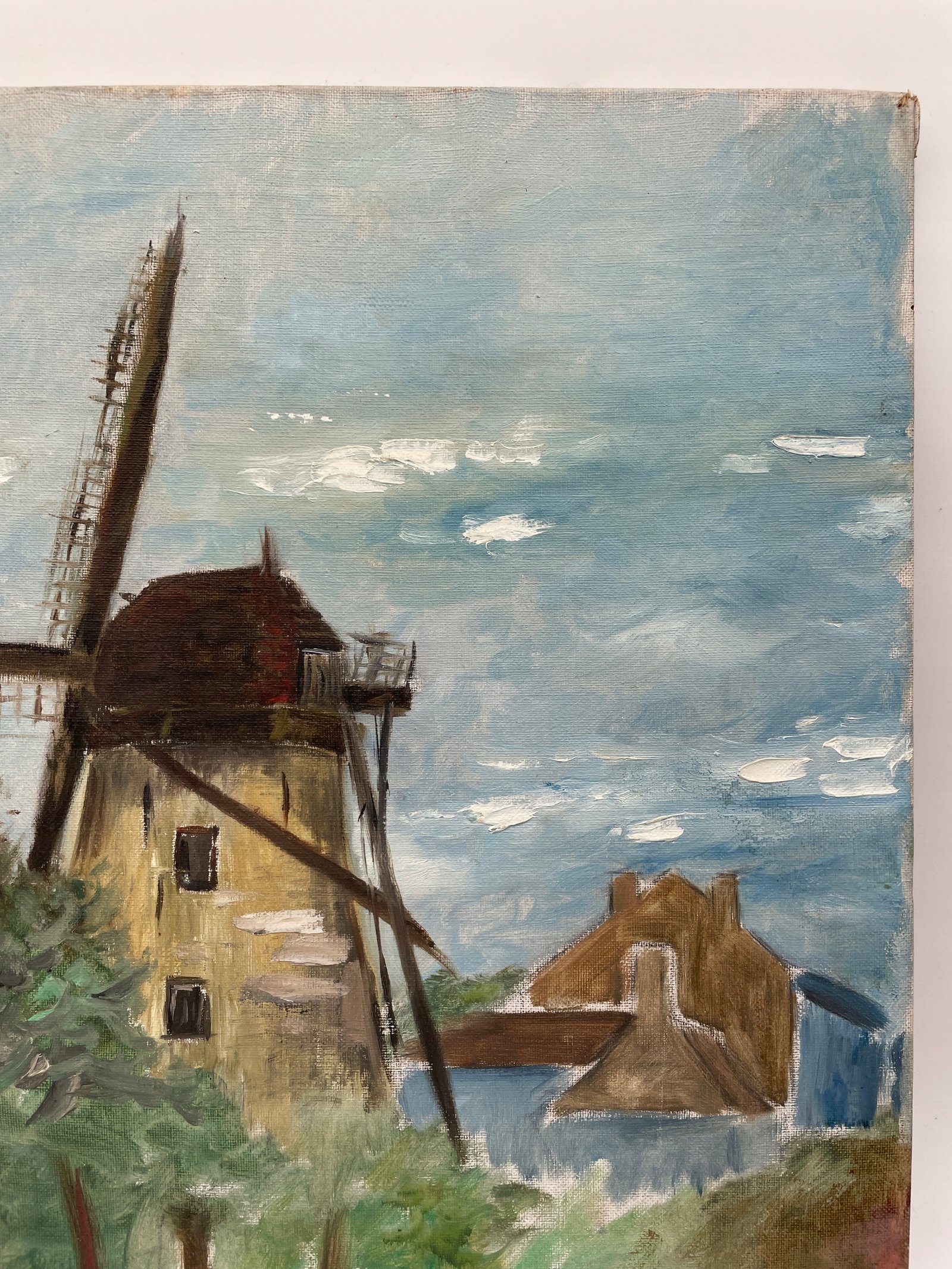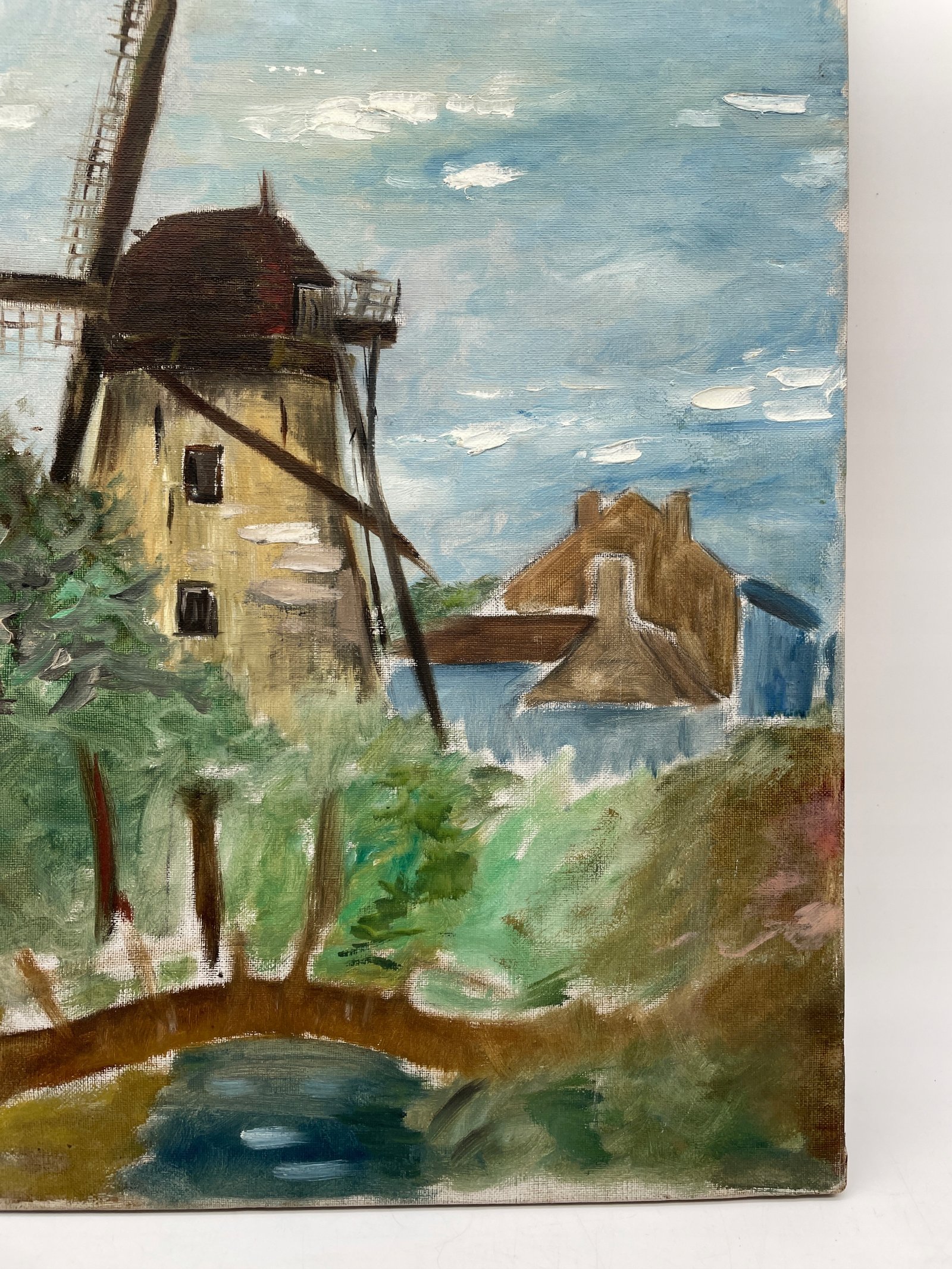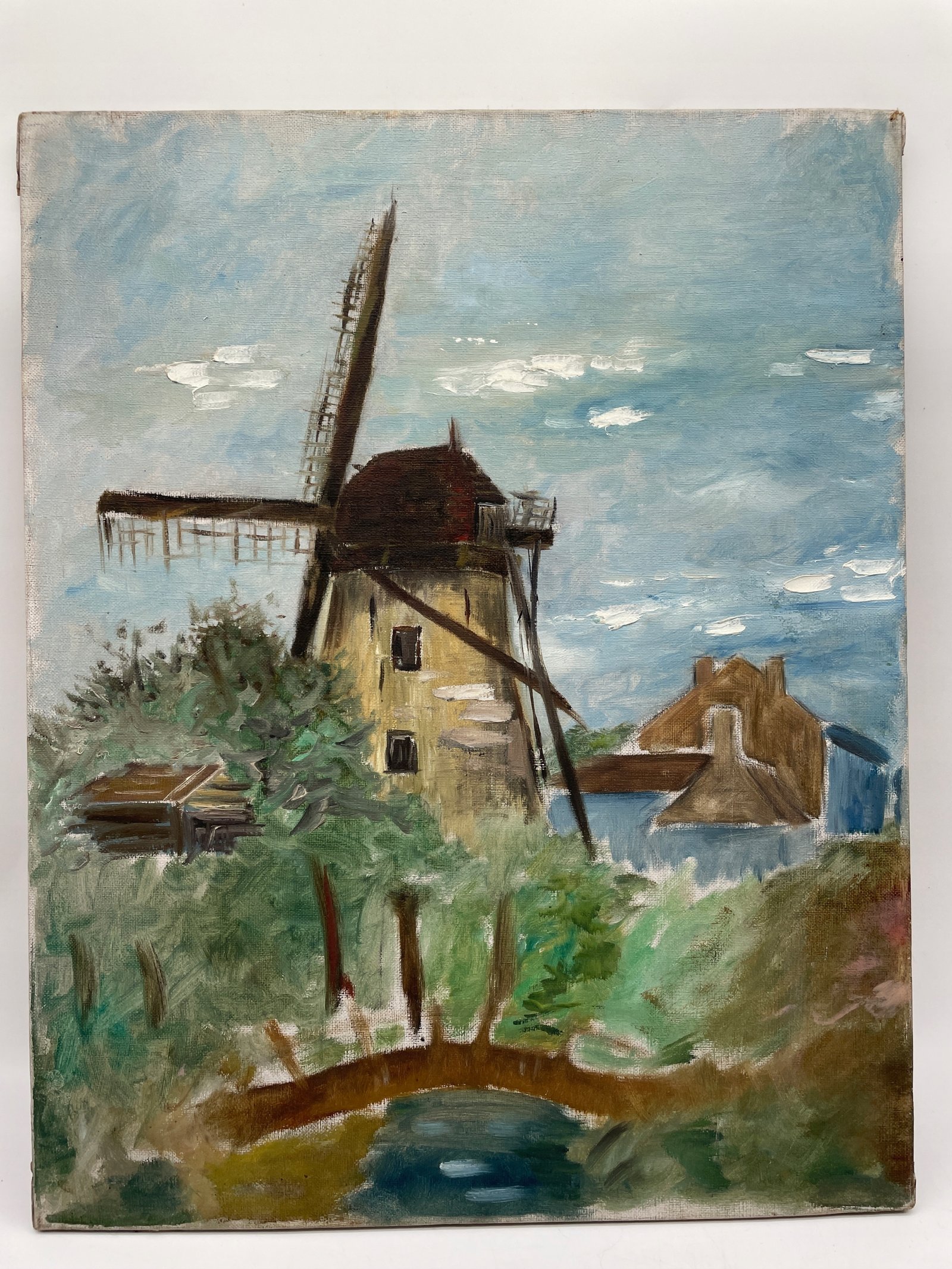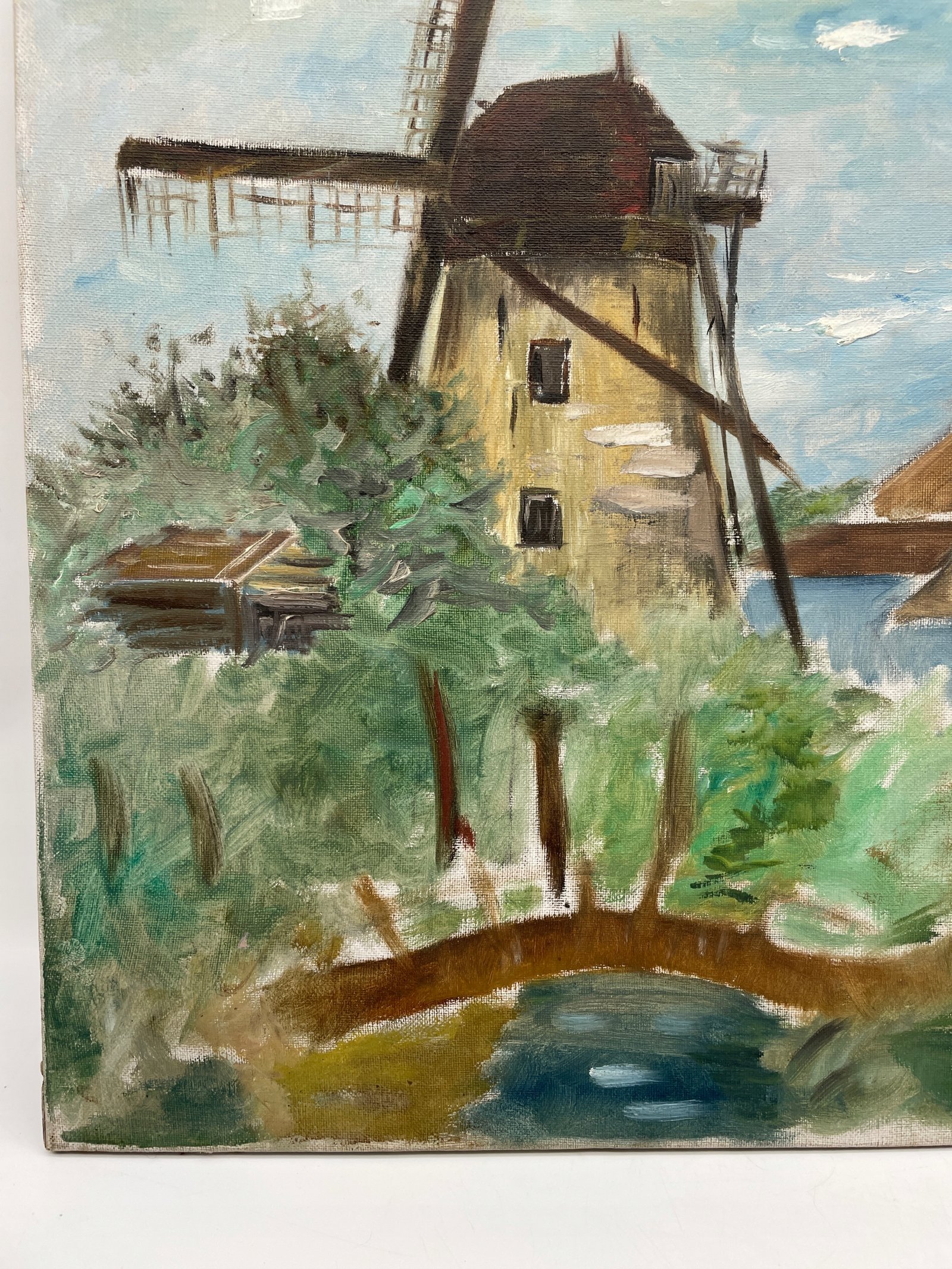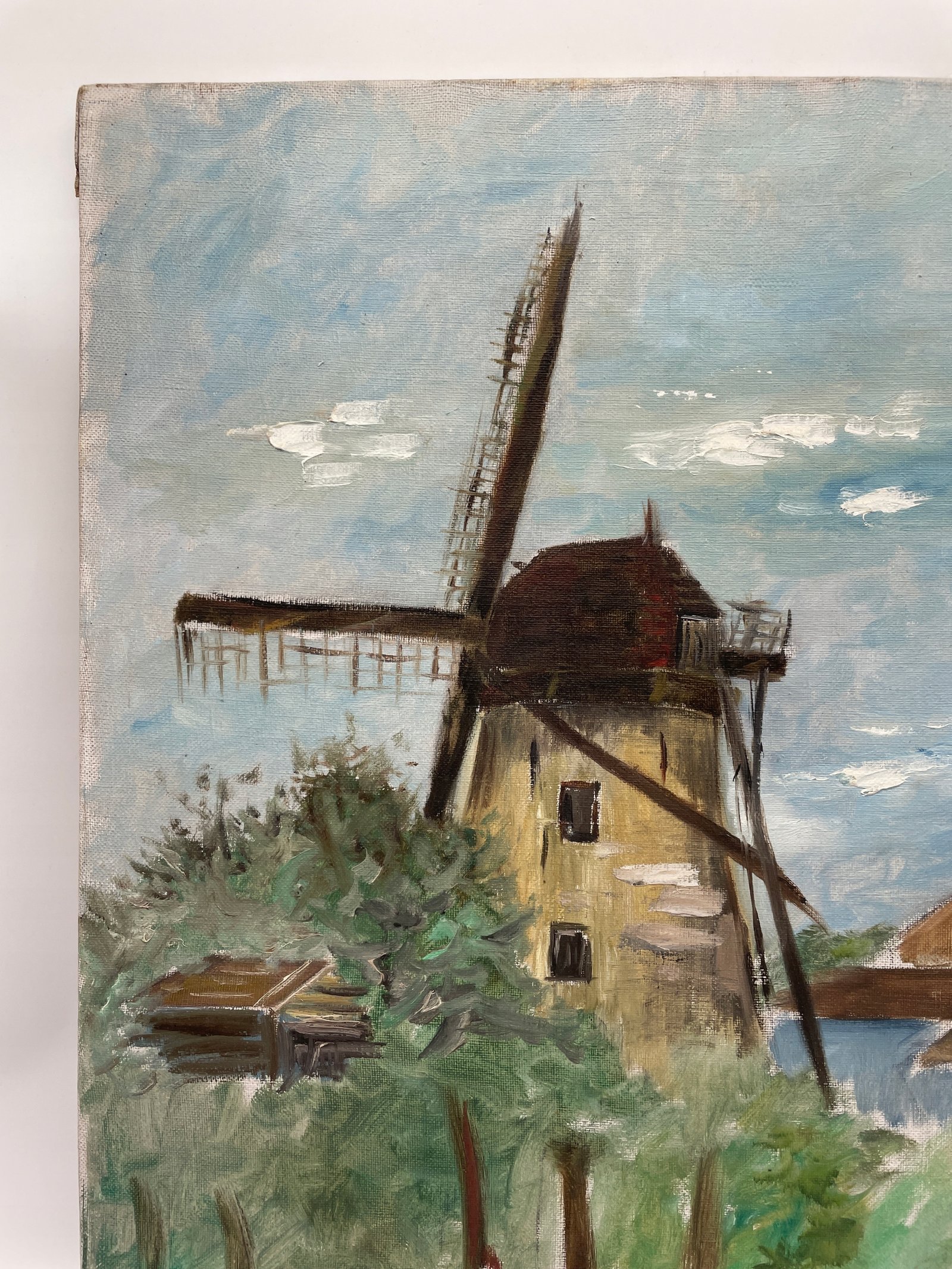 Obraz olejny na płótnie, przedstawiający wiatrak na tle nieba i wiejskiego krajobrazu. Praca malowana ręcznie, bez sygnatury. Brak ramy. Widoczne ślady czasu na płótnie i krośnie, co dodaje uroku i autentyczności dziełu.