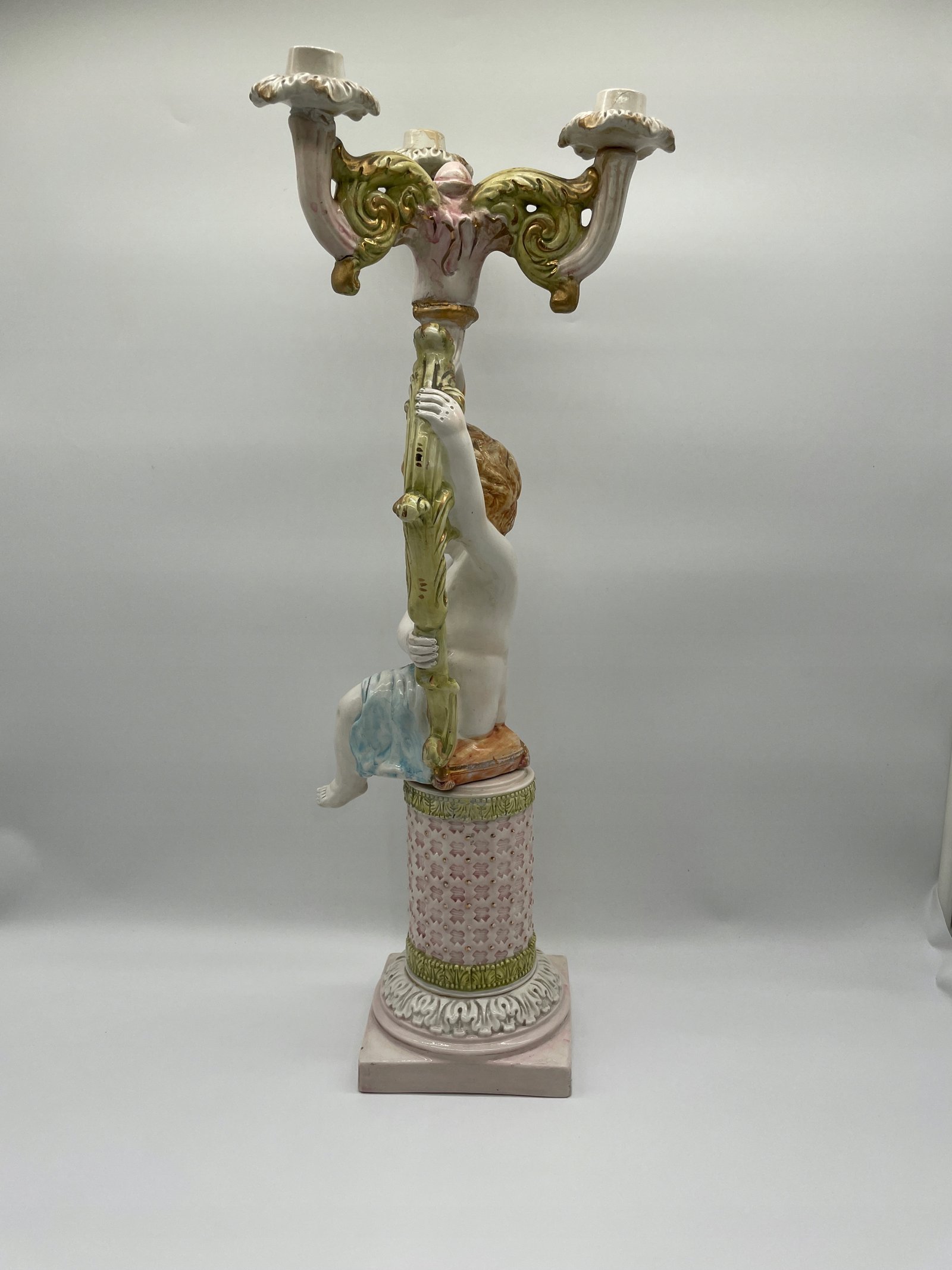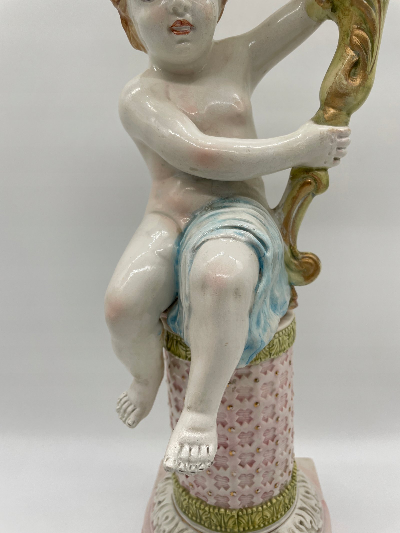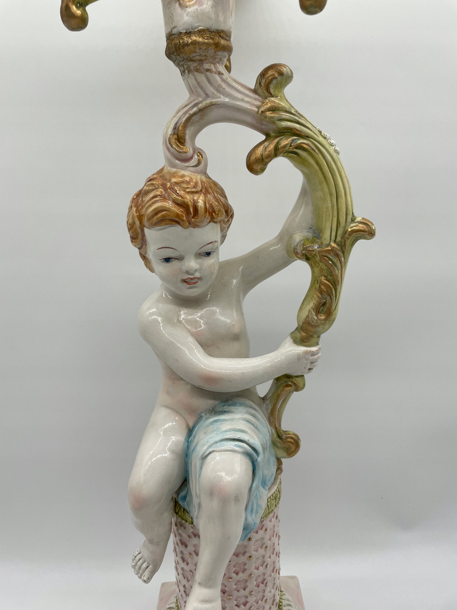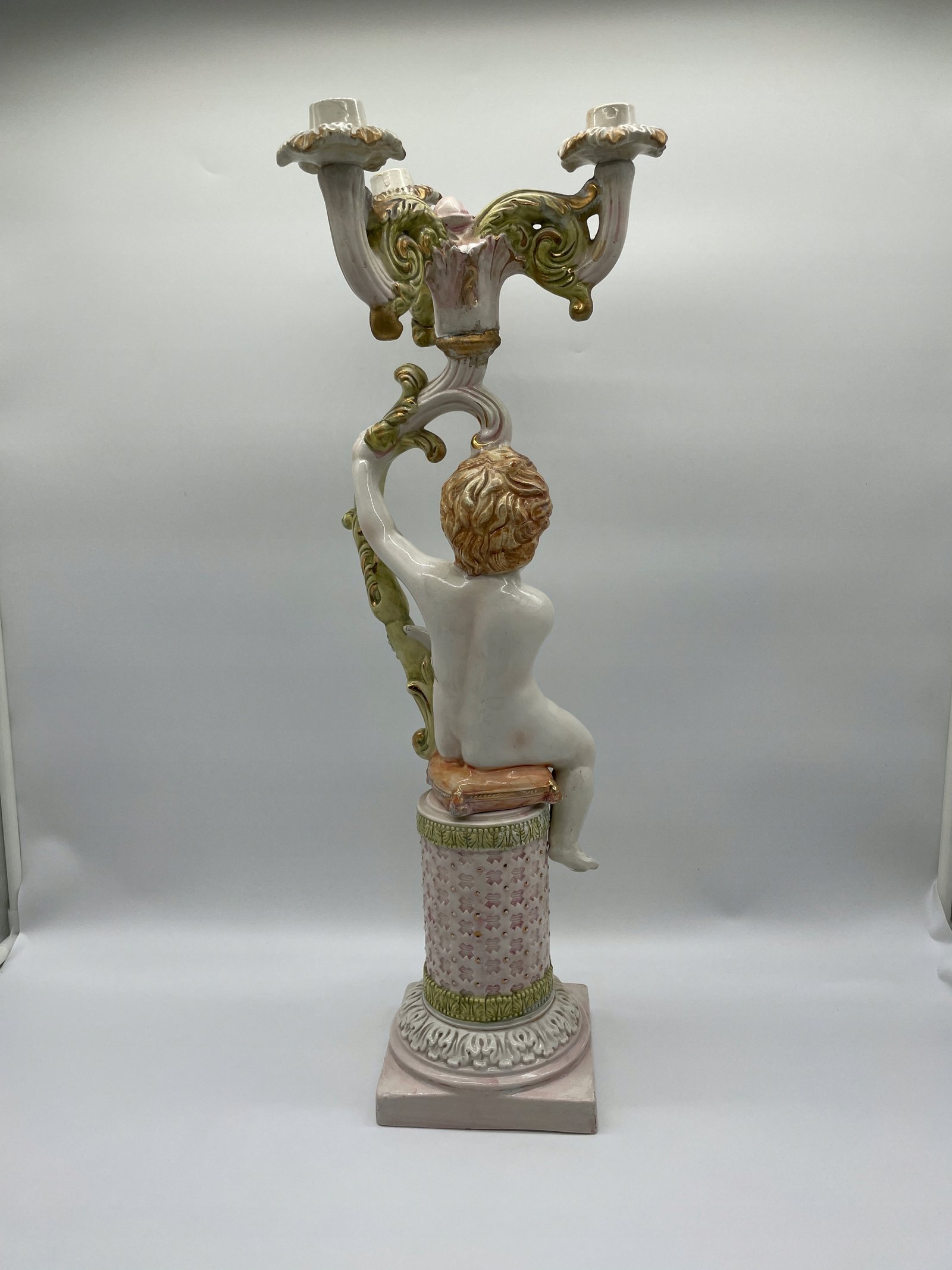 Imponujący duży porcelanowy świecznik trójramienny, ozdobiony dopracowaną figurką chłopca siedzącego na kolumnie i trzymającego ozdobny, złocony element w kształcie łuku. Kompozycję uzupełnia wyrafinowany dekor roślinny oraz staranna malatura w delikatnych pastelowych barwach. Złocone akcenty podkreślają wartość dekoracyjną przedmiotu. Dzięki okazałej wysokości będzie wyrazistym centrum wnętrza i przyciągnie uwagę zarówno w aranżacji klasycznej, jak i romantycznej.