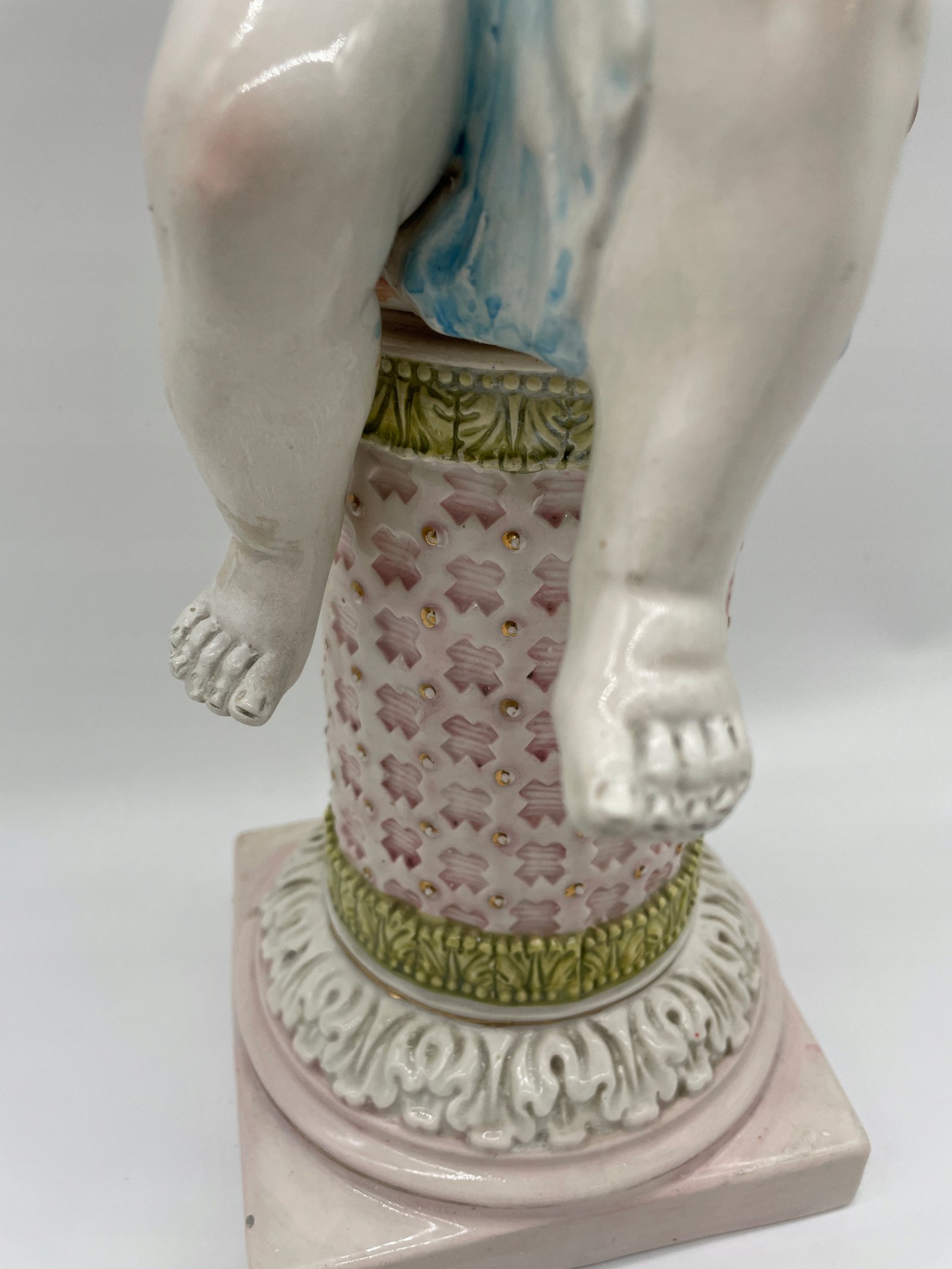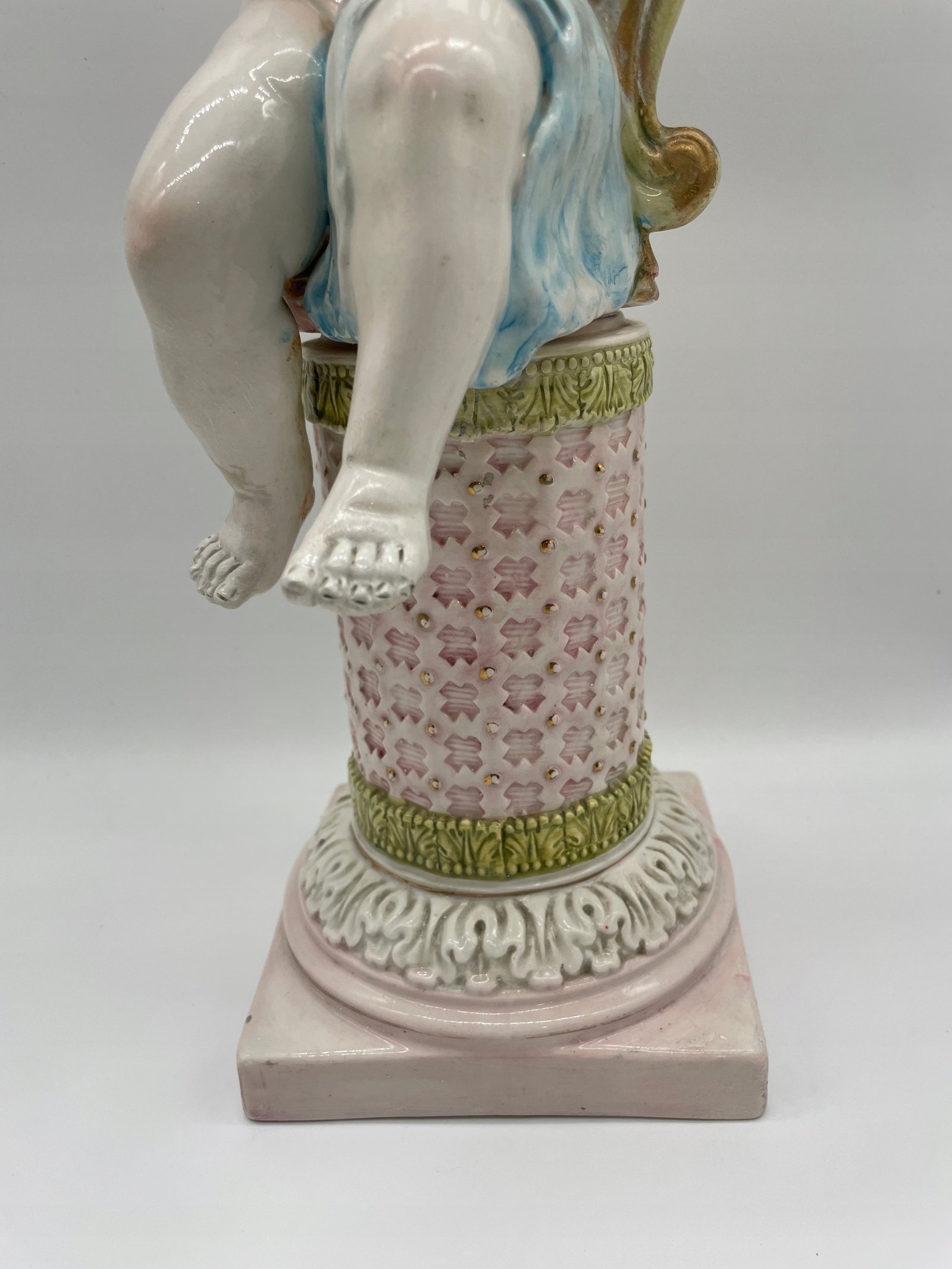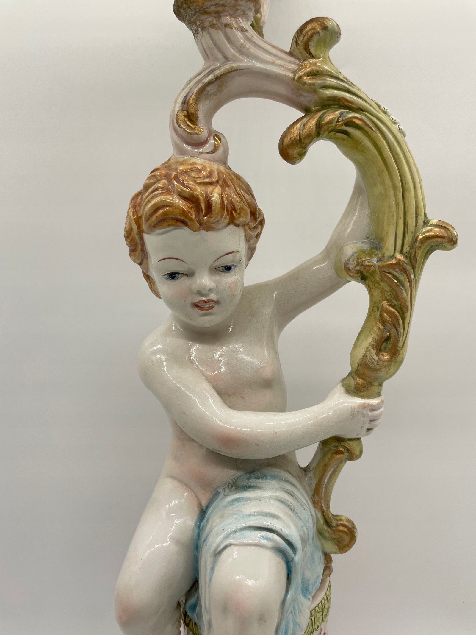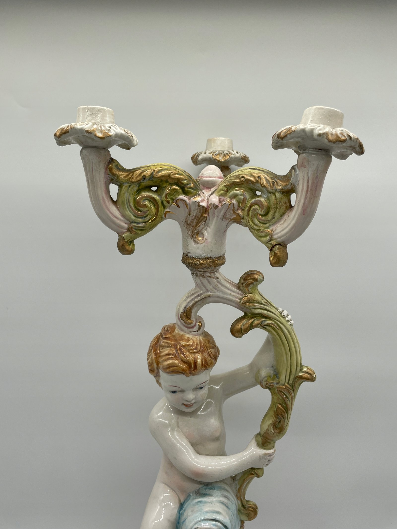 Imponujący duży porcelanowy świecznik trójramienny, ozdobiony dopracowaną figurką chłopca siedzącego na kolumnie i trzymającego ozdobny, złocony element w kształcie łuku. Kompozycję uzupełnia wyrafinowany dekor roślinny oraz staranna malatura w delikatnych pastelowych barwach. Złocone akcenty podkreślają wartość dekoracyjną przedmiotu. Dzięki okazałej wysokości będzie wyrazistym centrum wnętrza i przyciągnie uwagę zarówno w aranżacji klasycznej, jak i romantycznej.