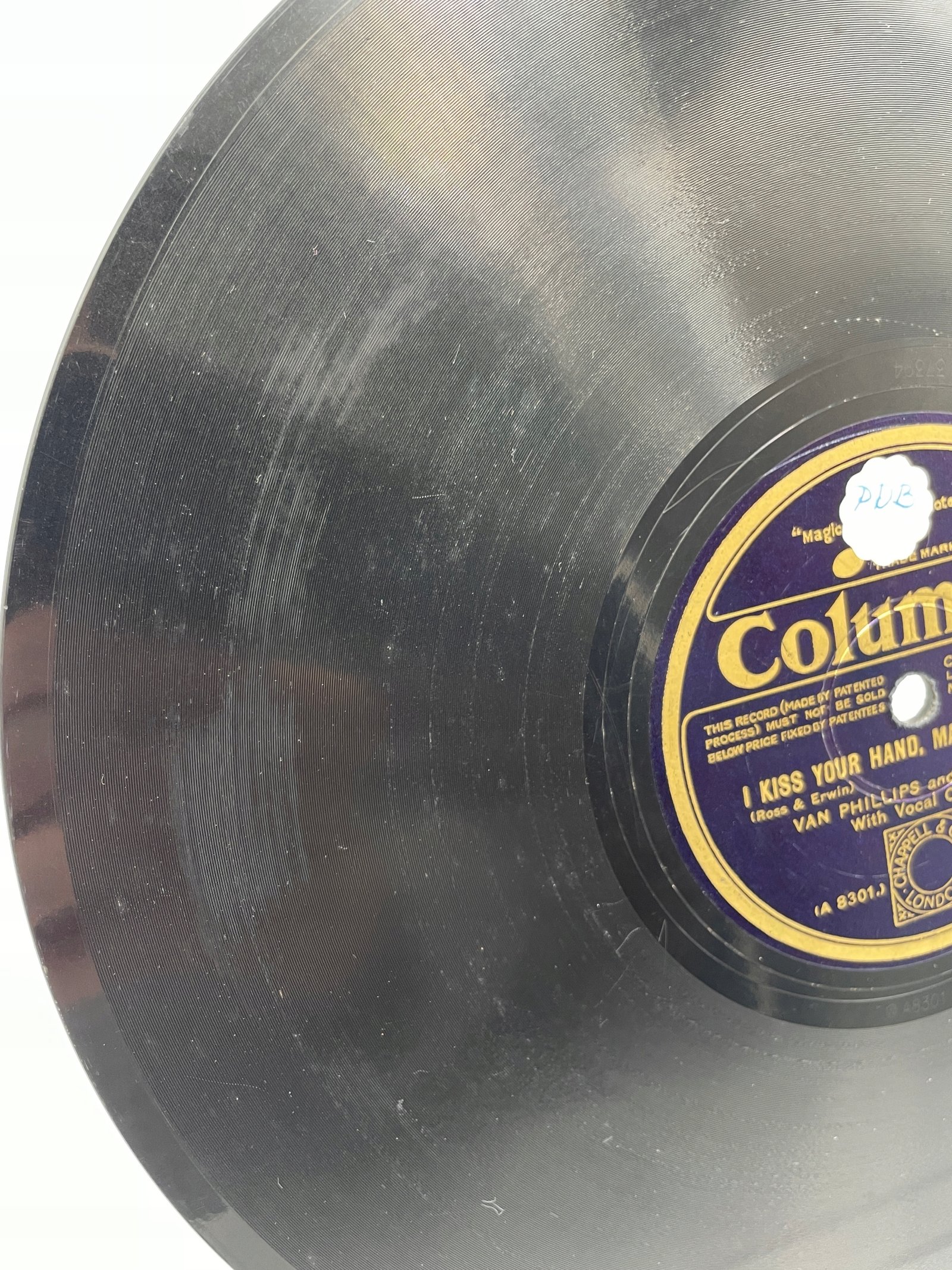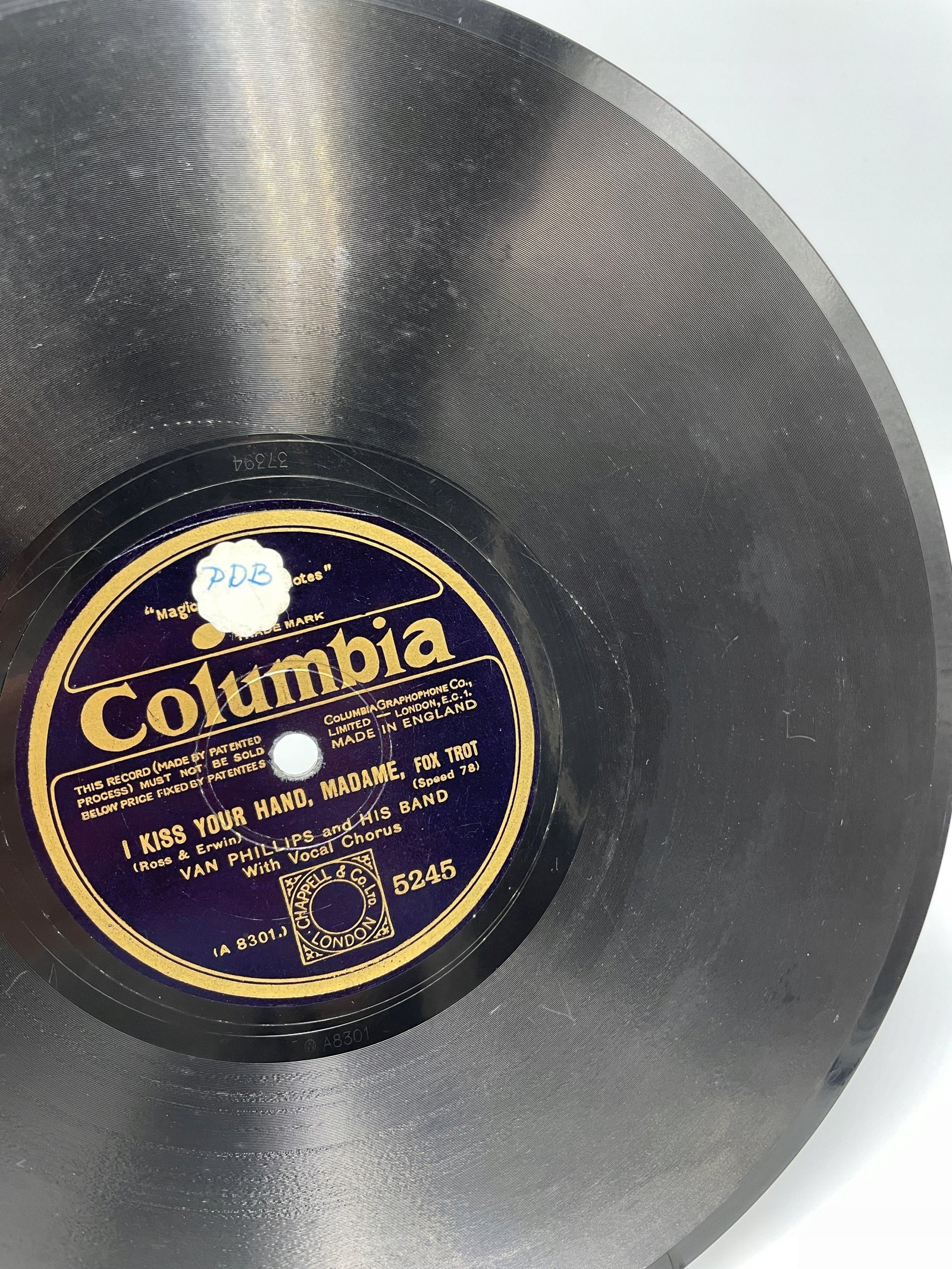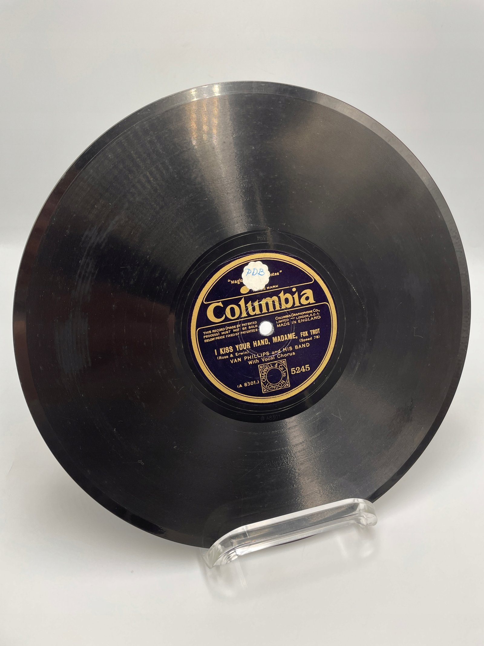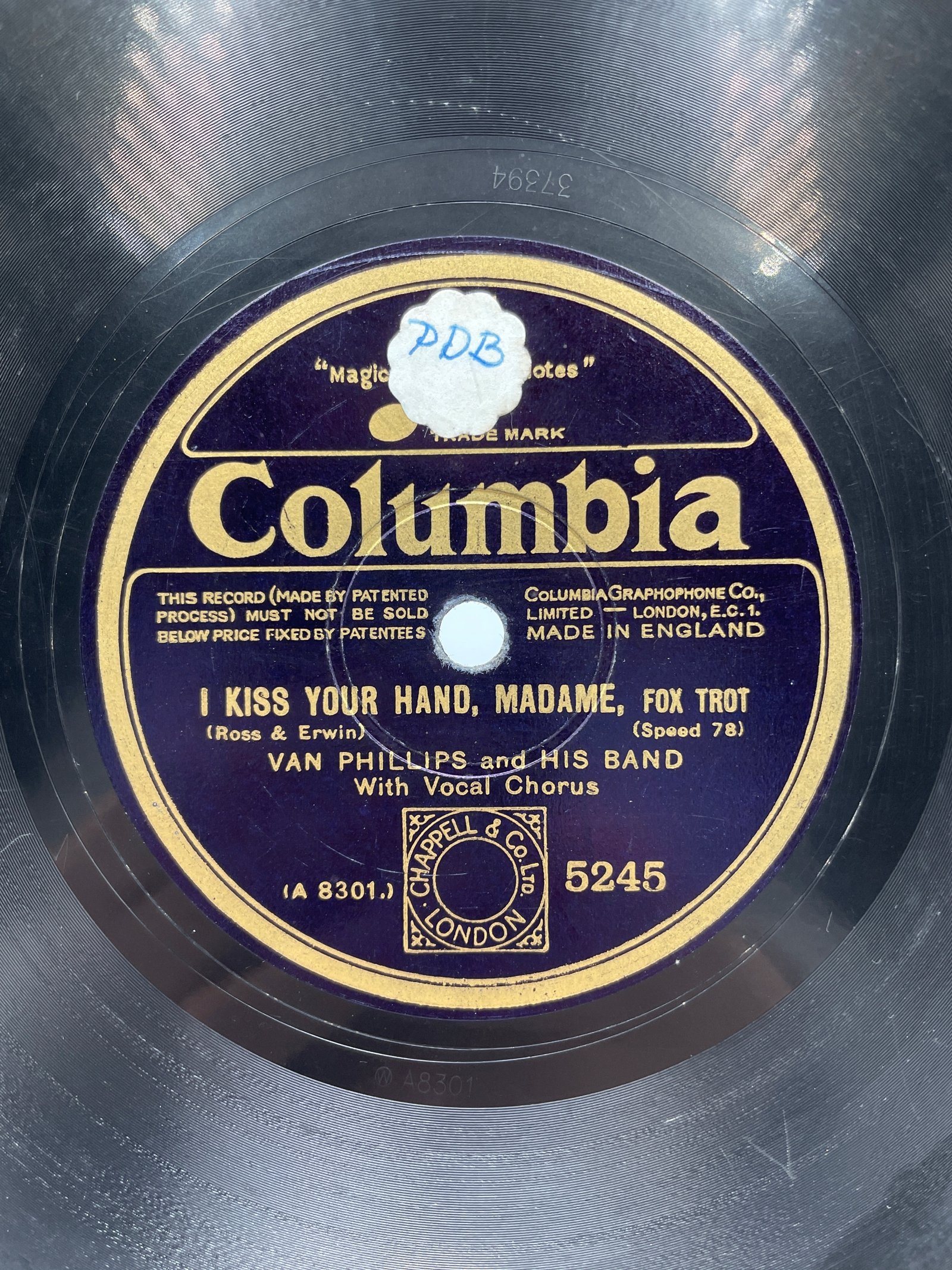 Na tej płycie marki Columbia, wydanej przez Columbia Graphophone Co. Ltd. (Londyn, Anglia), znajduje się utwór „I Kiss Your Hand, Madame” w stylu foxtrot. Kompozytorzy: Ross & Erwin, wykonawcy: Van Phillips and His Band (z chórem wokalnym).